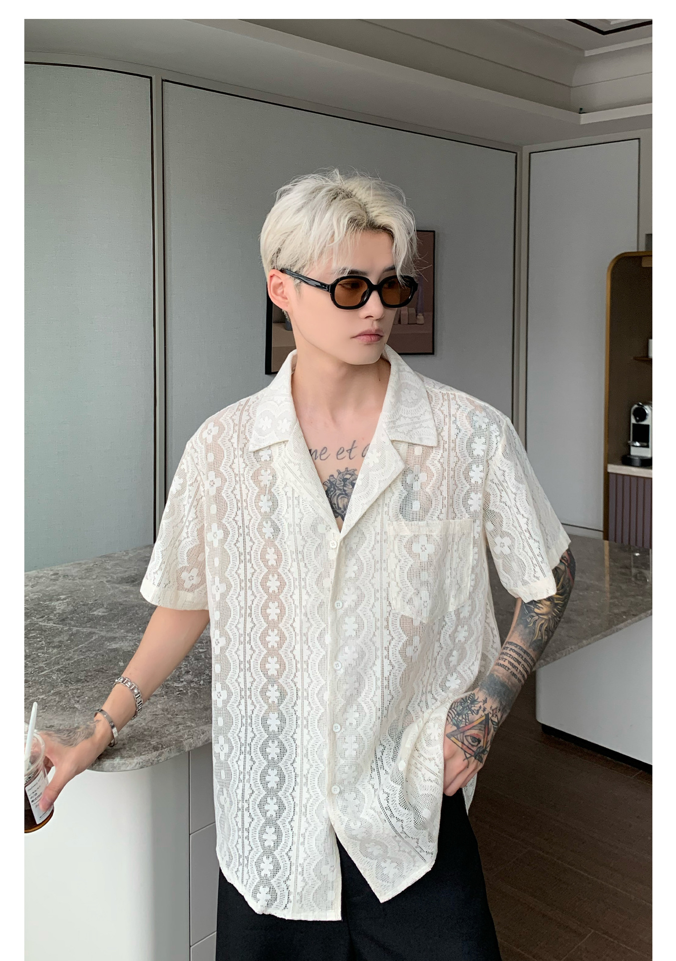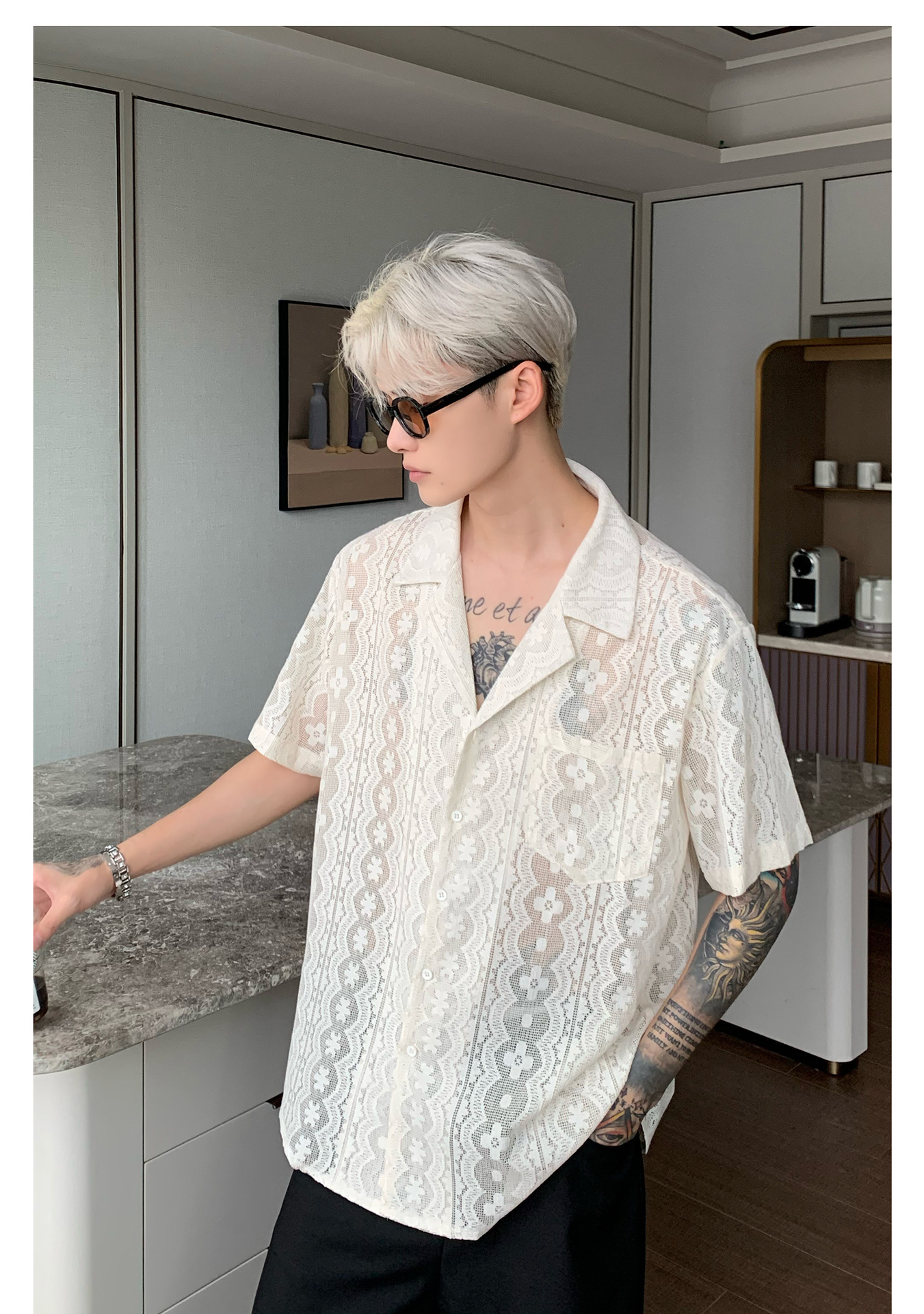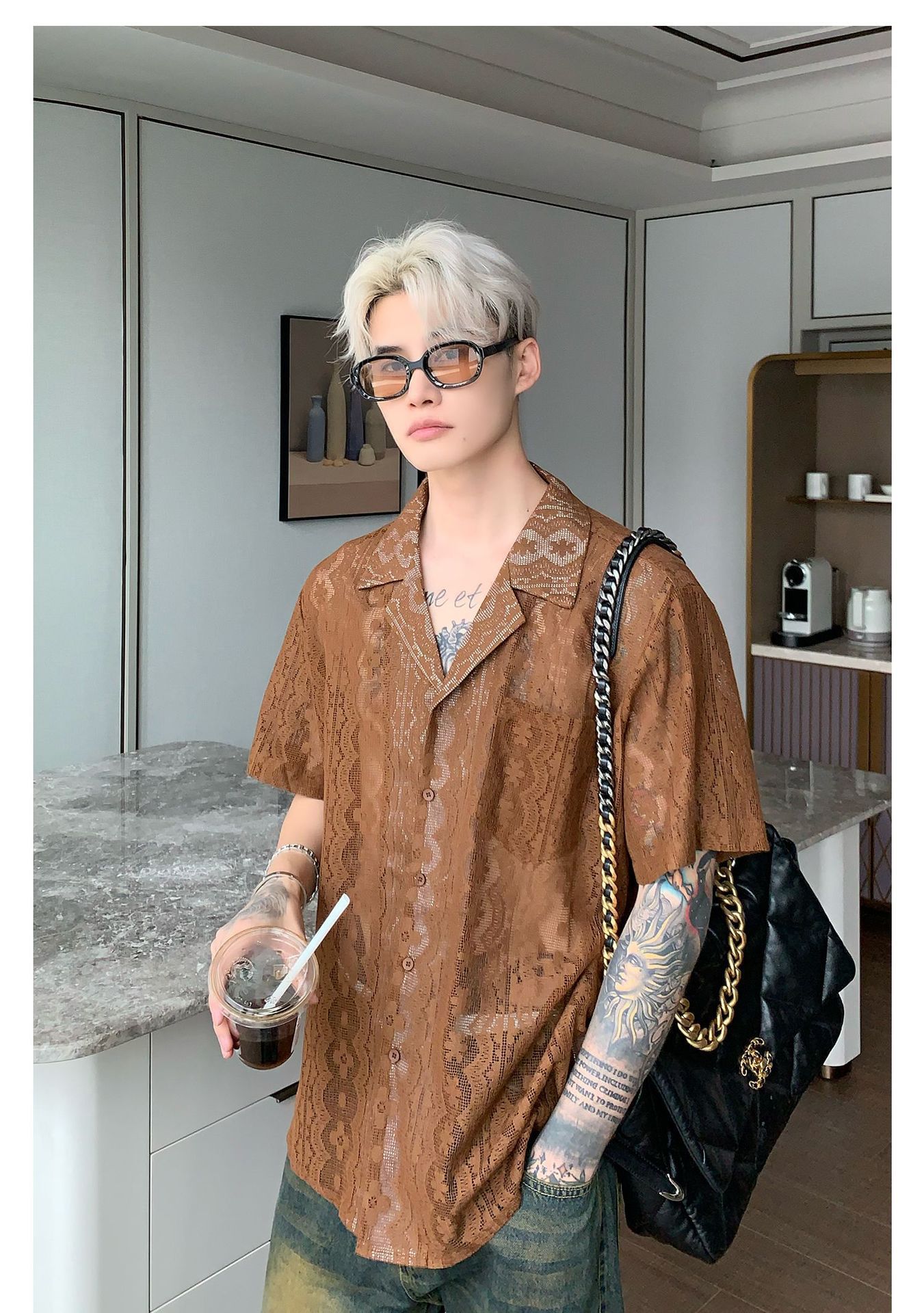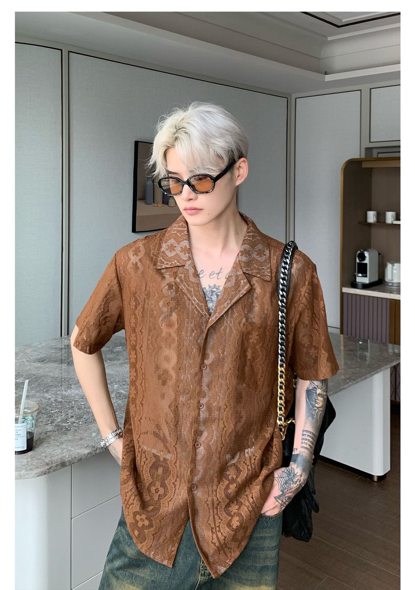 니치 빈티지 자카드 할로우 디자인 반팔 셔츠 남자의 2024 여름 새로운 스타일 게으른 스타일 옷깃 셔츠 트렌디스토어 가기