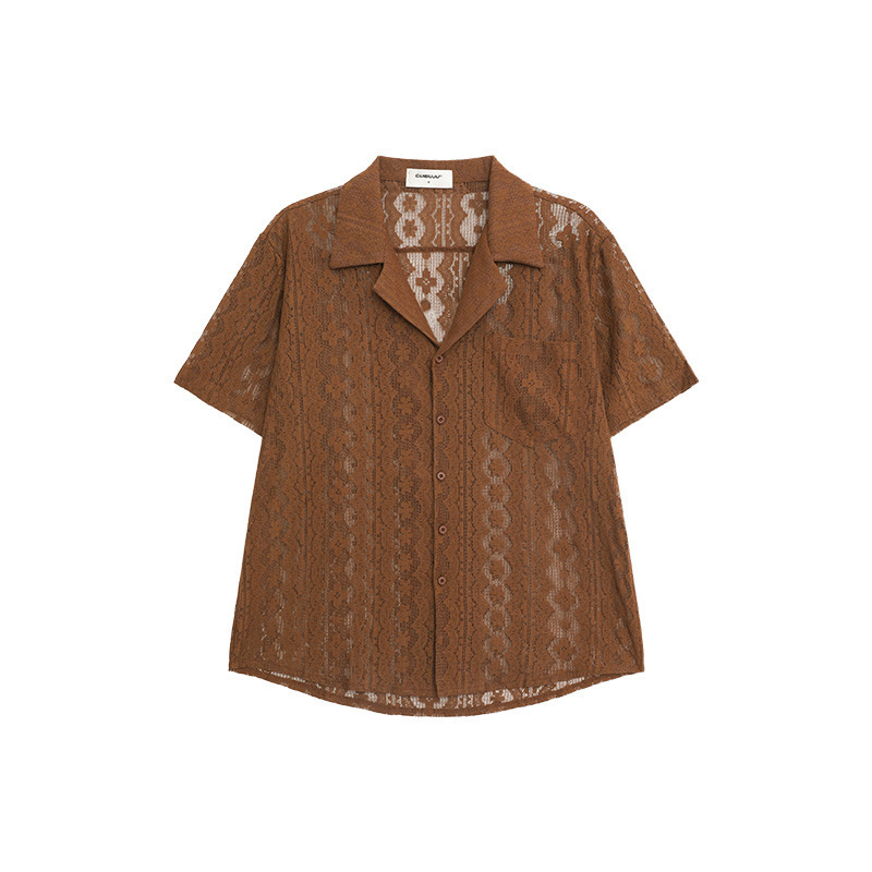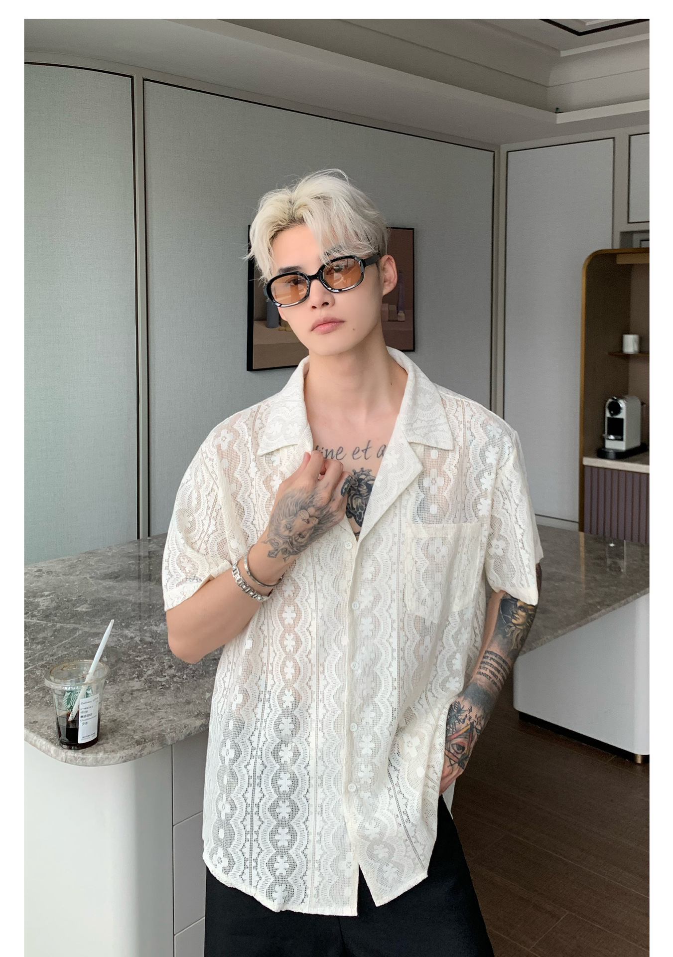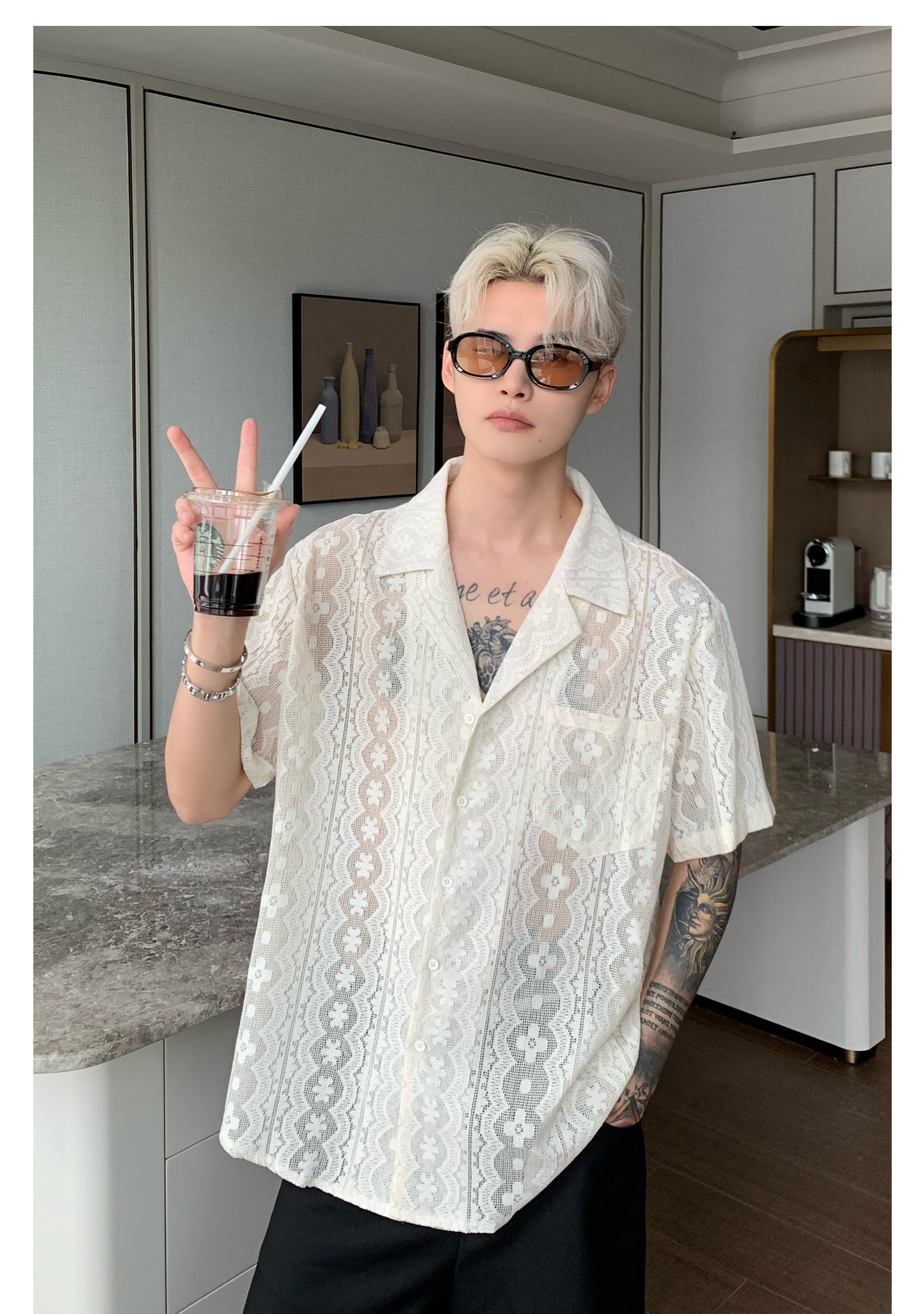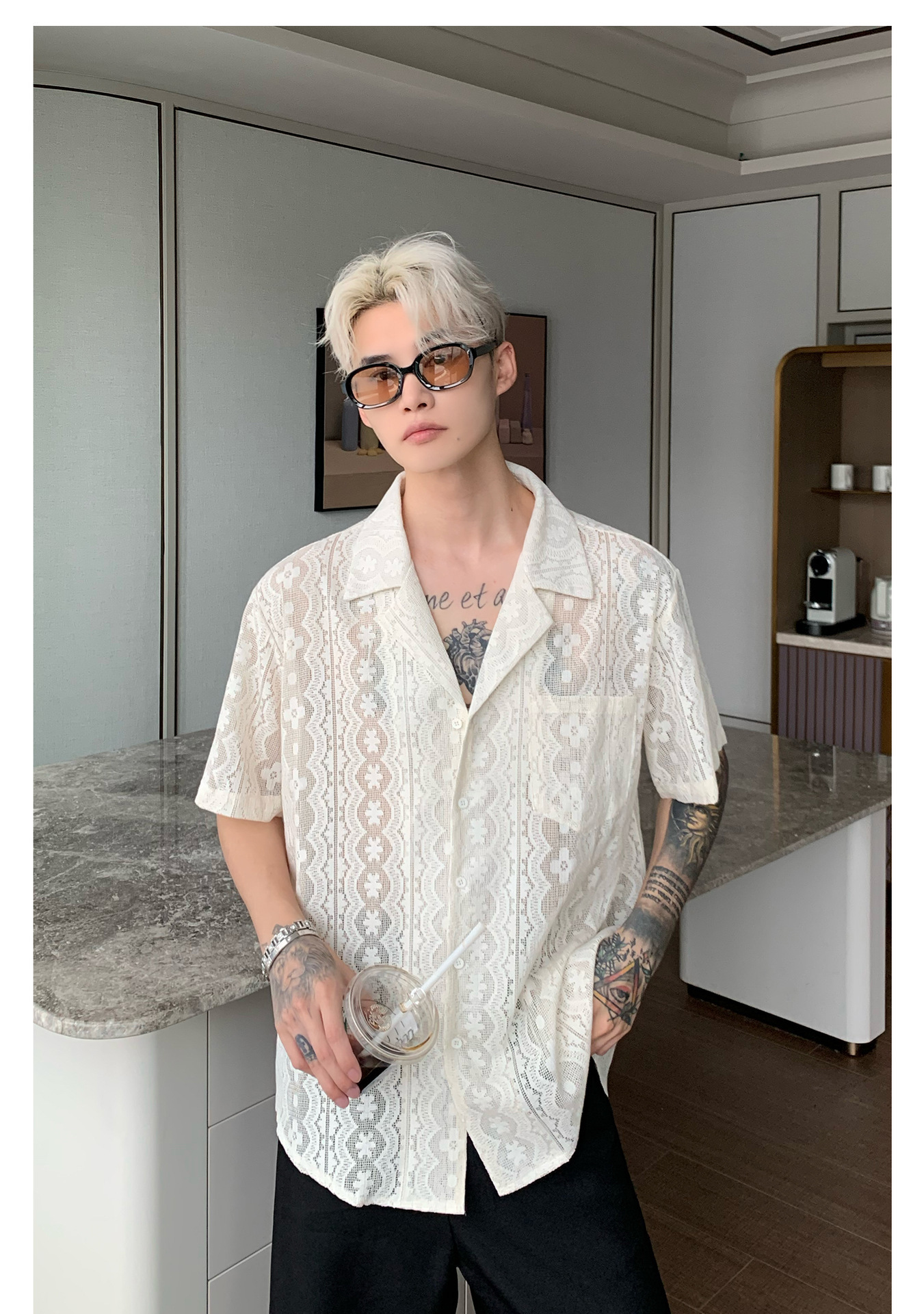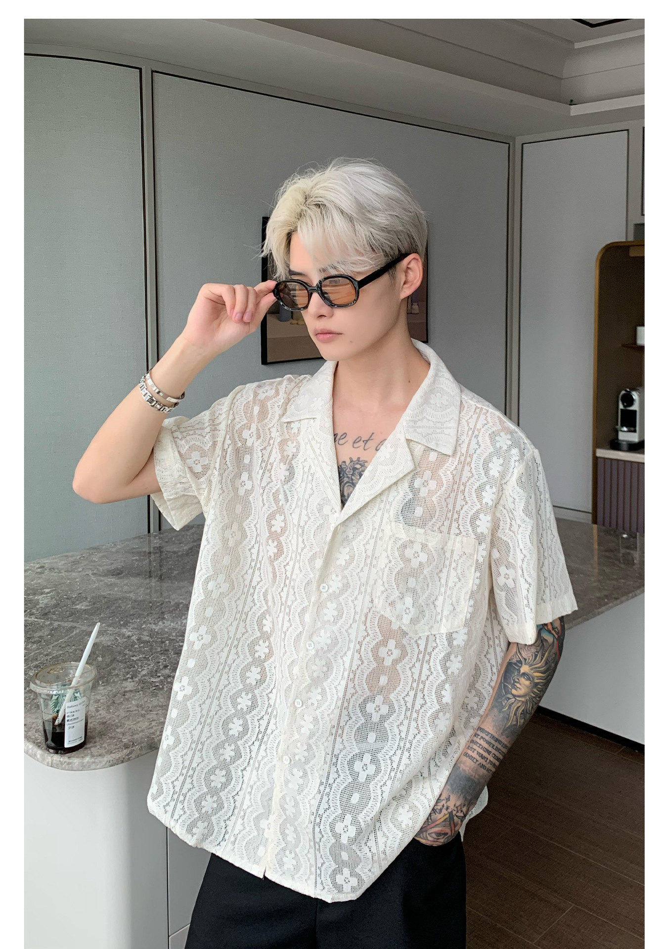 니치 빈티지 자카드 할로우 디자인 반팔 셔츠 남자의 2024 여름 새로운 스타일 게으른 스타일 옷깃 셔츠 트렌디스토어 가기