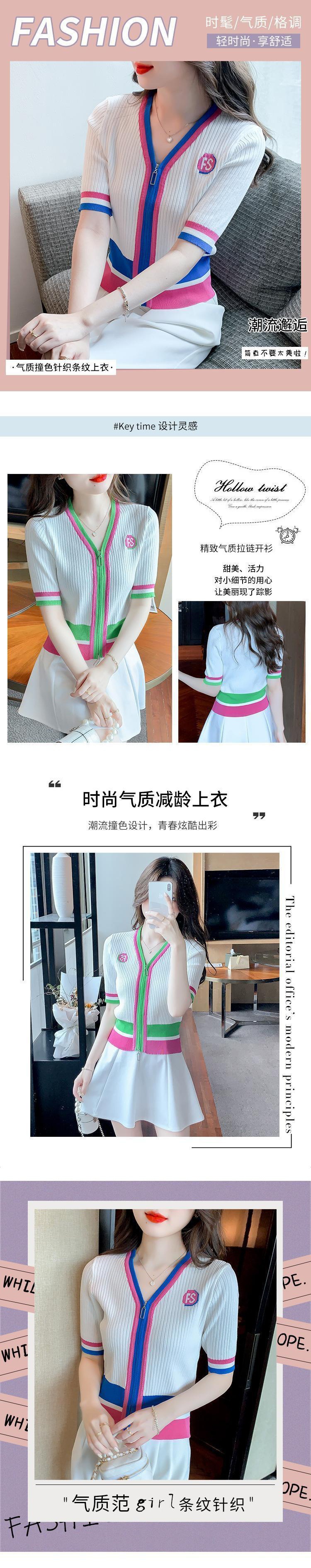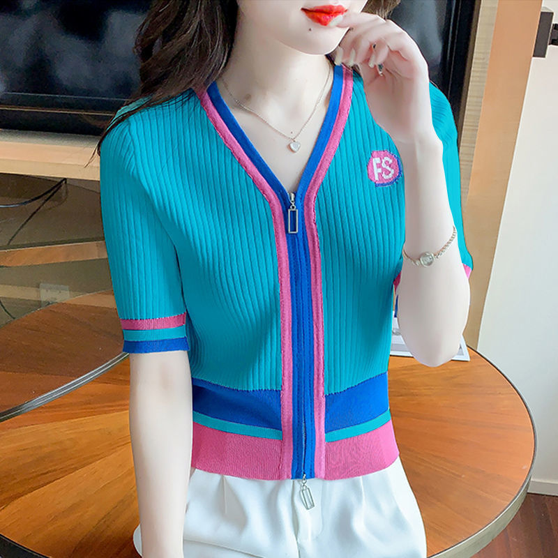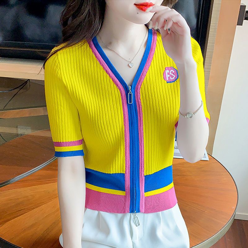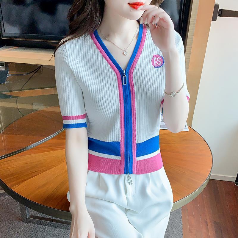 콘트라스트 컬러 얇은 티셔츠 여성용 짧은 소매 2024 새로운 여름 V 넥 지퍼 카디건 슬림 패션 아이스 실크 탑 여성스토어 가기