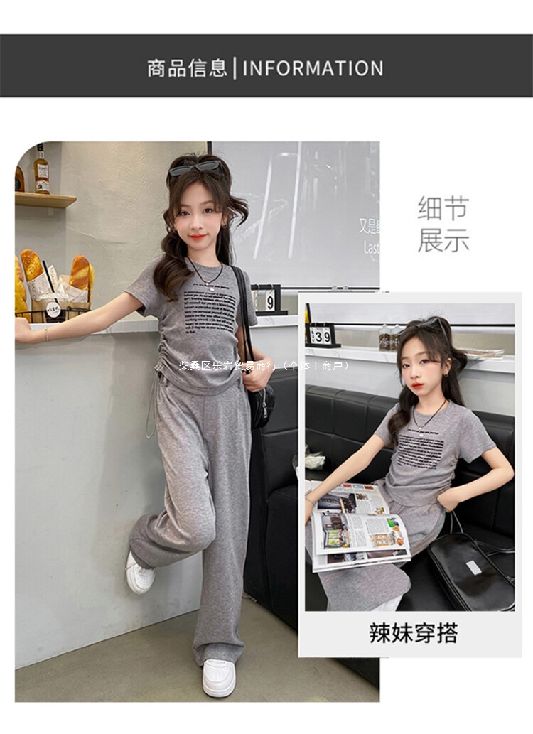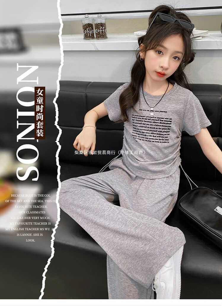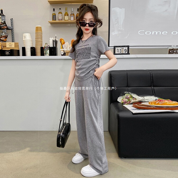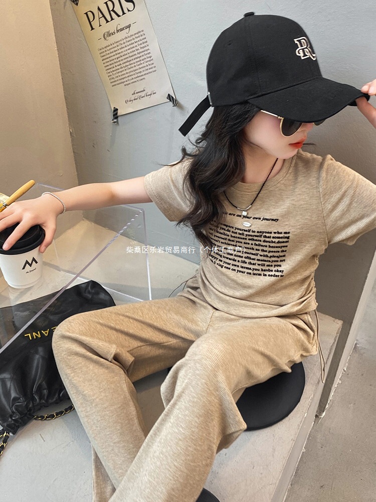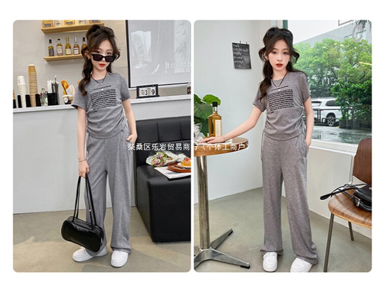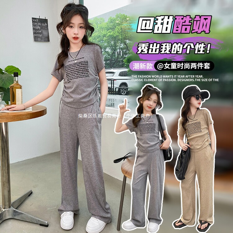 여자 여름 세트 2025 새로운 어린이 반팔 티셔츠 캐주얼 여름 큰 어린이 스포츠 넓은 다리 바지 2 도매스토어 가기