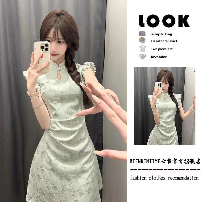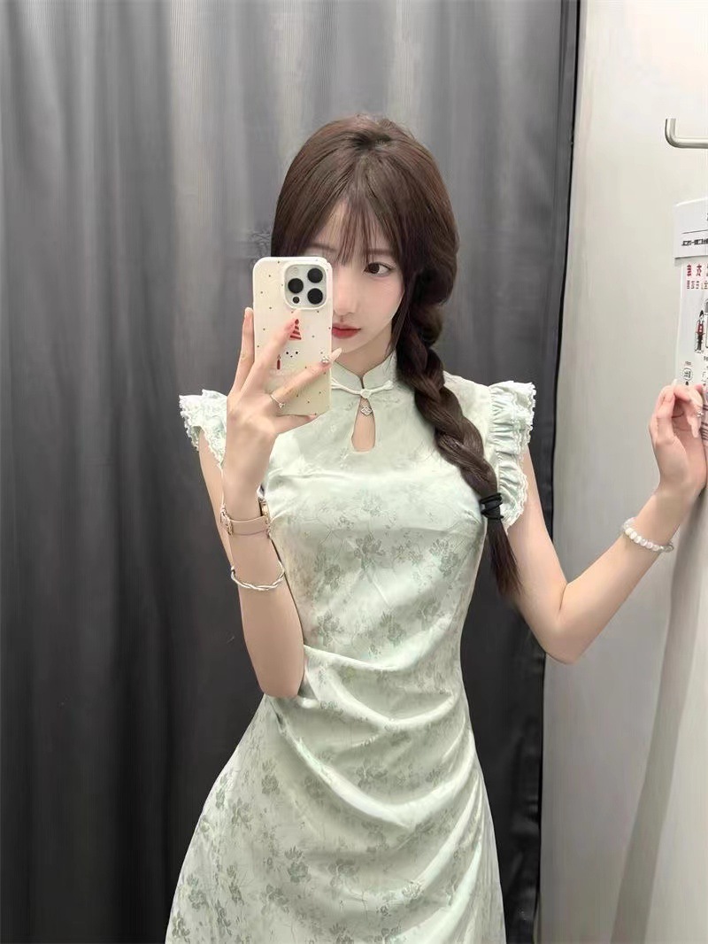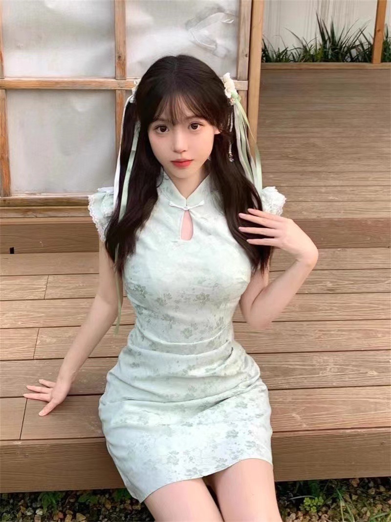 새로운 중국 스타일 원피스 어린이 여름 새로운 개선 된 국가 스타일 청삼 세련 된 단단한 허리와 작은 비행 소매 녹색 짧은 치마스토어 가기