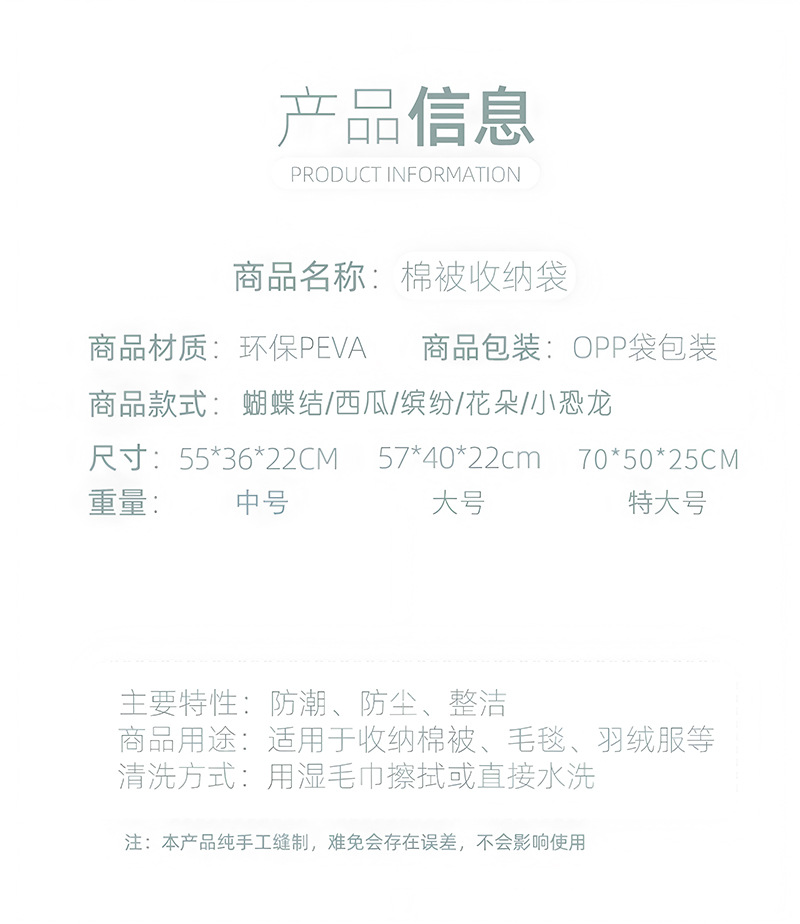 PEVA收纳袋,采用防水面料,防潮防霉防虫蛀,不用担心衣物受潮发霉,脏污可水洗;高克重高密度,防尘效果比一般无纺布要好,主要我们是以生产衣服防尘一类产品为主,我们货源充足买家大可不用担心缺货问题!量大优惠联系客服