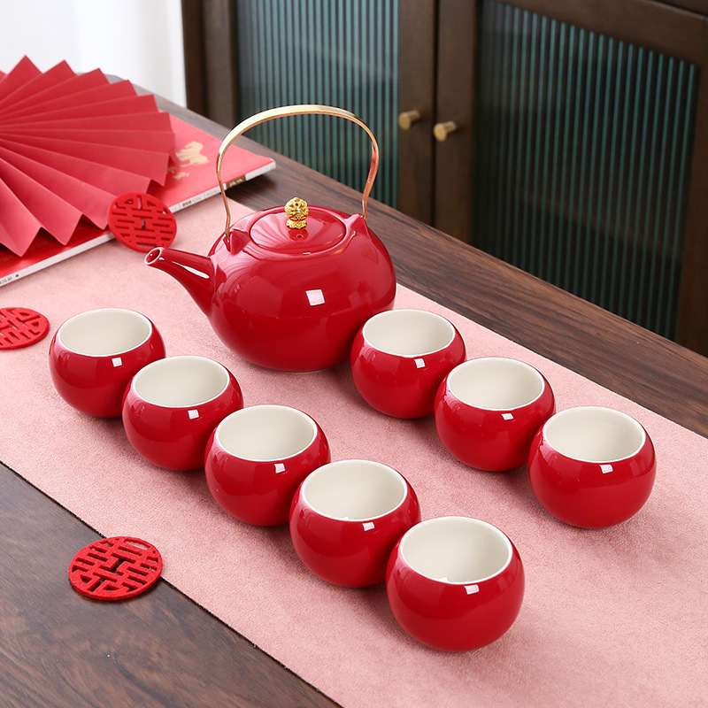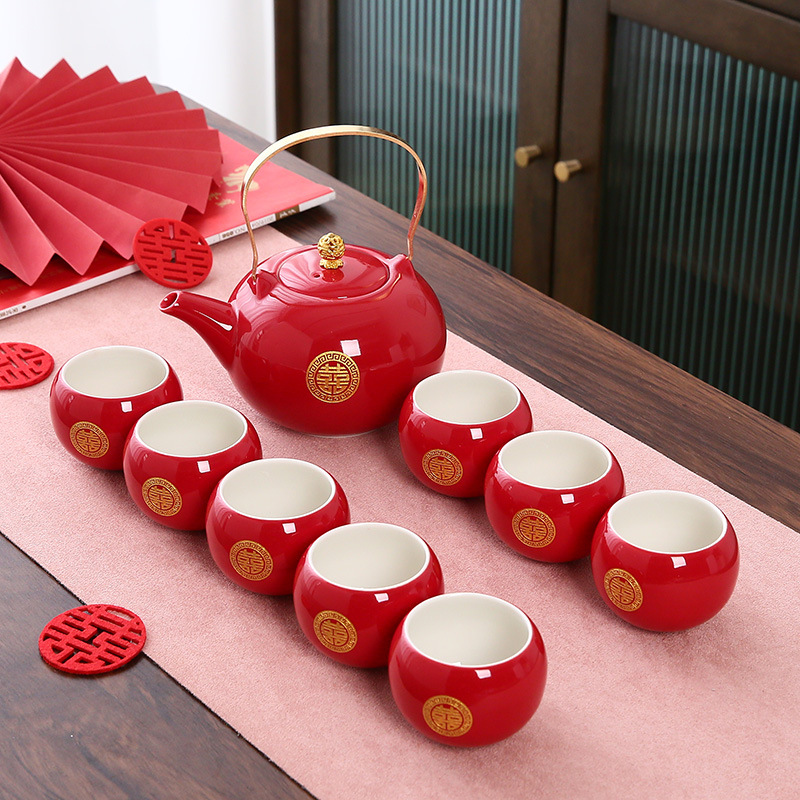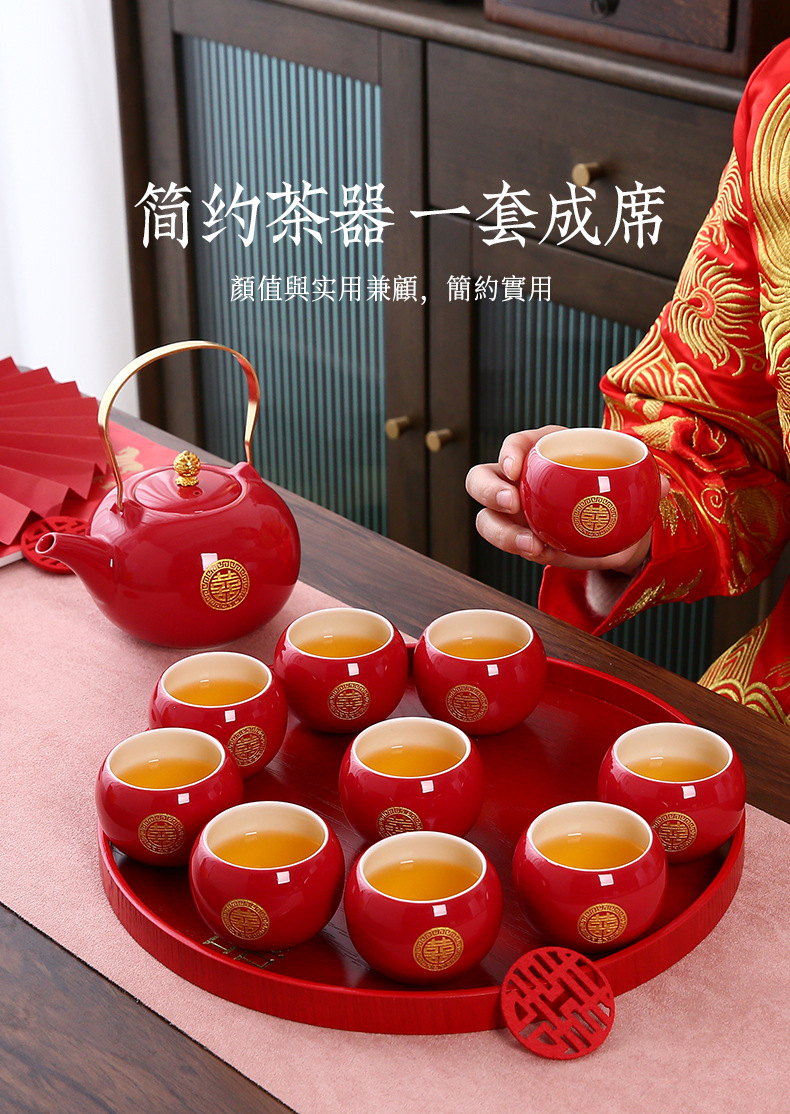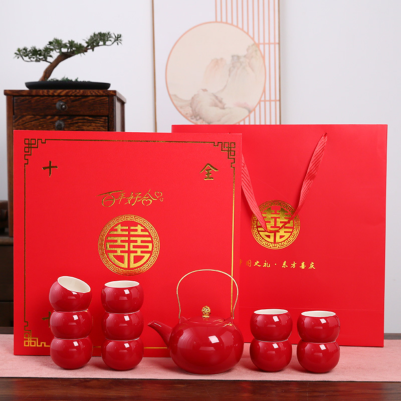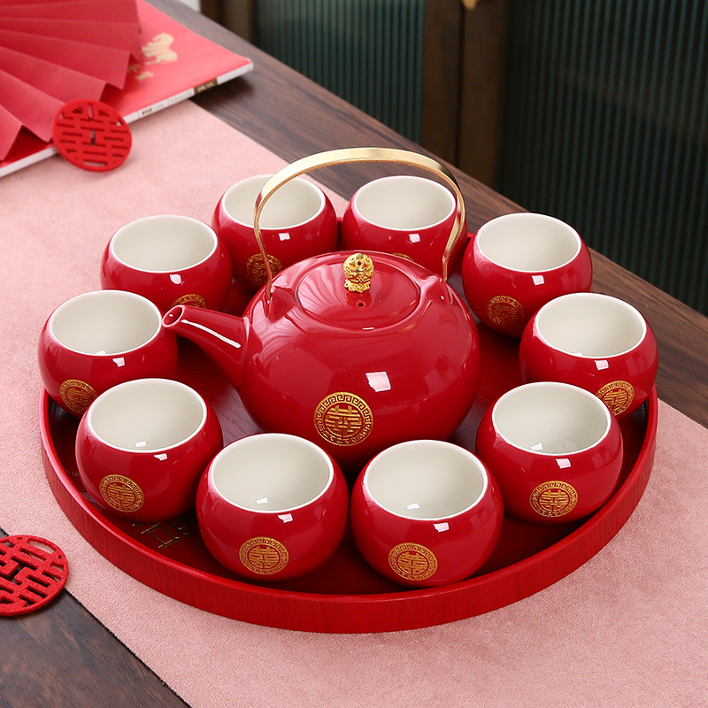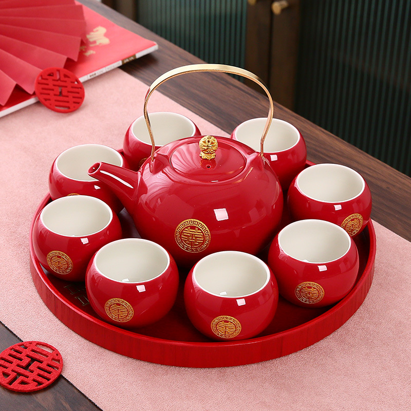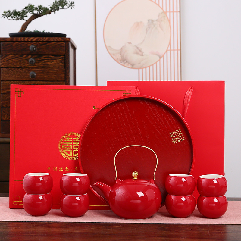 웨딩 웨딩 변경 찻잔 중국 약혼 용품 트레이 주전자 차 세트 세트 선물 상자를 동반하는 빨간 신부