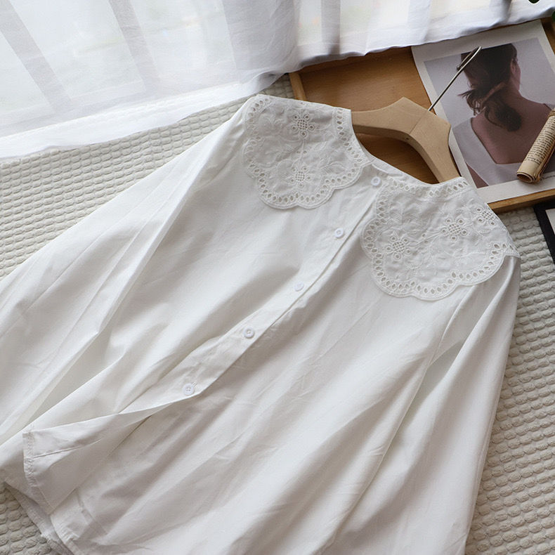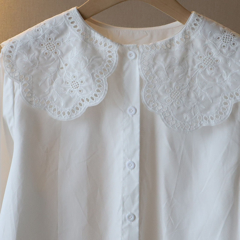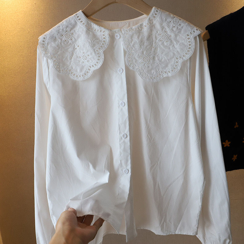 여성 의류 라벨 절단 카운터 철수 대외 무역 봄과 가을 서양식 흰색 셔츠 여성 인형 칼라 긴 소매 셔츠