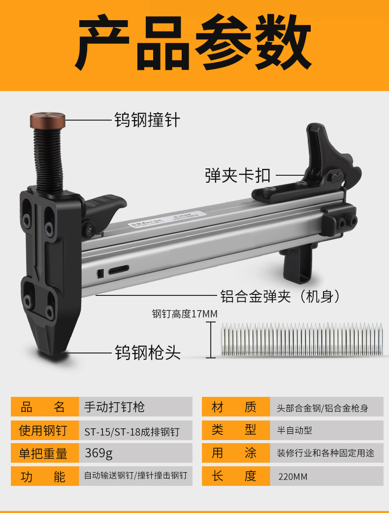 • ST18 반자동 못총 + 못 18개들이 상자 2개 + 예비 발사 핀