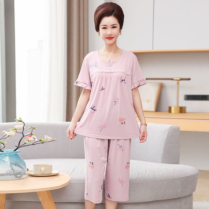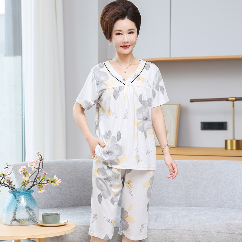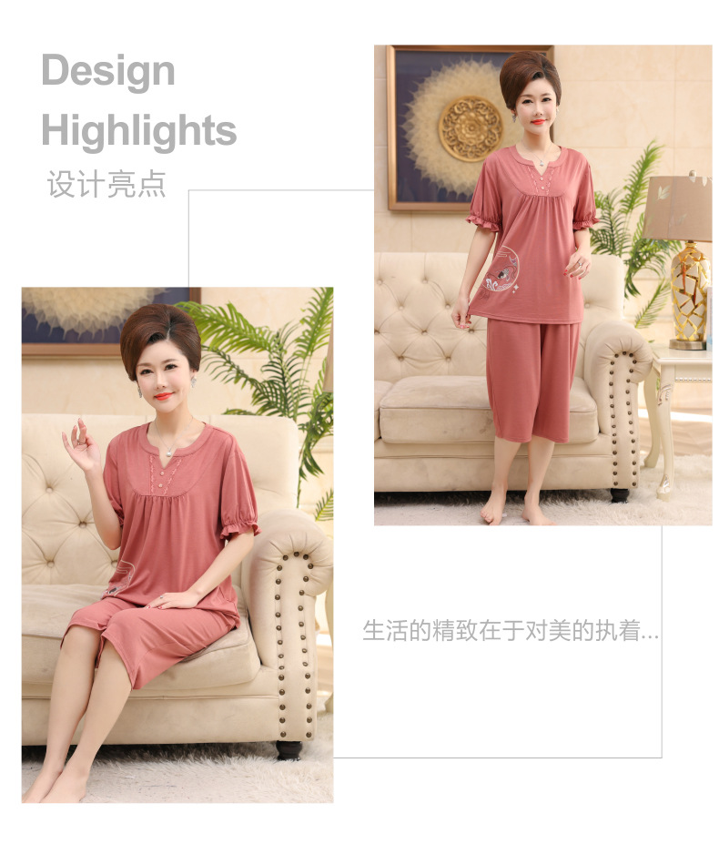 여름 모달 파자마 여성 반팔 카프리 바지 중년 어머니 풀오버 느슨한 세트 얇은 가정 옷스토어 가기