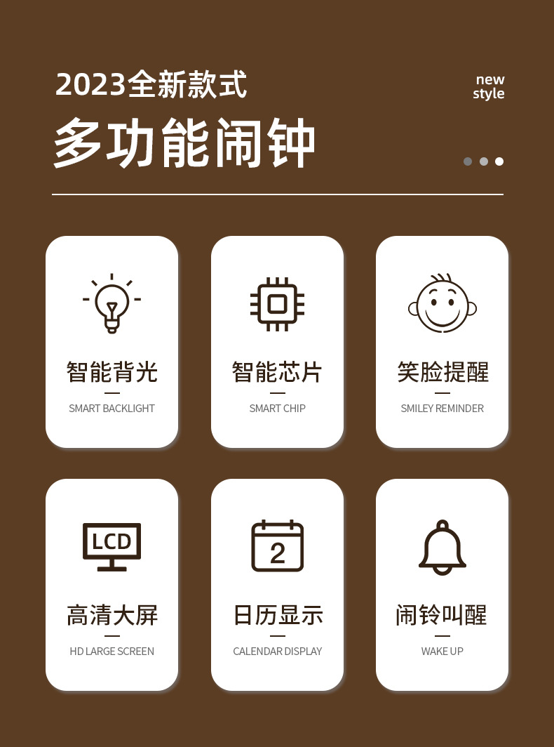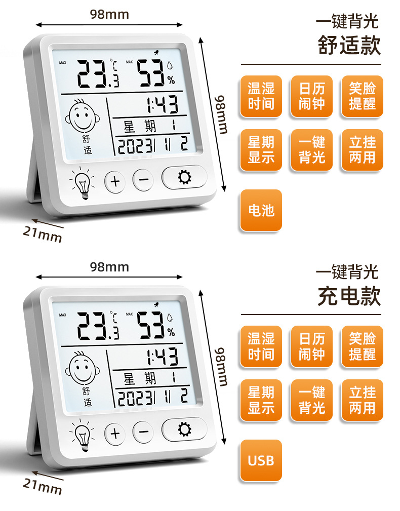 • [스마트 충전 모델] 알람시계 기능/체성감각 디스플레이 + 원버튼 백라이트 + 걸거나 세울 수 있음 + 퍼페추얼 캘린더 + 무료 USB 충전 케이블