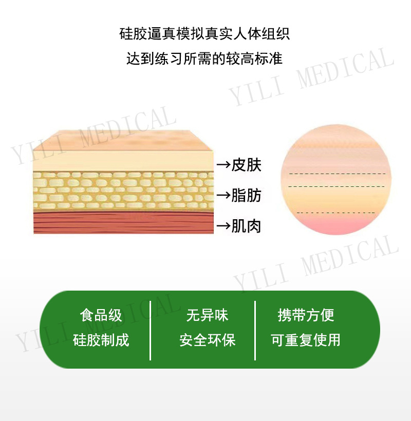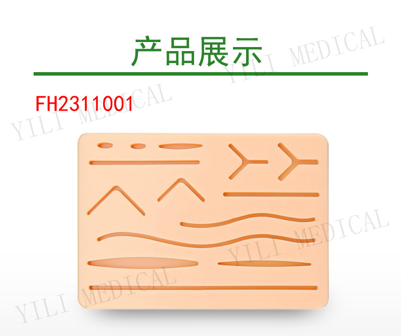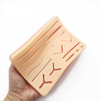 硅胶缝合训练适用于练习者练习外科切割、缝合和打结技术。满足您不同的练习需求。这是新型的缝合练习模块。仿真的皮肤质感,3层结构(皮肤//脂肪/肌肉)让操作和携带更方便。含有复合材料使劲拉扯打结线时不会出现硅胶断裂的情况。使用时您可以根据需要添加各种伤口进行模拟切割缝合练习。产品可以多次使用。