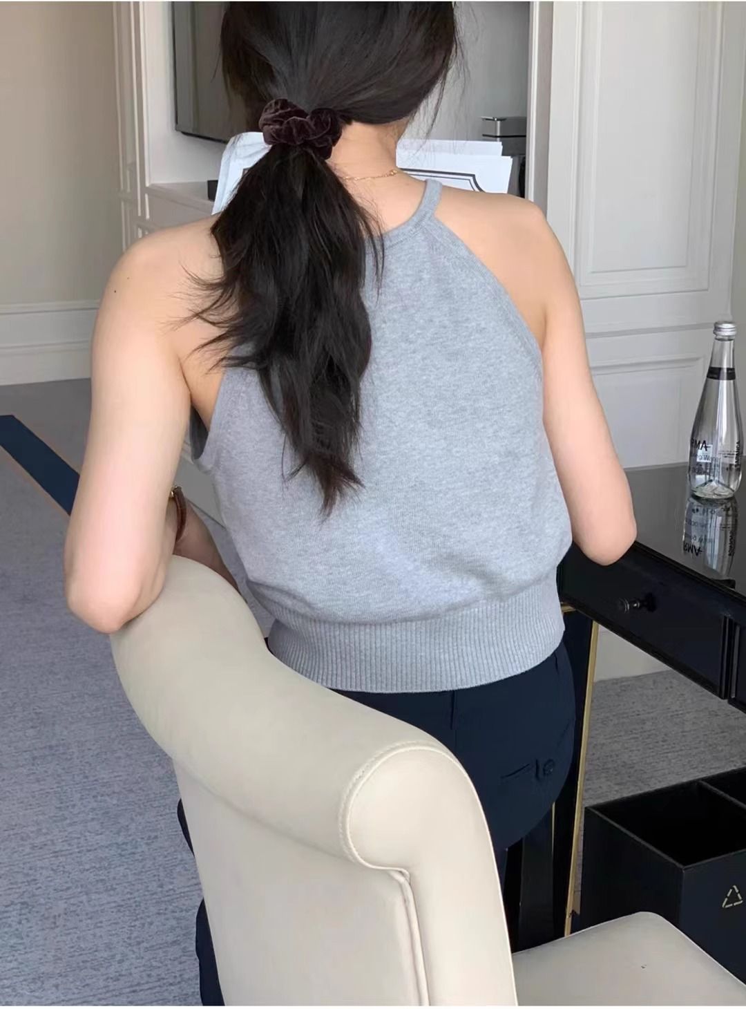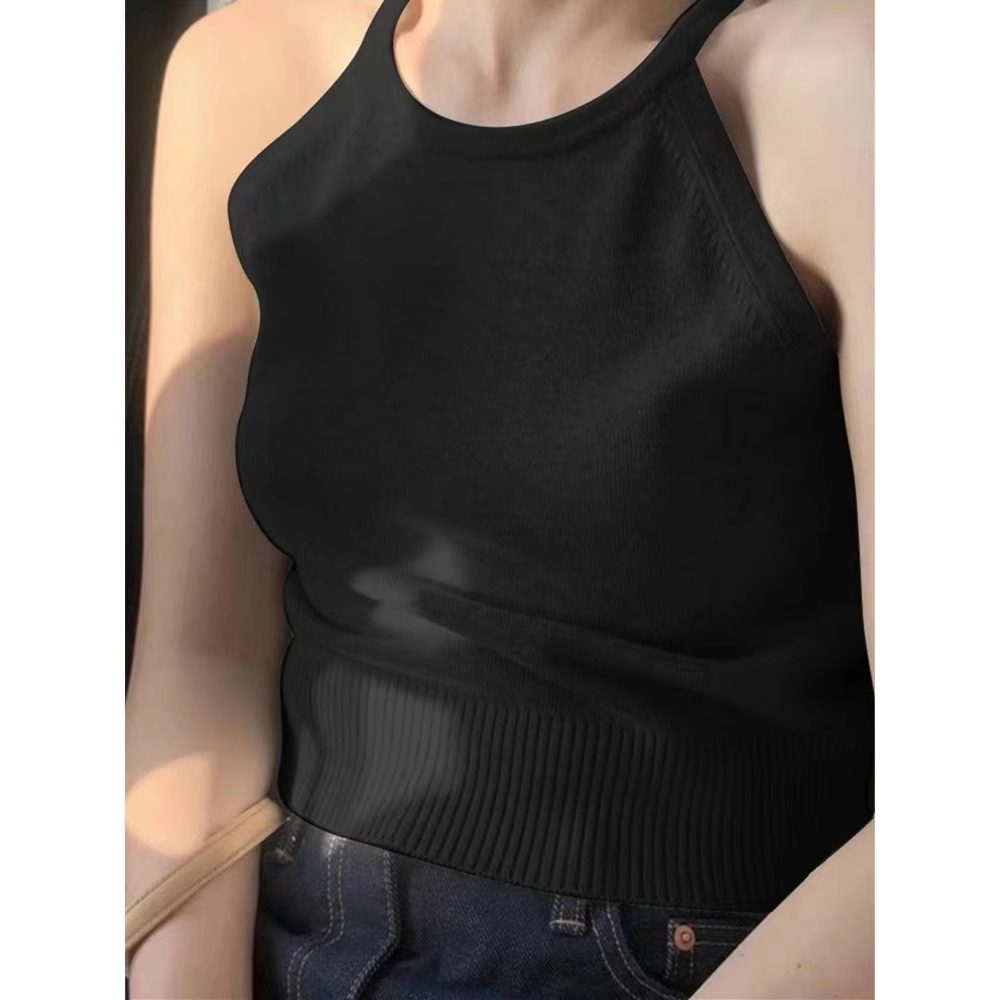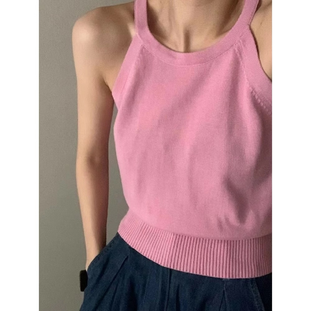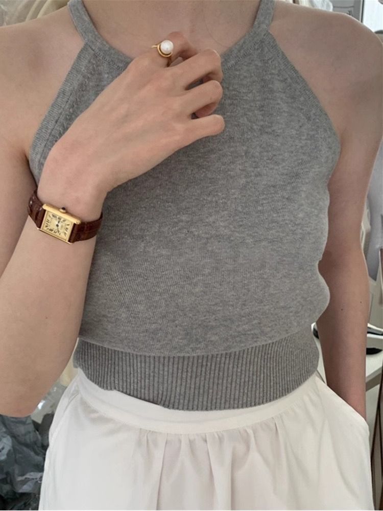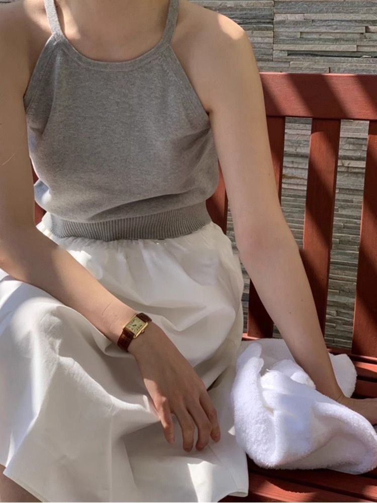 여름 하이 엔드 순수한 욕망 스타일 교수형 목 니트 슬링 디자인 센스 틈새 의상 어깨 탑 그레이 조끼스토어 가기