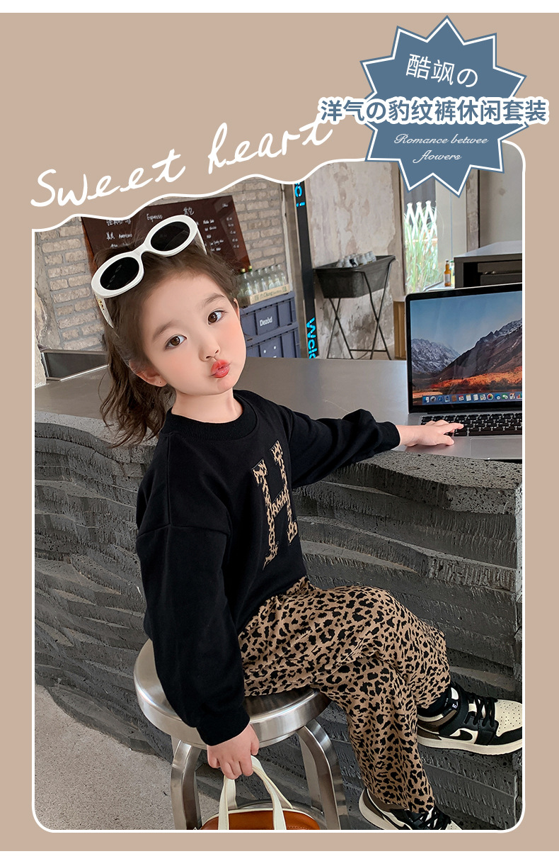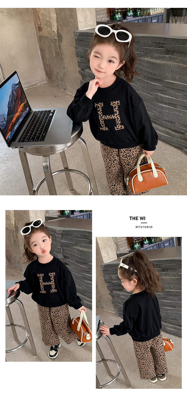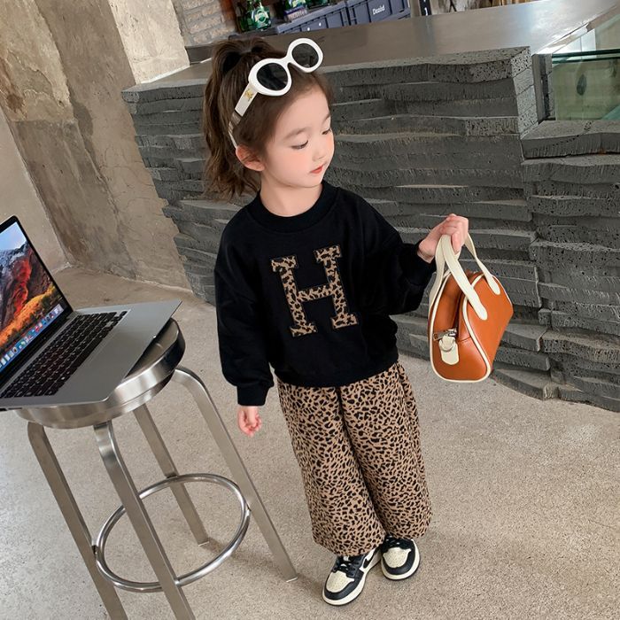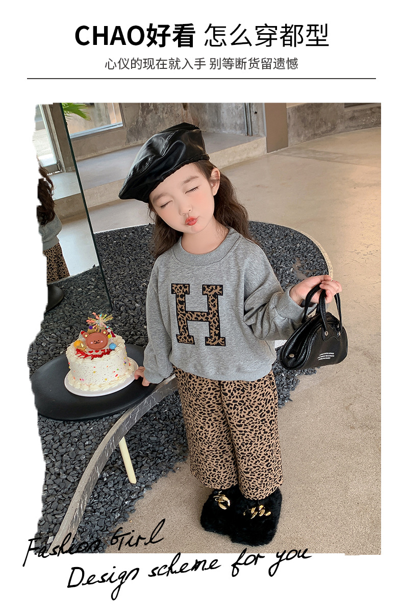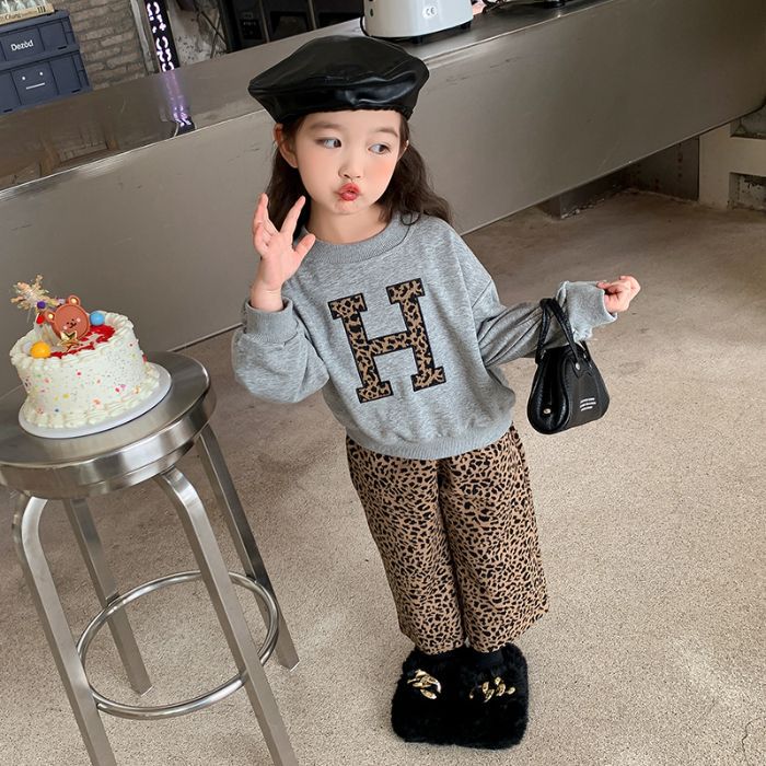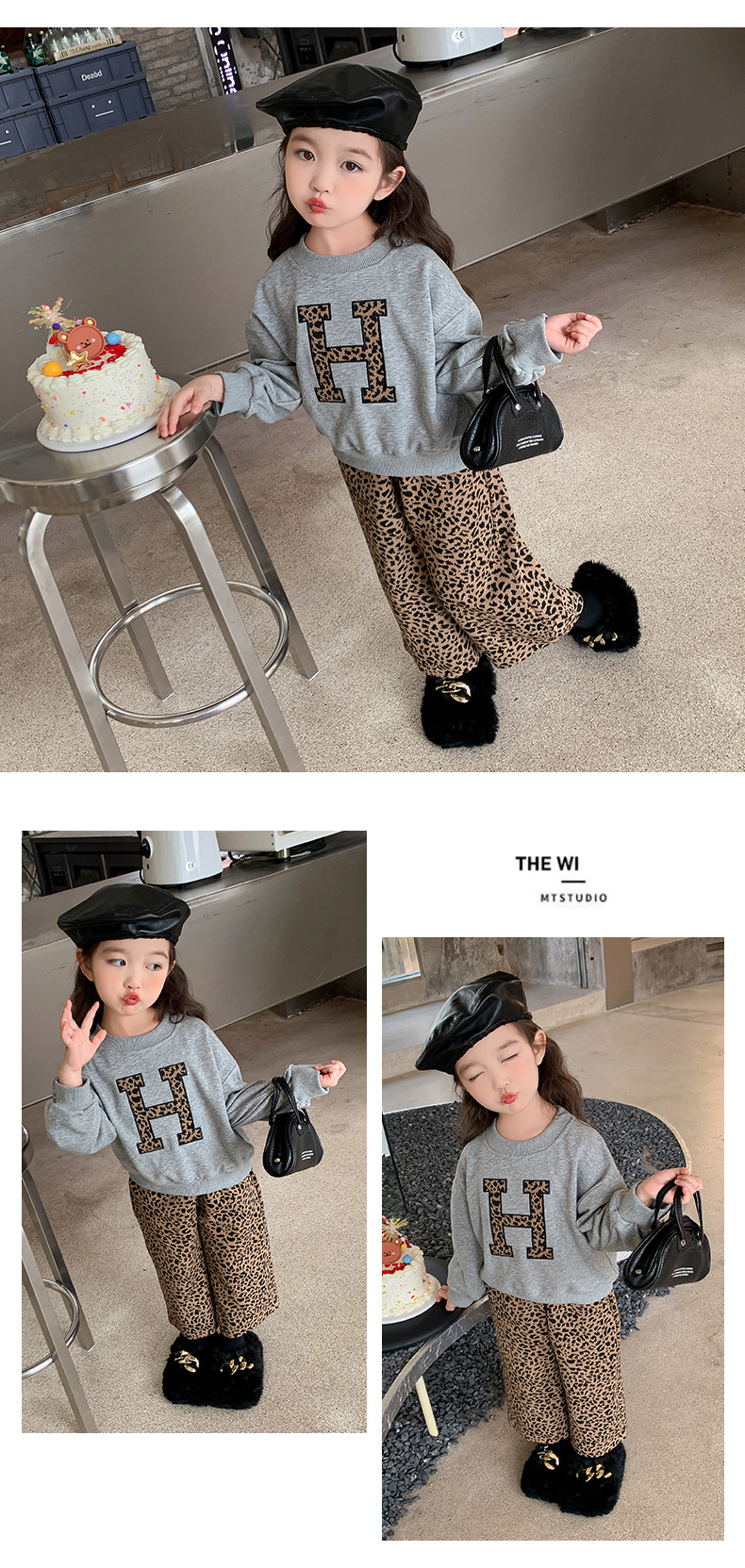 봄과 가을 새로운 여성 패션 세련된 코튼 스웨터 어린이 레오파드 와이드 레그 팬츠 세트 소녀의 세련된 쿨 투피스 세트