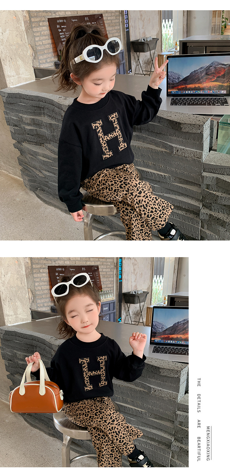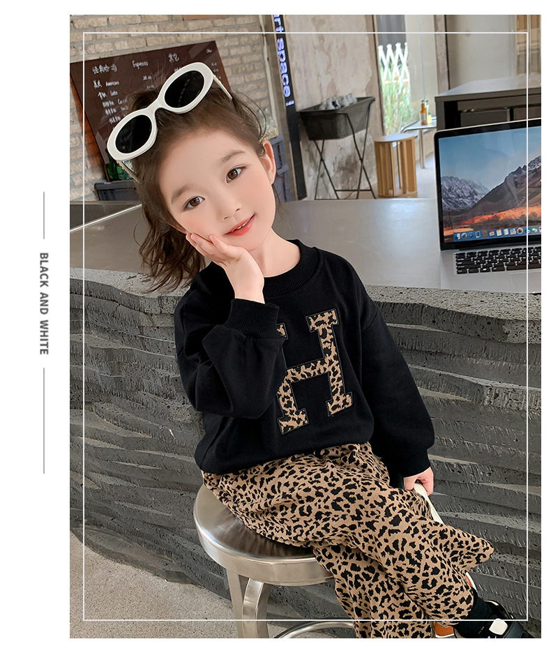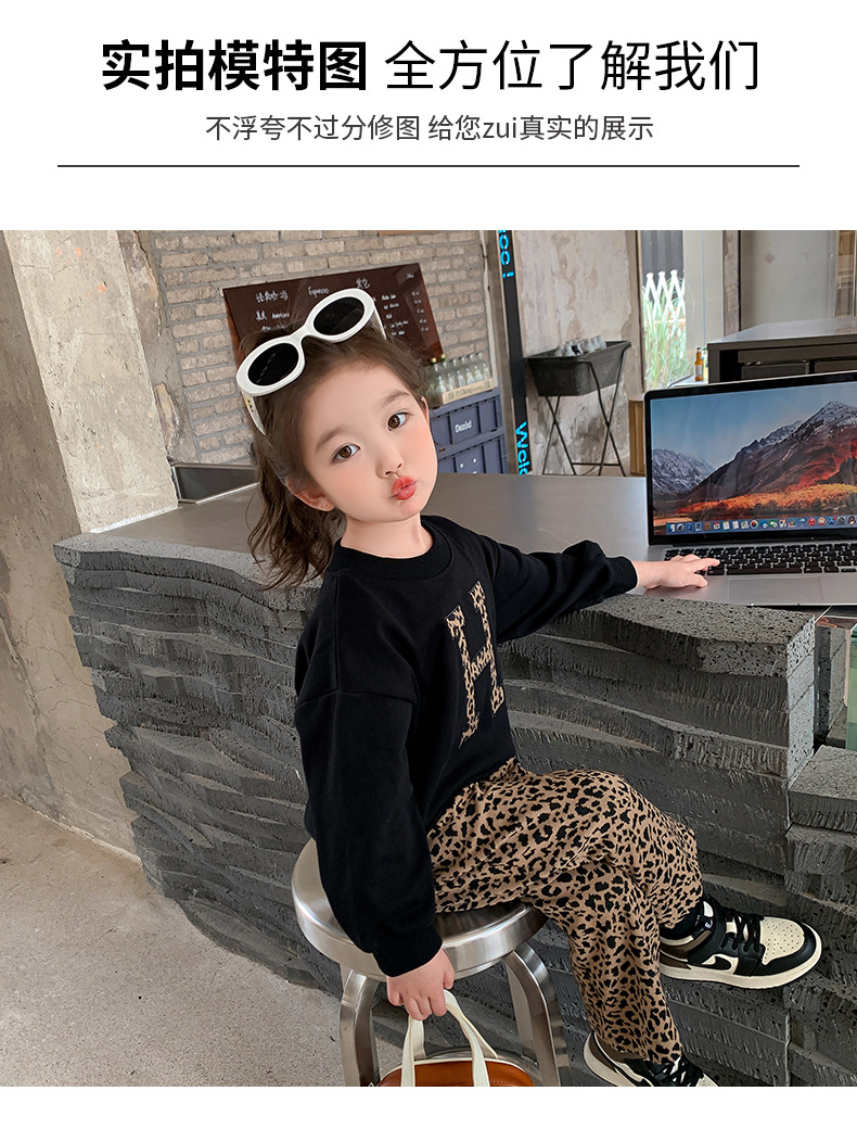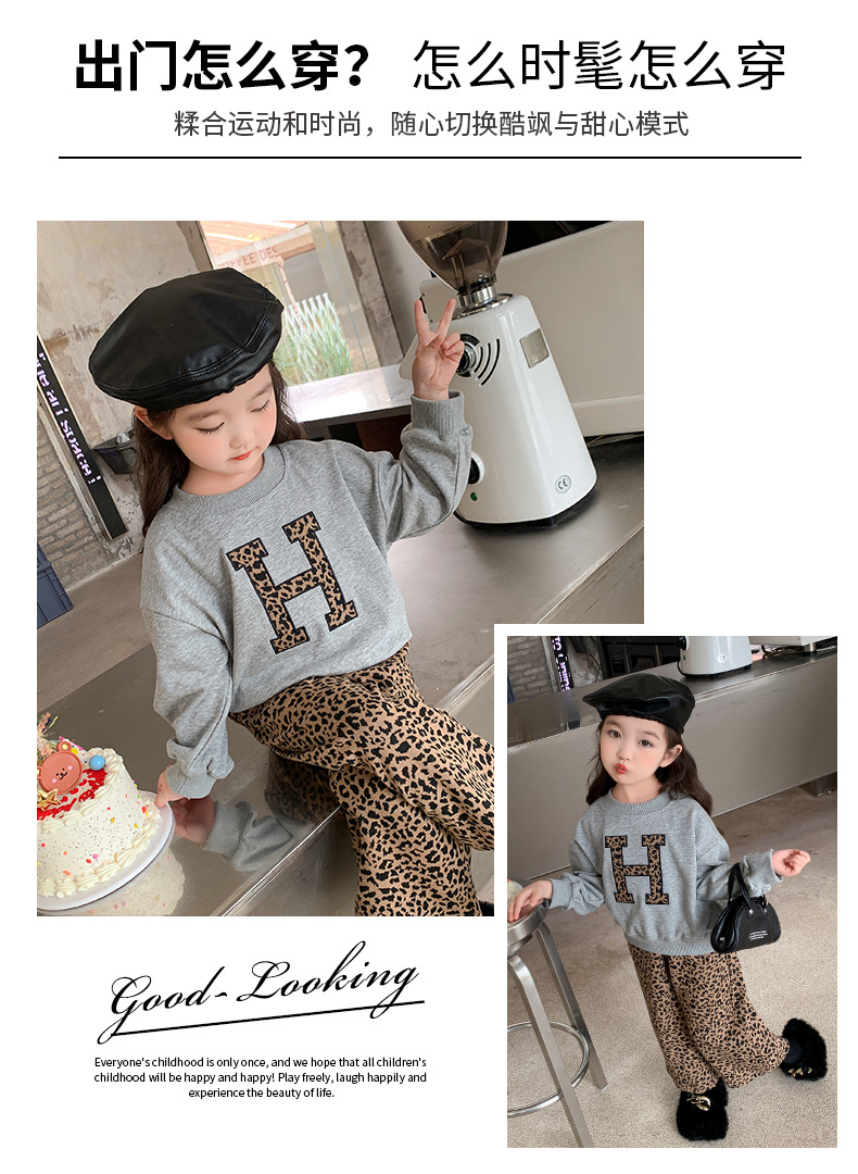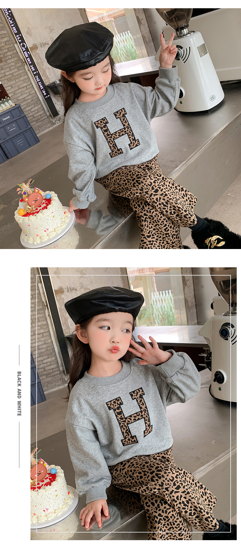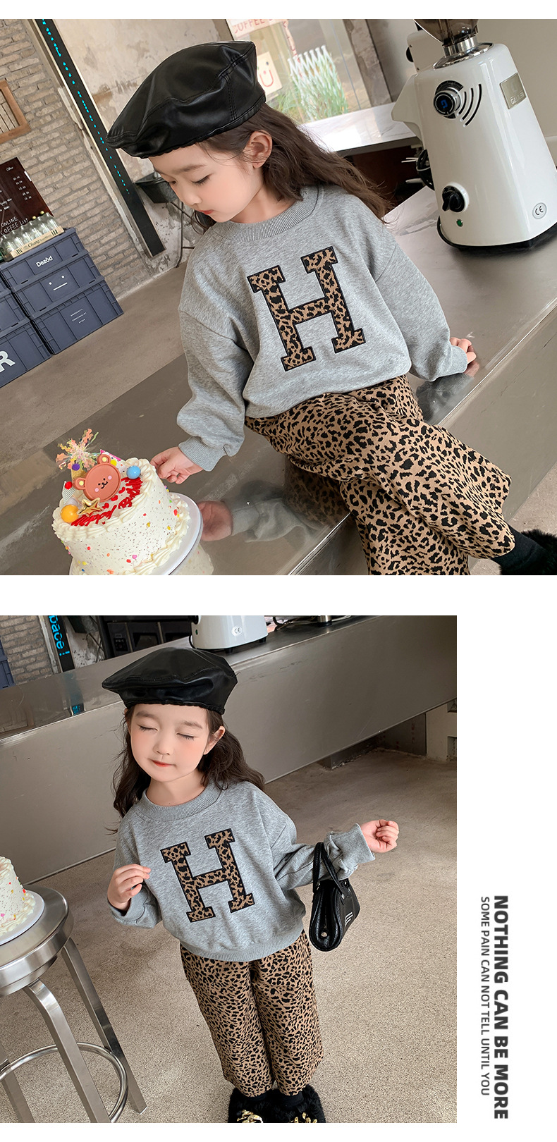 봄과 가을 새로운 여성 패션 세련된 코튼 스웨터 어린이 레오파드 와이드 레그 팬츠 세트 소녀의 세련된 쿨 투피스 세트