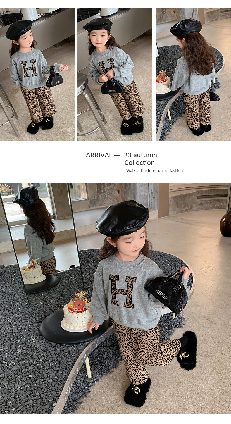 봄과 가을 새로운 여성 패션 세련된 코튼 스웨터 어린이 레오파드 와이드 레그 팬츠 세트 소녀의 세련된 쿨 투피스 세트스토어 가기