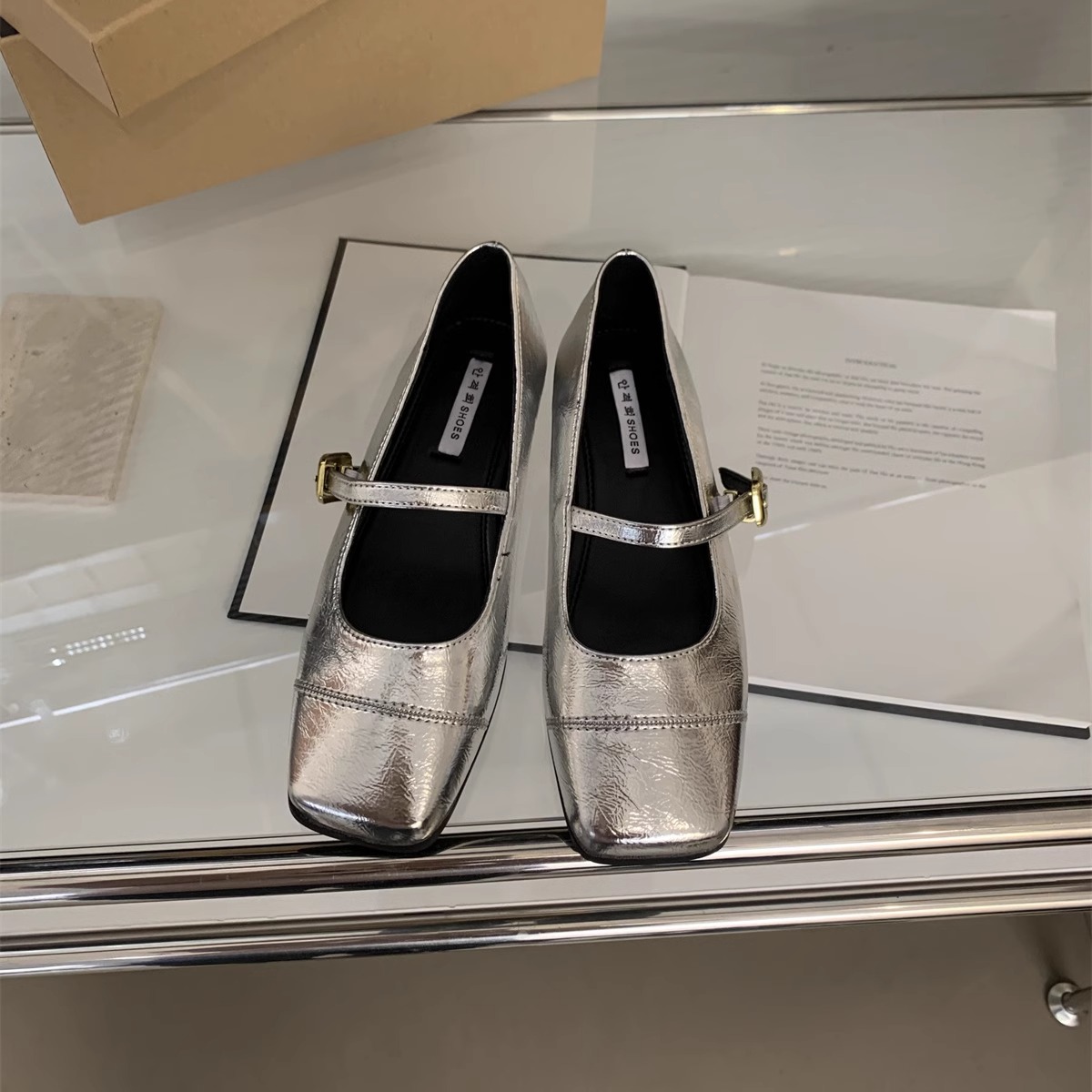 실버 스퀘어 발가락 신발 여성의 2025 새로운 봄과 가을 원피스 프랑스 저녁 스타일 플랫 얕은 입 메리 제인 작은 가죽 신발스토어 가기