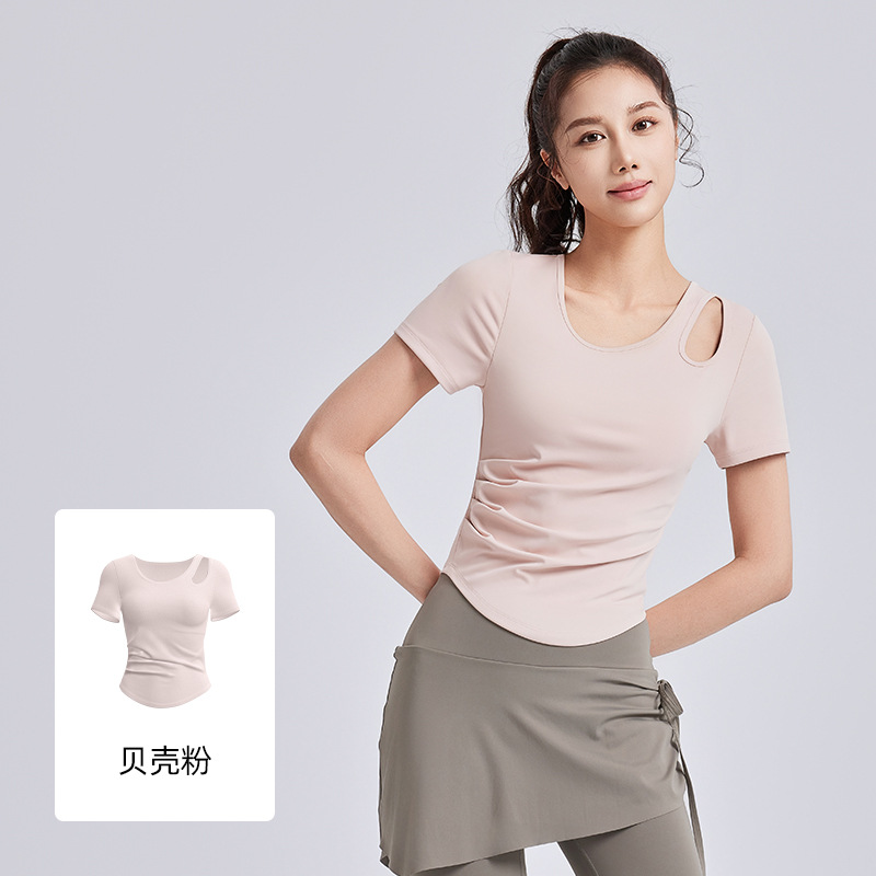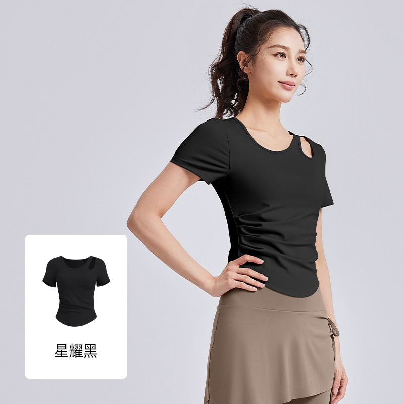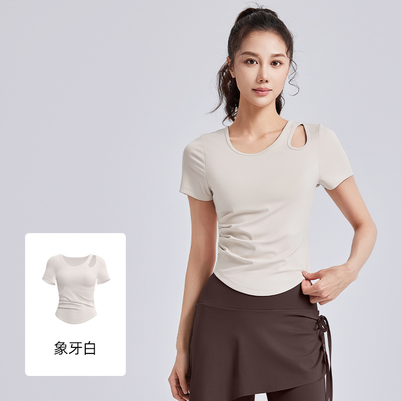 Juyitang 봄 새로운 할로우 아웃 주름 요가 세트 반팔 여성용 브라 프리 슬림 피트니스 스포츠 탑