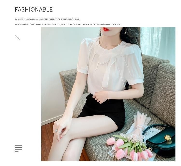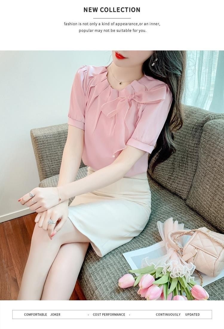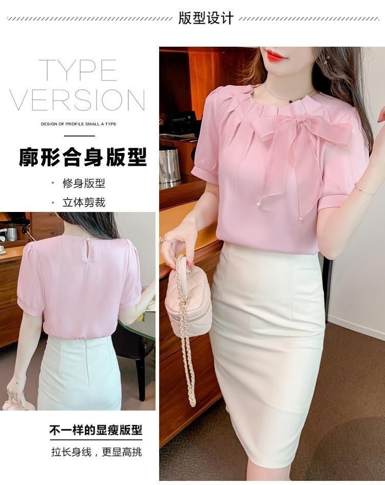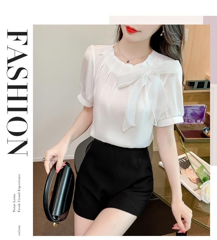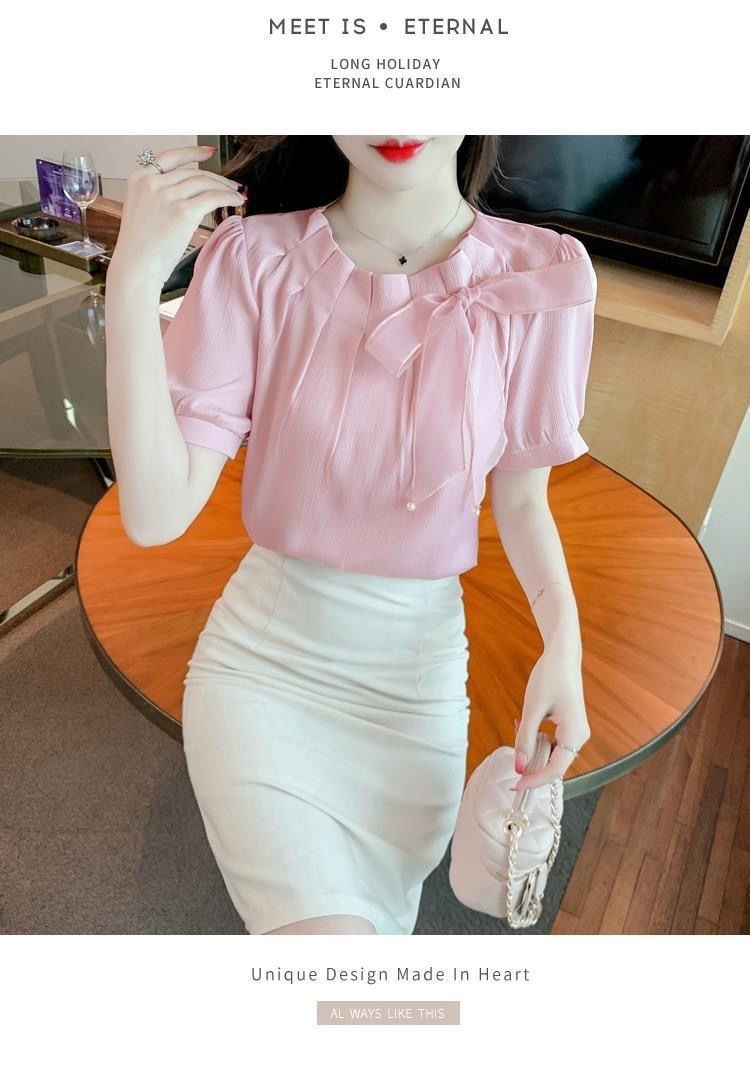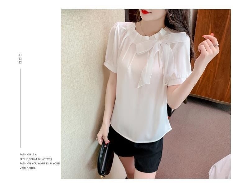 여름 새로운 한국 스타일 우아한 크루 넥 주름 활 쉬폰 반팔 셔츠 여성의 세련된 아름다운 달콤한 작은 셔츠스토어 가기