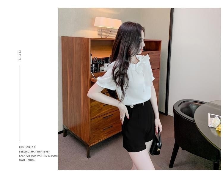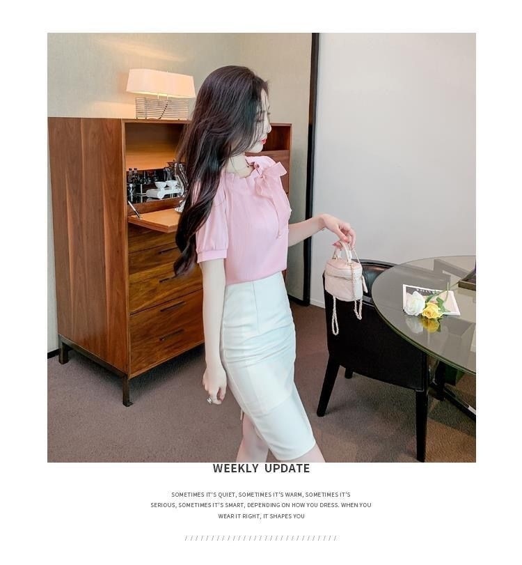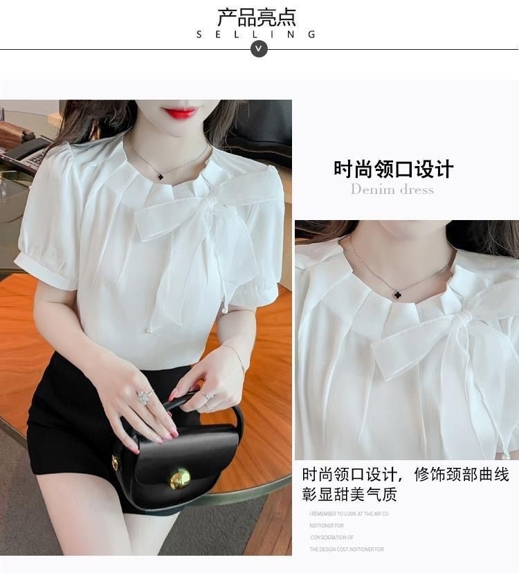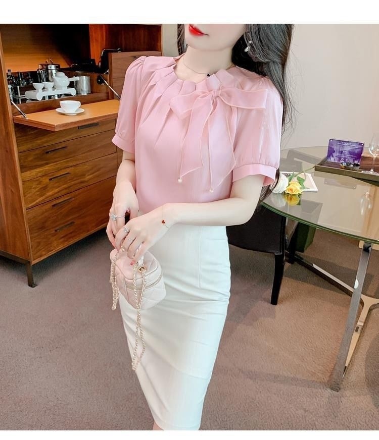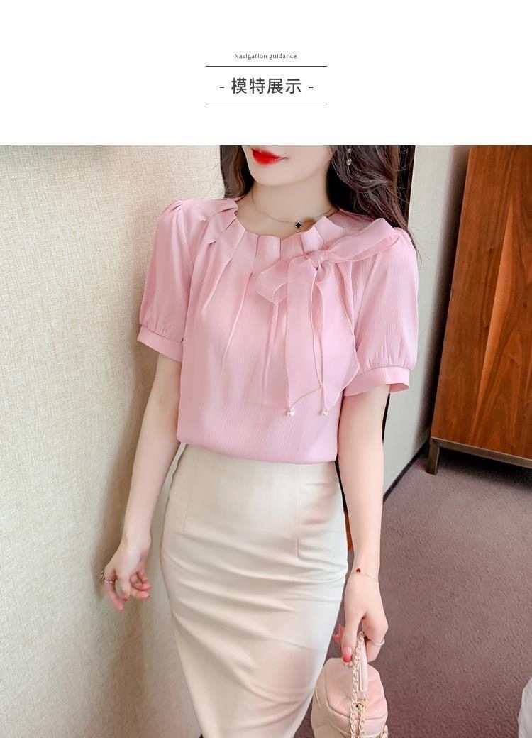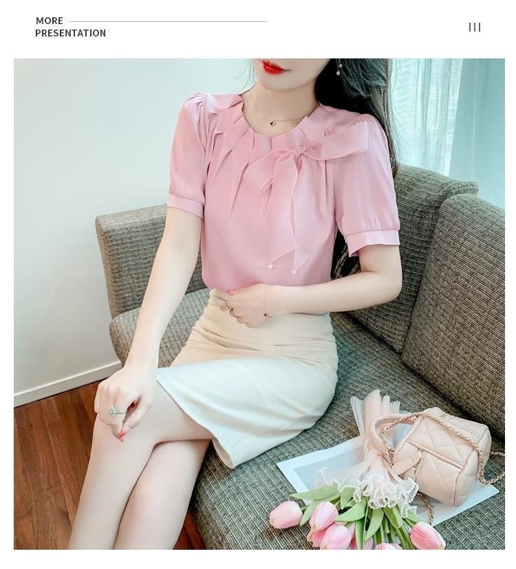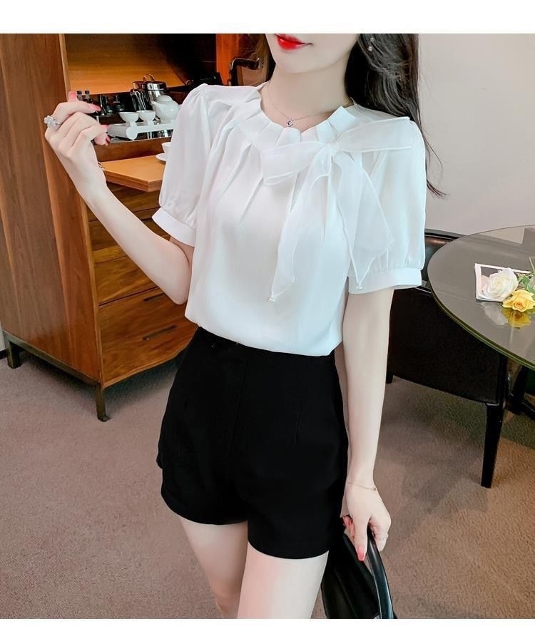 여름 새로운 한국 스타일 우아한 크루 넥 주름 활 쉬폰 반팔 셔츠 여성의 세련된 아름다운 달콤한 작은 셔츠스토어 가기