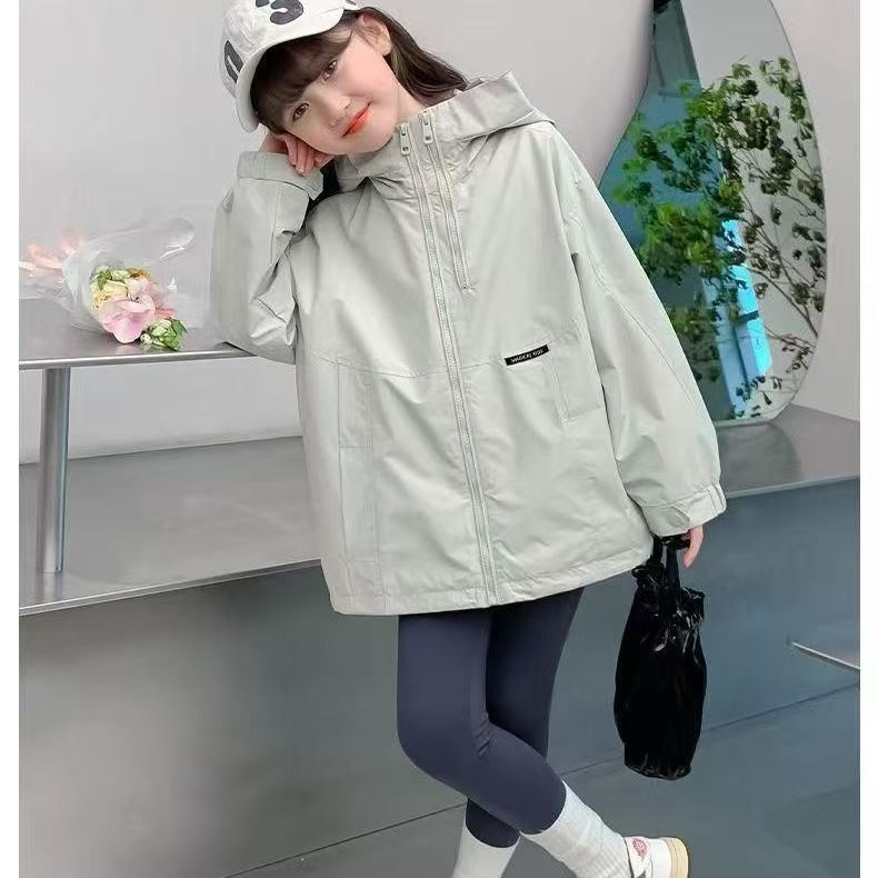 소녀 코트 봄과 가을 2025 새로운 스타일 어린이 유행 후드 러시 옷 큰 어린이 캐주얼 탑스토어 가기