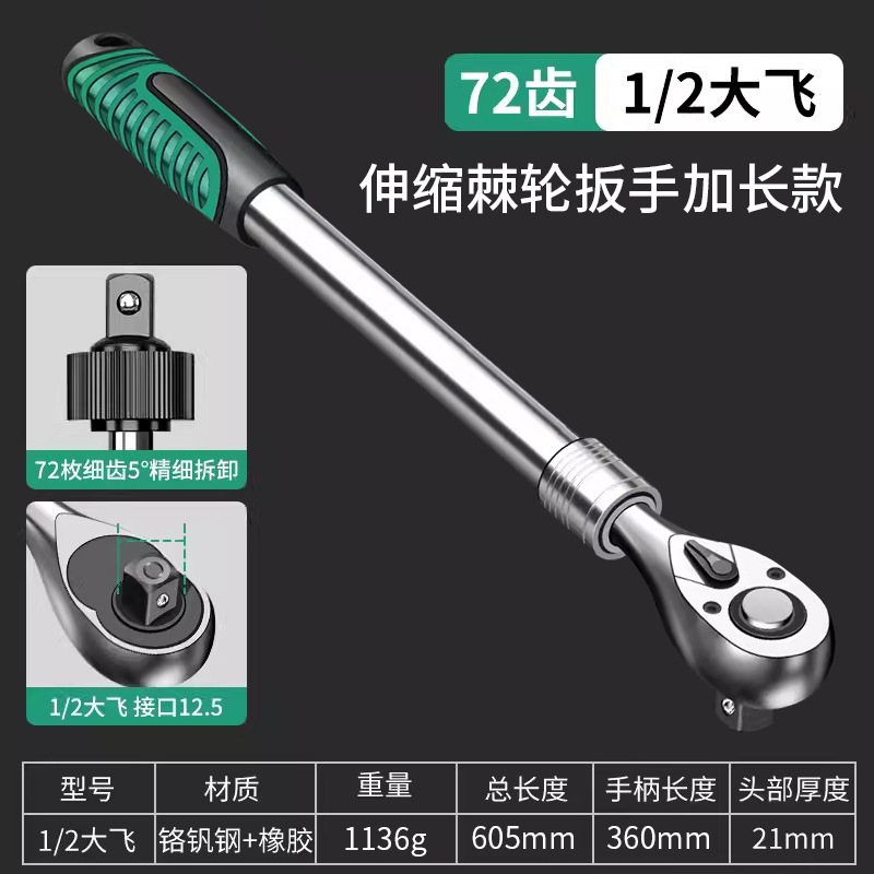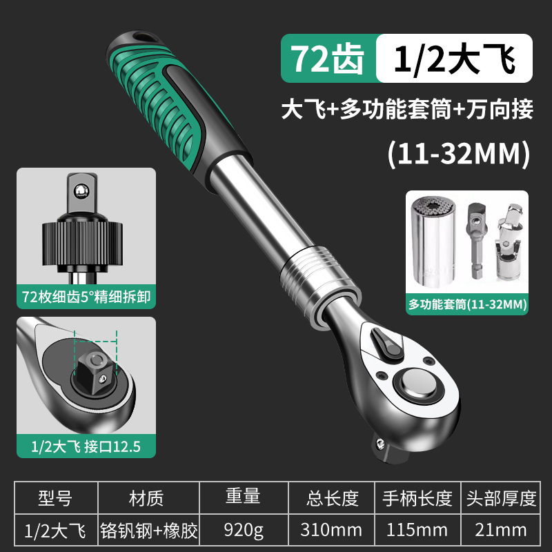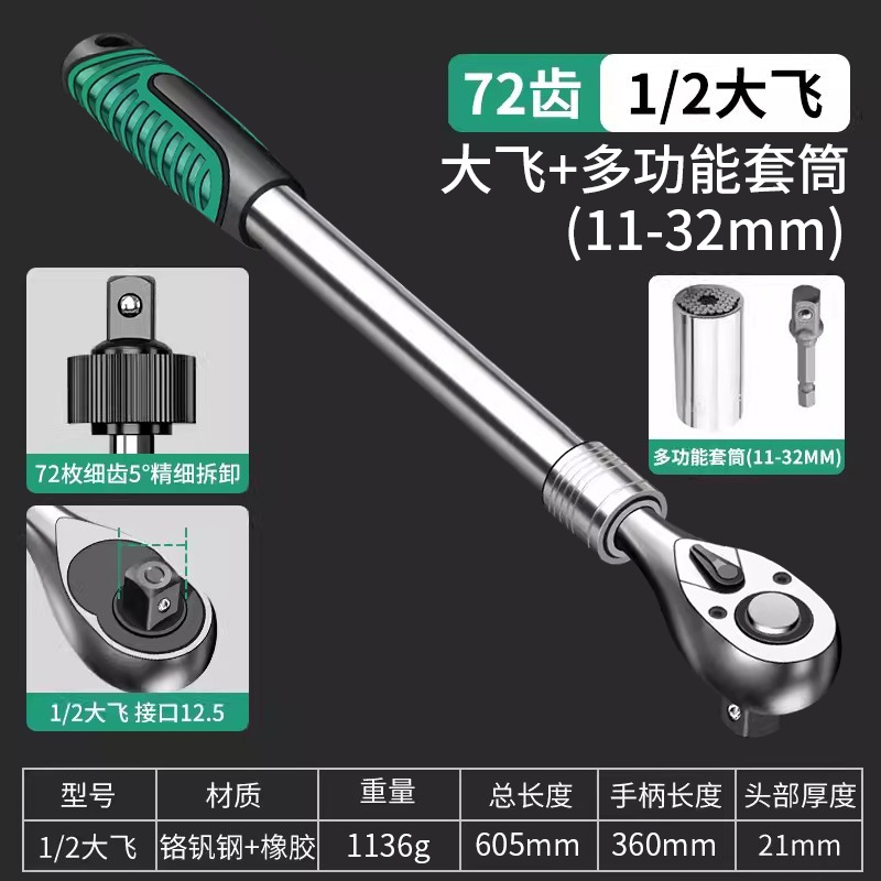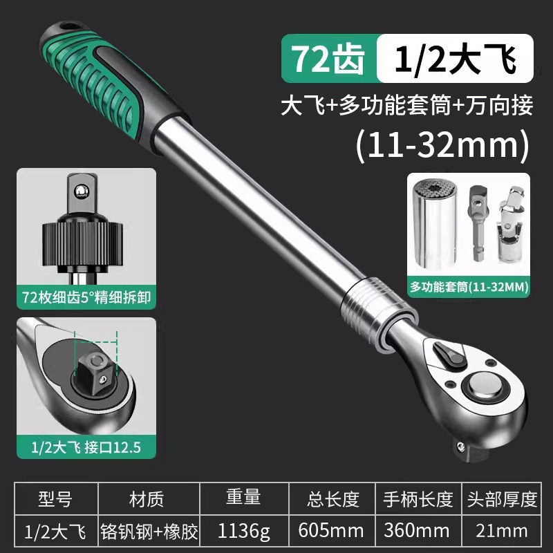 • 1/2 텔레스코픽 래칫 렌치-72 톱니 대형 플라이 + 범용 소켓(11-32mm)