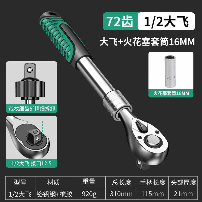 • 1/2 텔레스코픽 래칫 렌치 - 72개 치아 대형 플라이 + 스파크 플러그 슬리브 16mm.