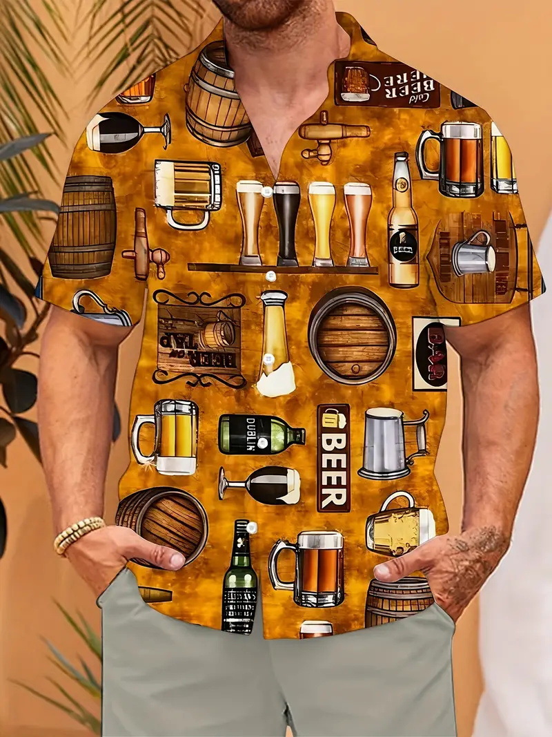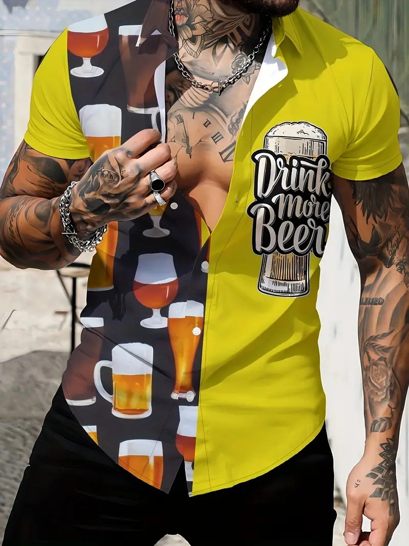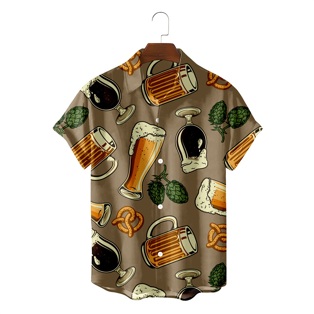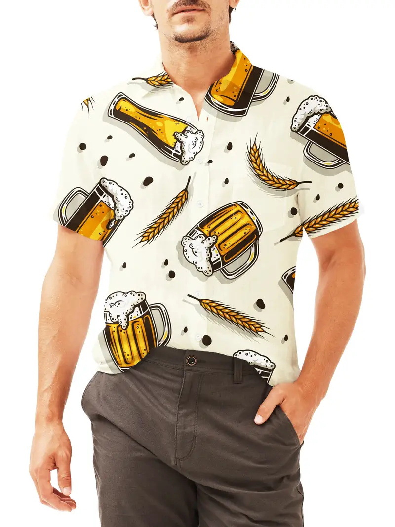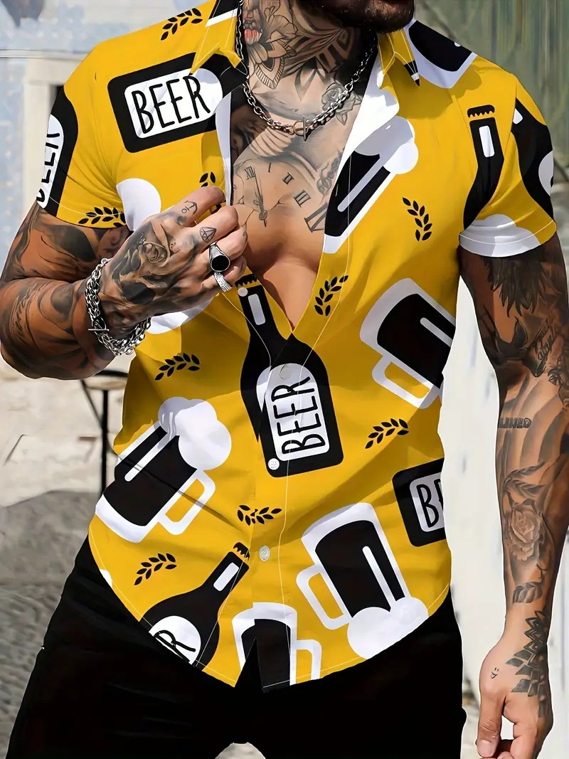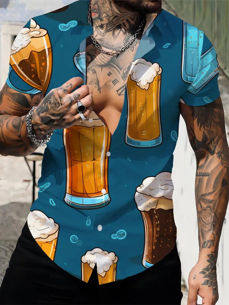 2025 남자의 새로운 독특한 3D 맥주 HD 인쇄 단일 가슴 랩 느슨한 편안한 반팔 셔츠스토어 가기