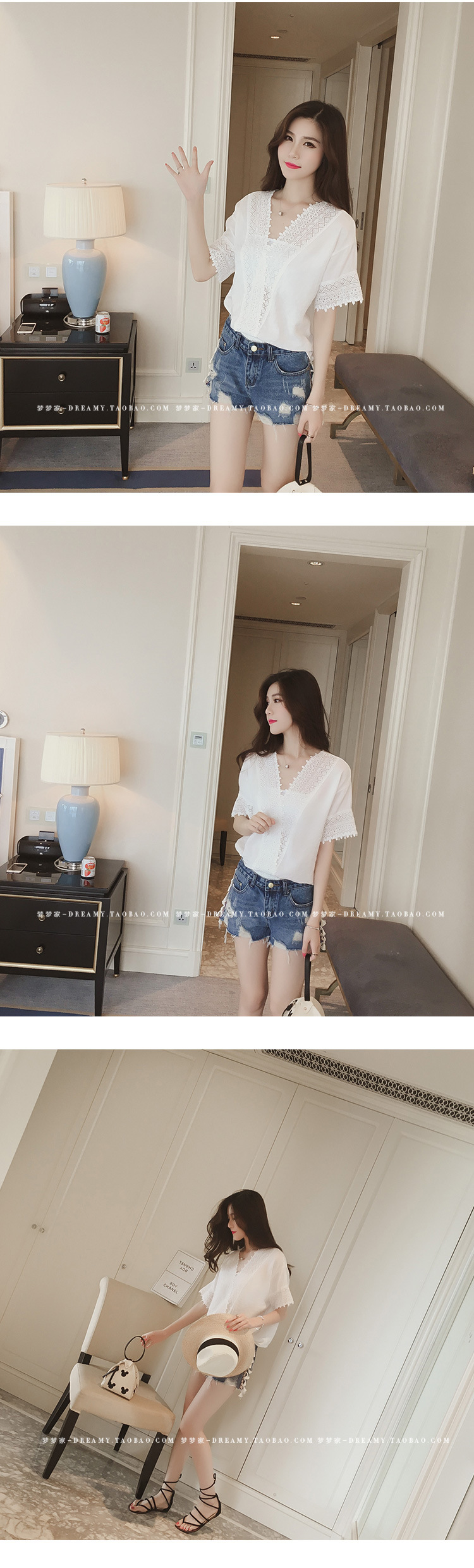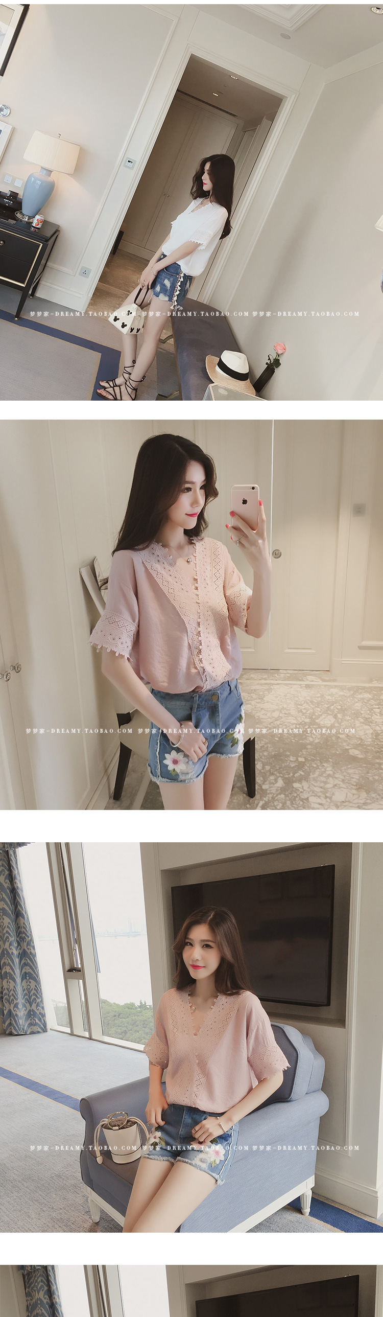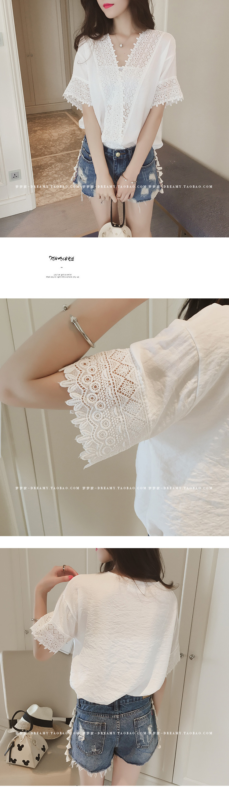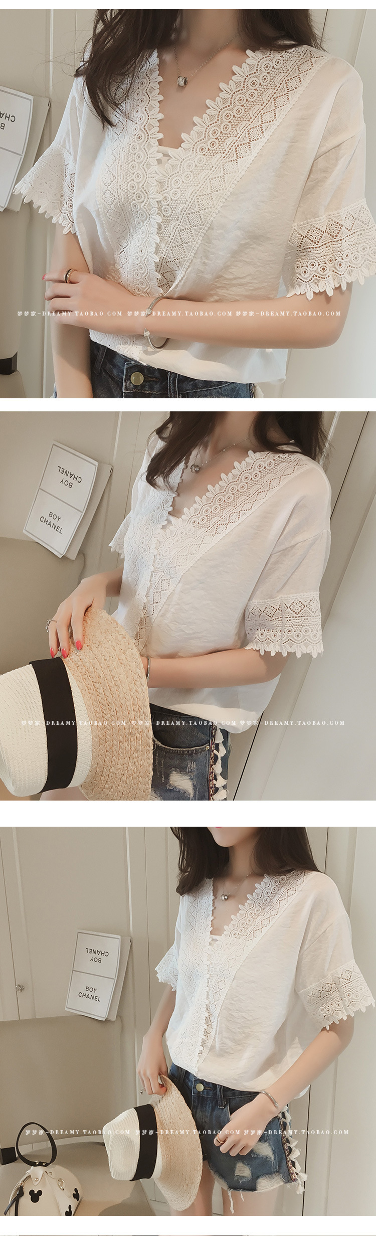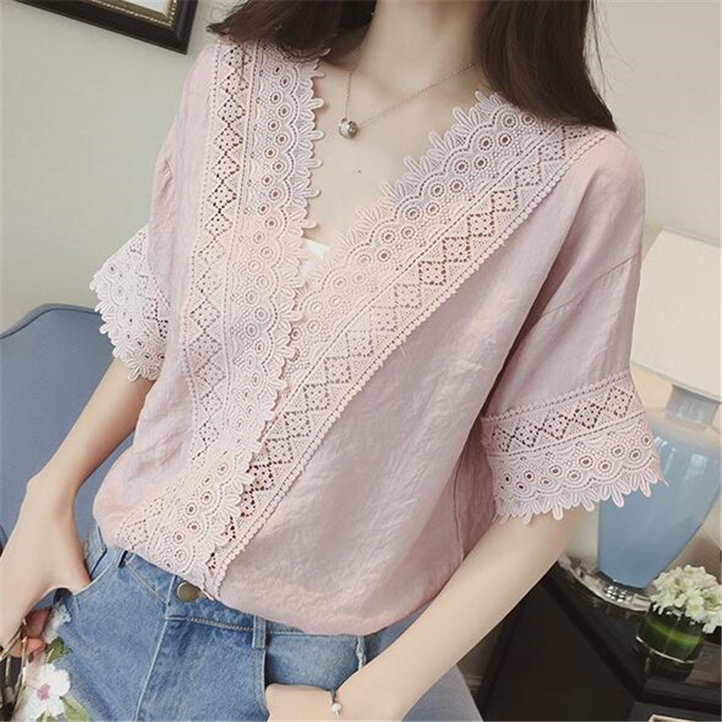 2025 여름 한국 스타일 새로운 느슨한 흰색 레이스 쉬폰 셔츠 여성 반팔 솔리드 컬러 중공 v 넥 쉬폰 탑스토어 가기