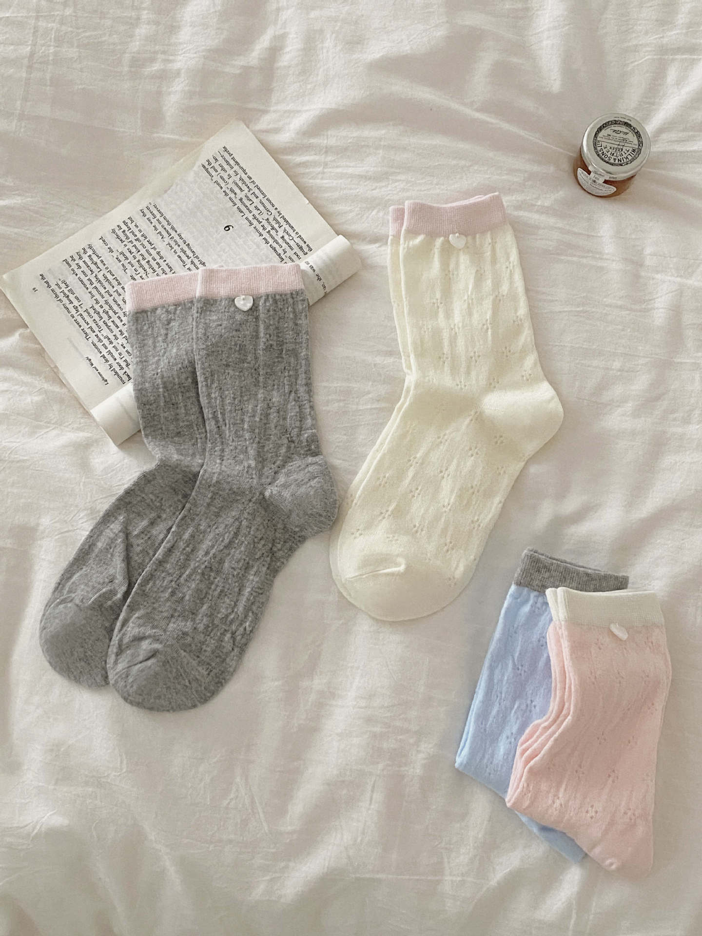 봄과 여름 여성 양말 일본 크림 컬러 중간 튜브 얇은 구멍 양말 여성 단색 거품 입 학생