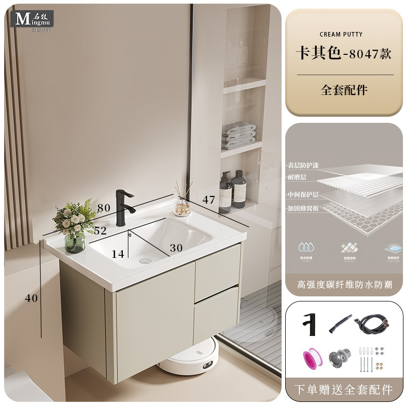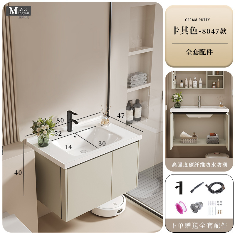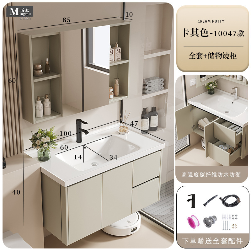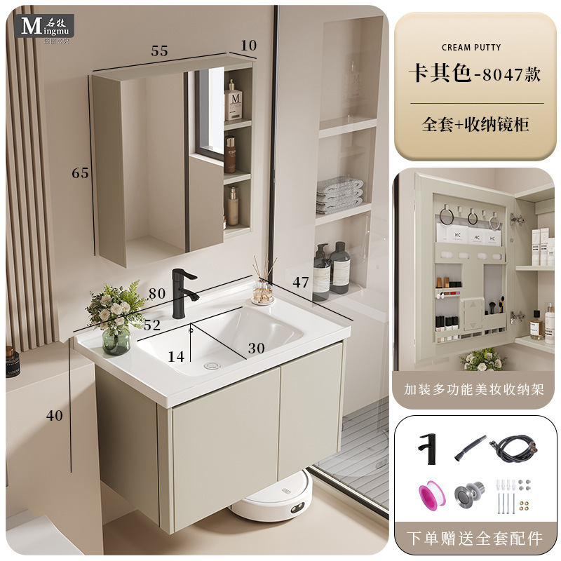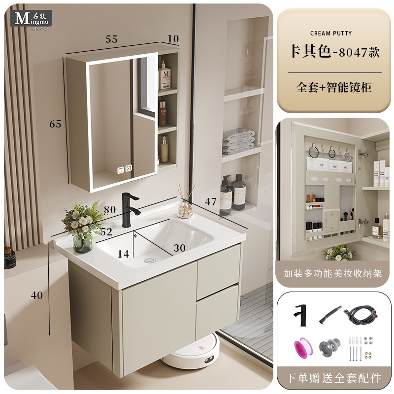 • 카키 그레이 8047 세라믹 세면대 캐비닛 + 스마트 수납 거울 캐비닛