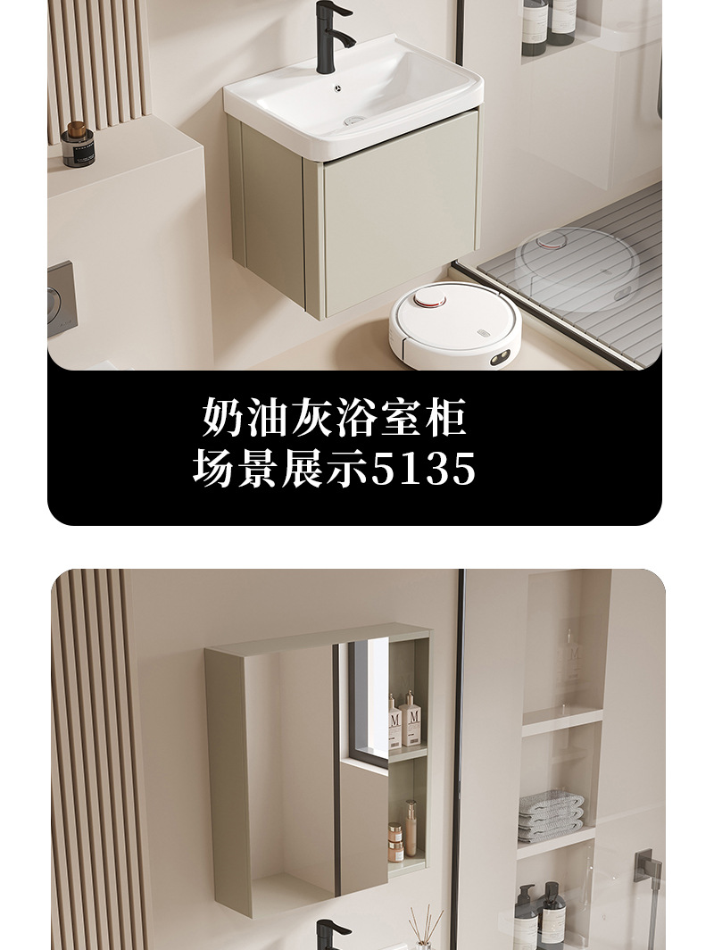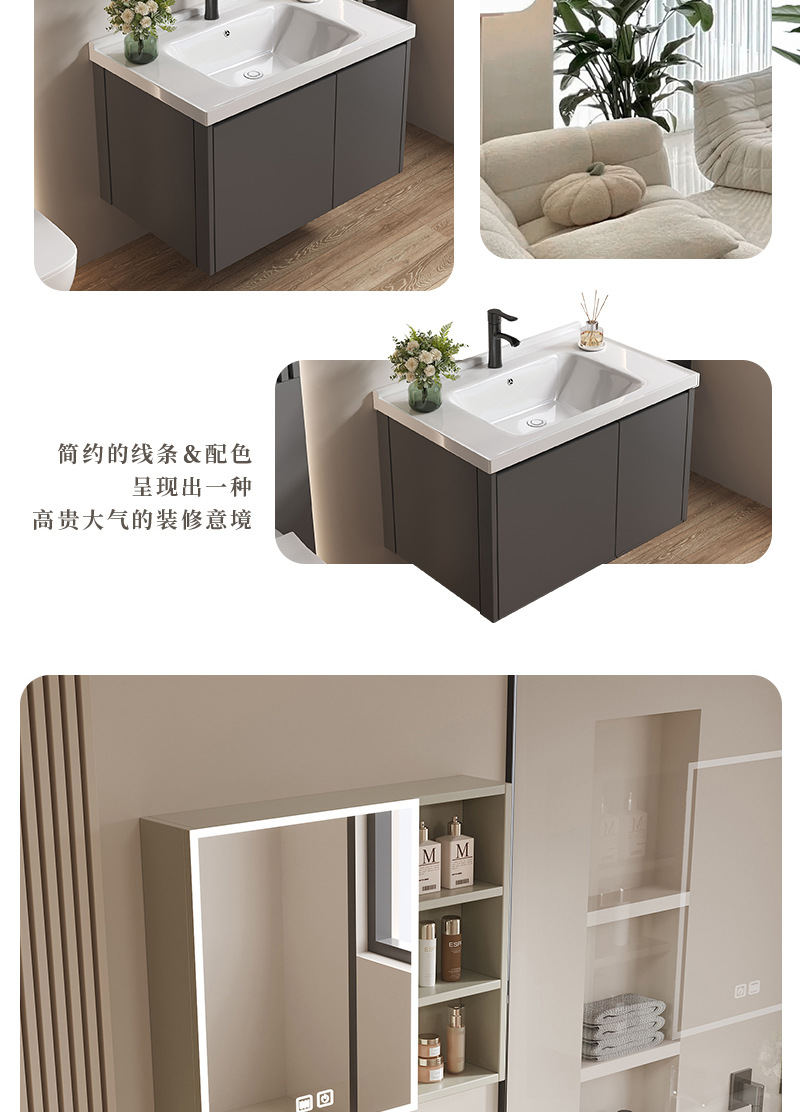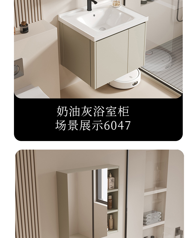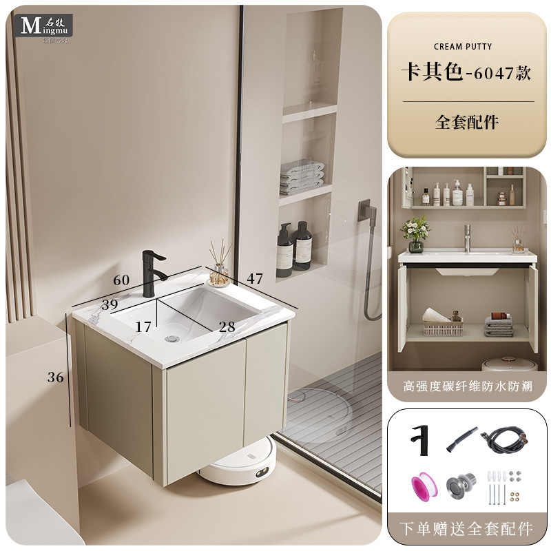 • 카키 그레이 6047 세라믹 세면대 캐비닛 + 스마트 수납 거울 캐비닛