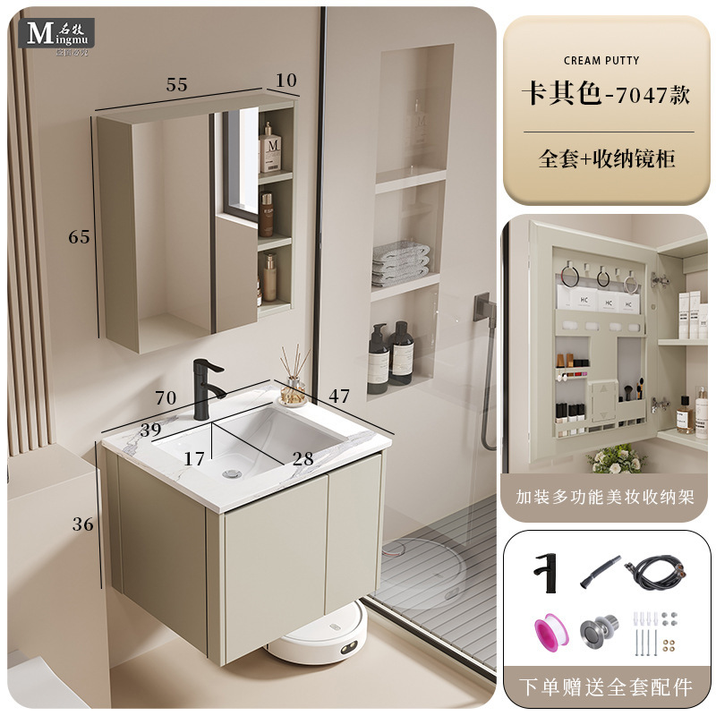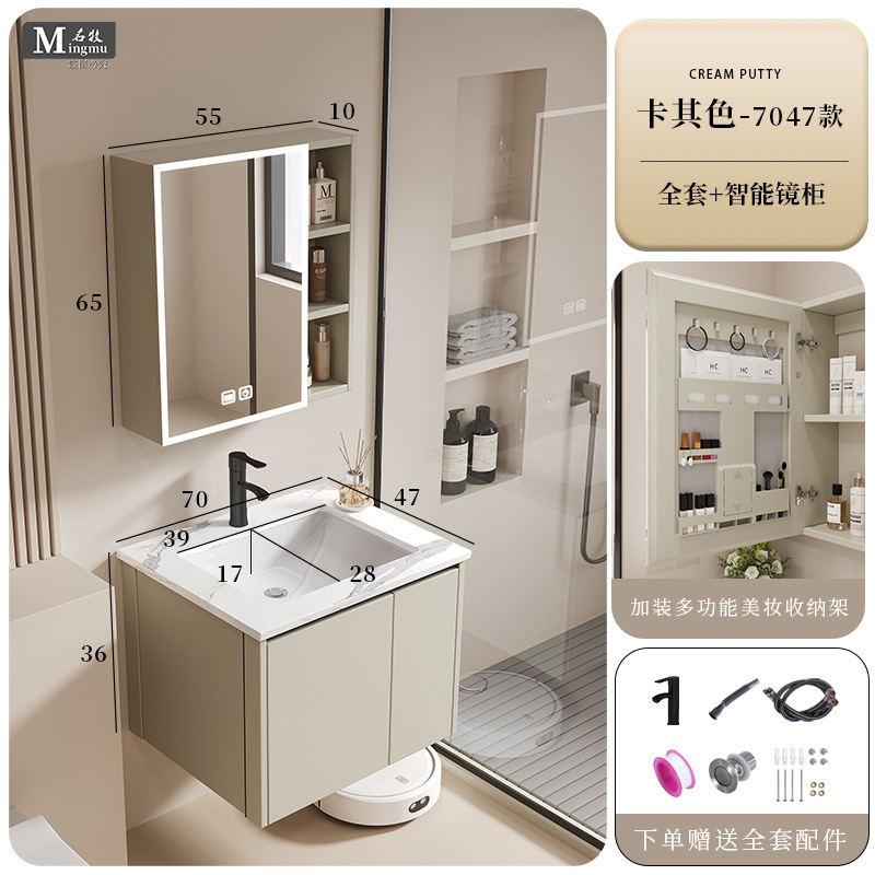 • 카키 그레이 7047 세라믹 세면대 캐비닛 + 스마트 수납 거울 캐비닛