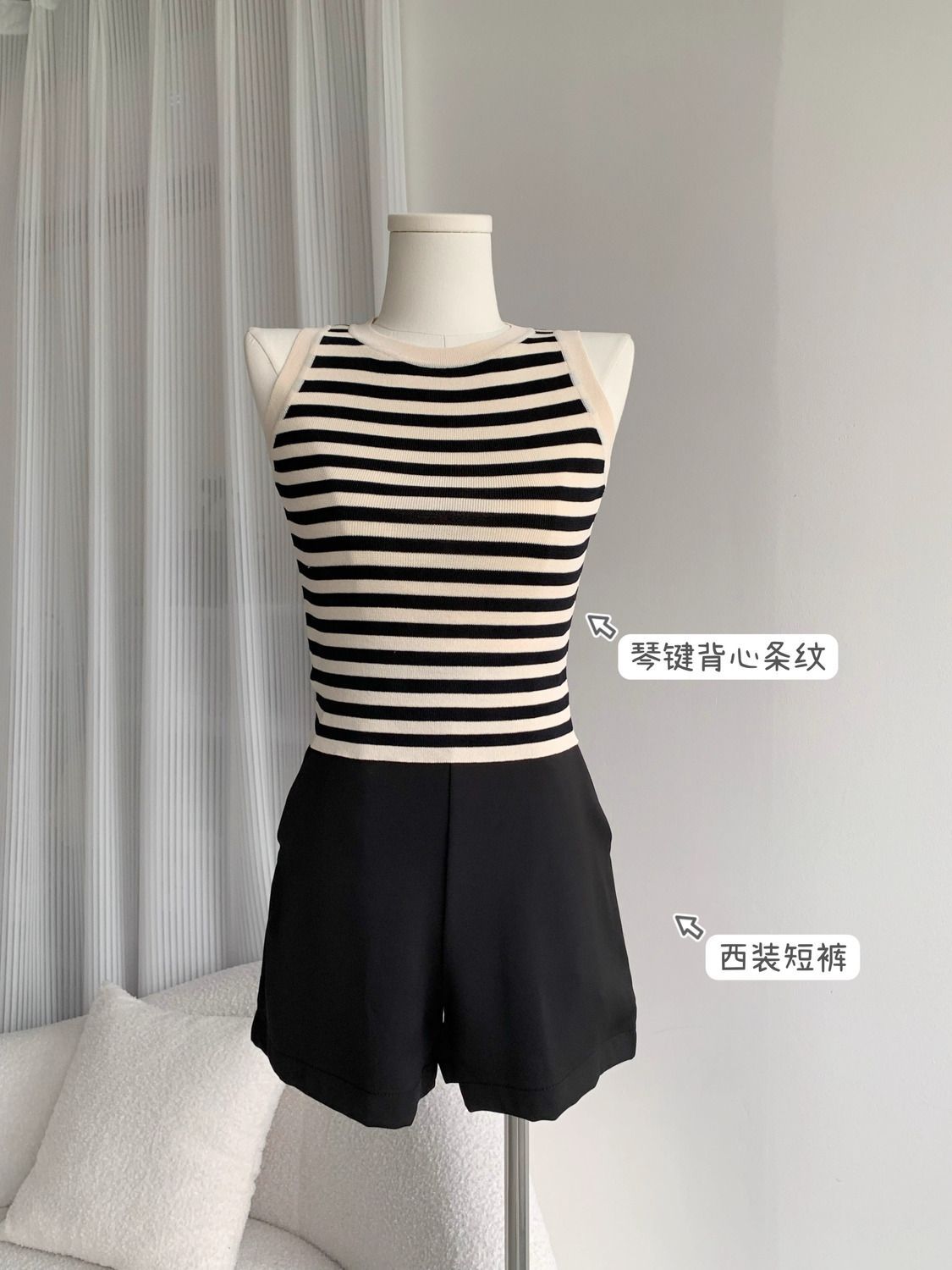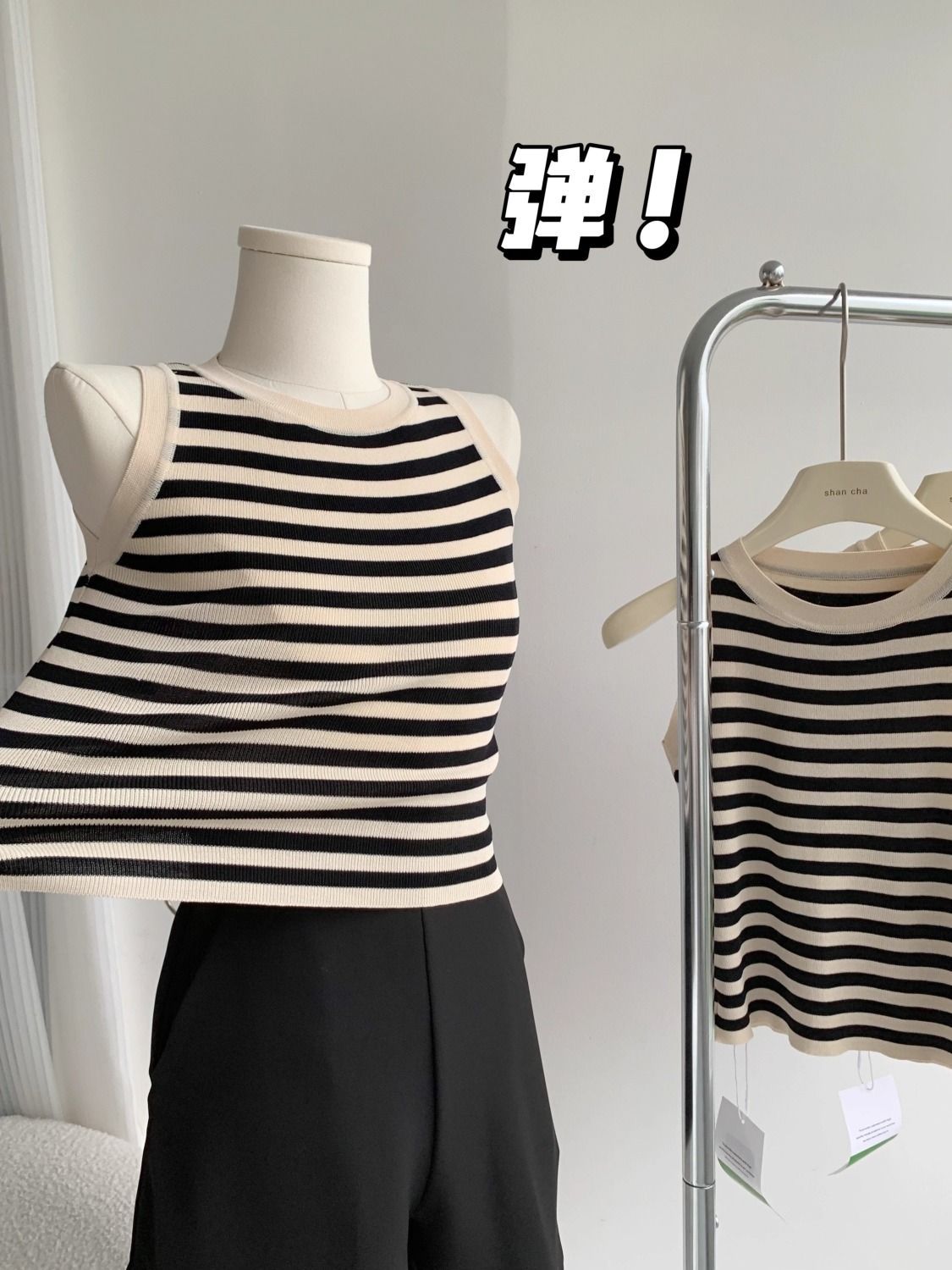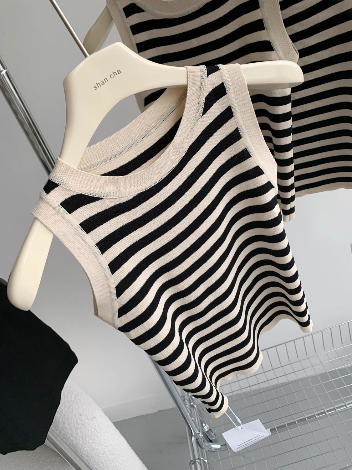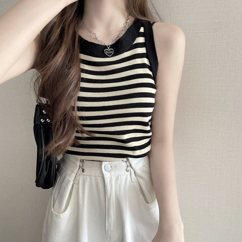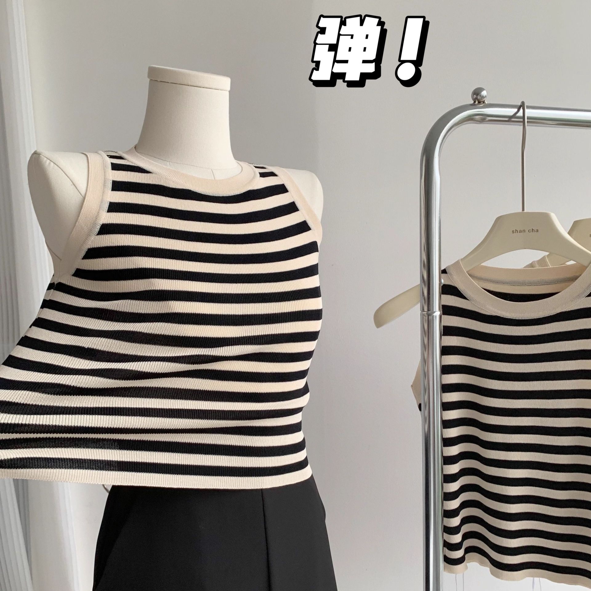 아이스 실크 스트라이프 니트 조끼 여성 여름 2025 새로운 슬림 핏 짧은 민소매 이너 탑 스파이스 소녀 슬링 아우터웨어