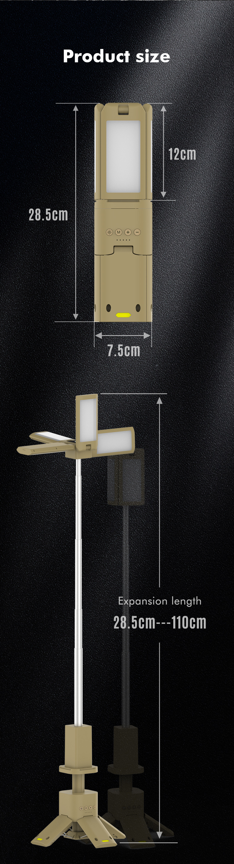 · 伸缩、便携、无绳:这款野营灯是无绳和可充电的,可以随身携带到任何地方。 它们是可伸缩的,可从 285 毫米扩展到 1100 毫米,提供灵活的照明选项。 75 毫米 x 75 毫米 x 285 毫米的便携尺寸,净重 980 克,方便携带和运输。