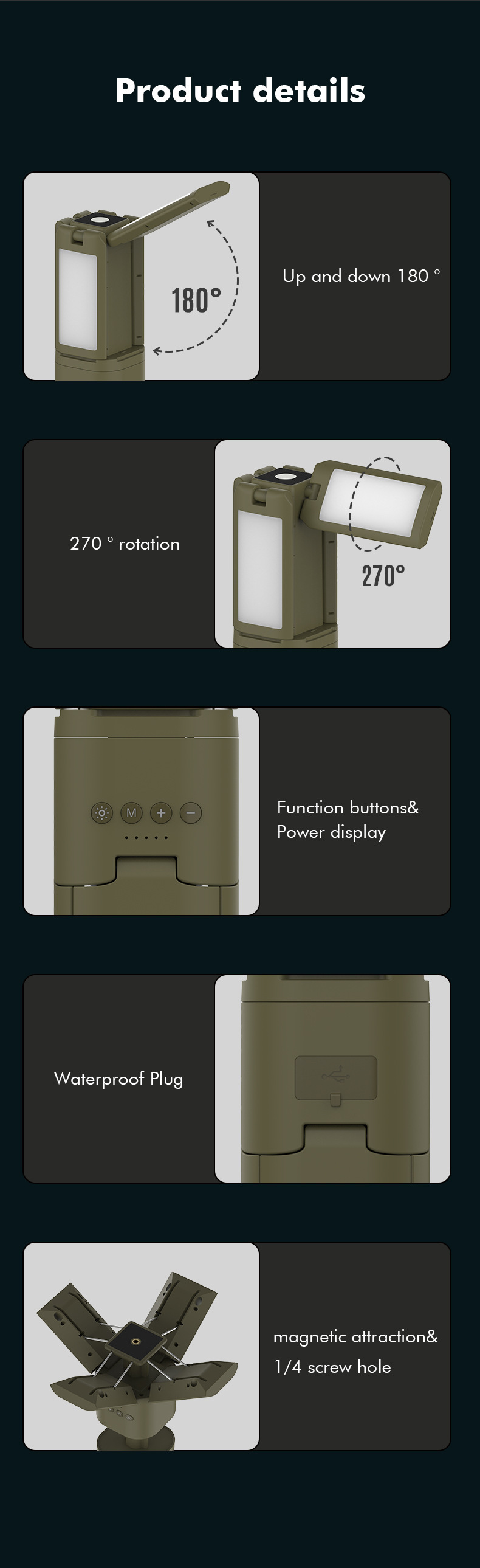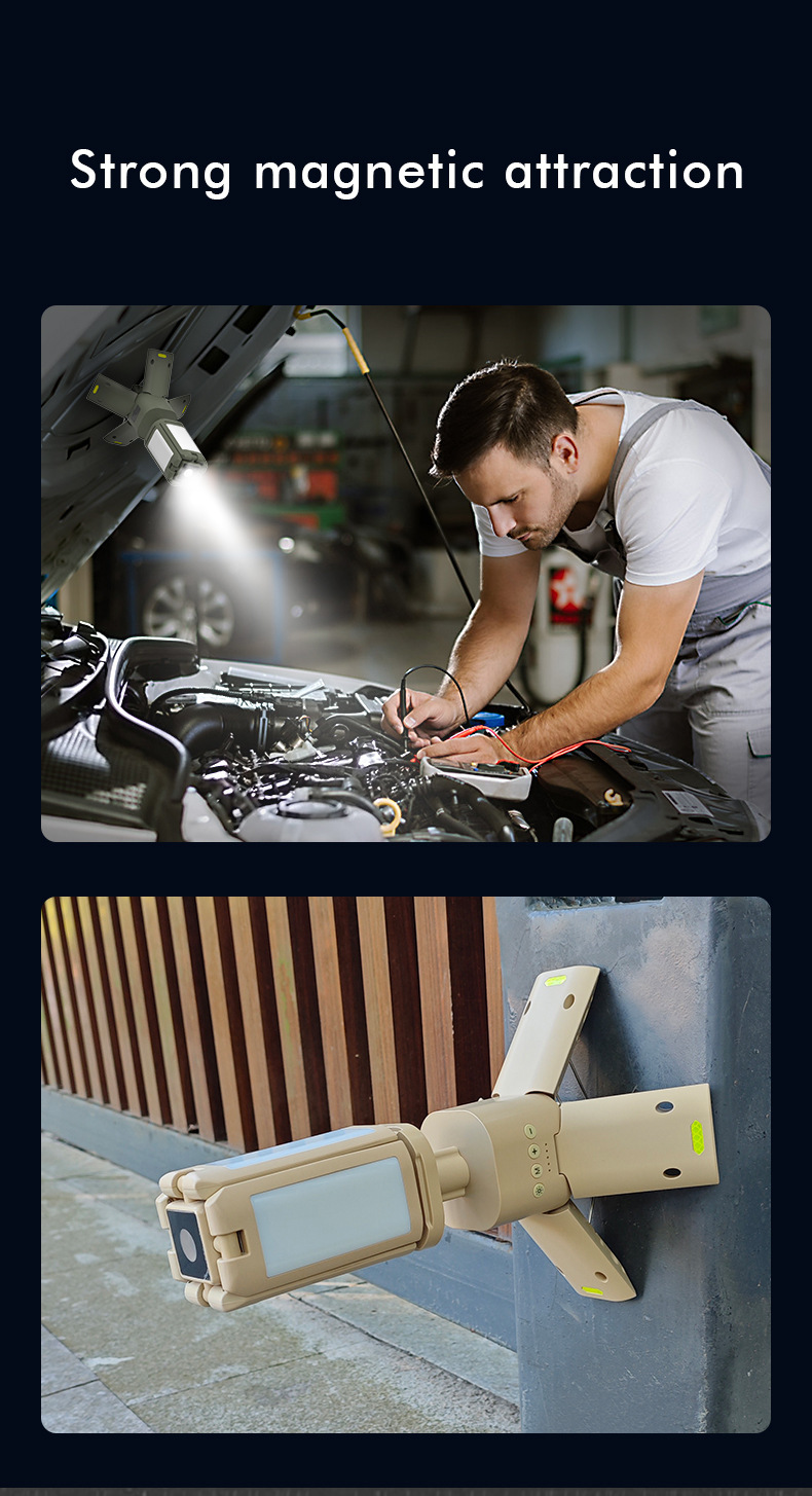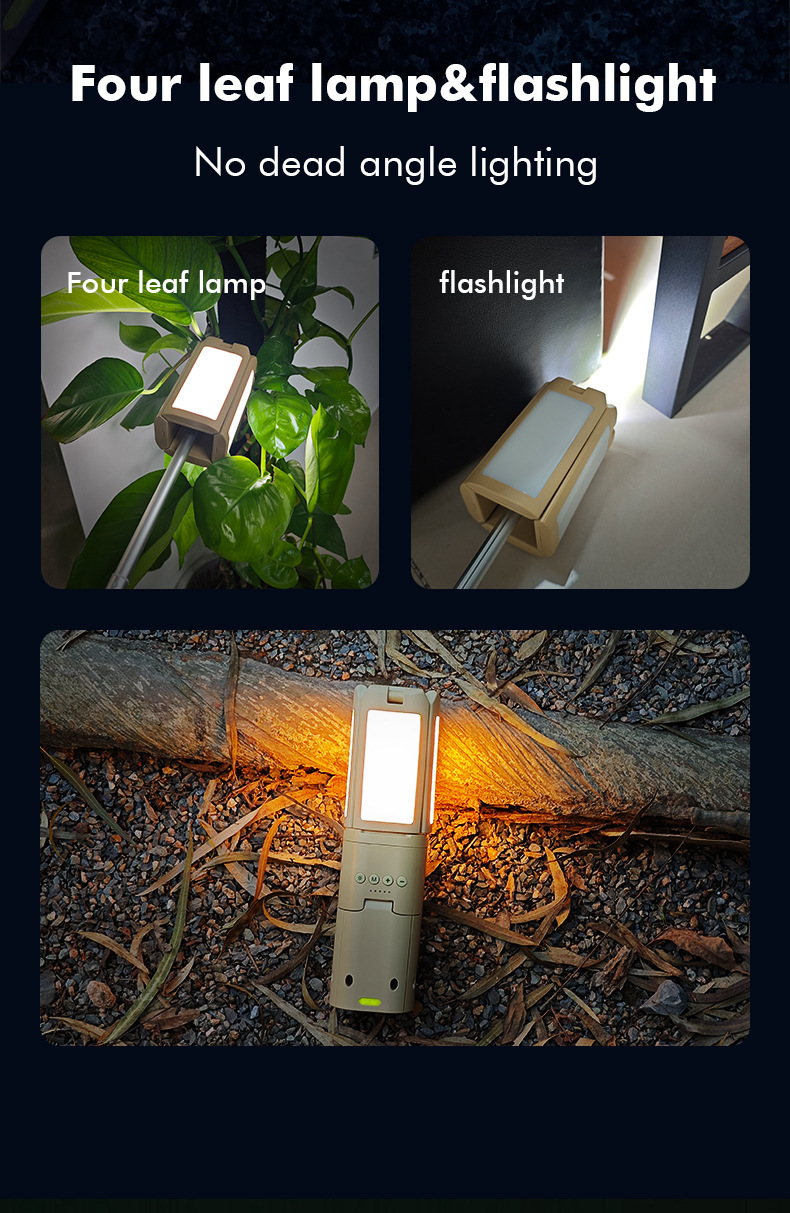 · 【可调节・多功能照明】顶部配有4个叶形灯泡,可垂直180°、水平270°调节,提供多种照明角度。 有四种模式可供选择,灯光可调,按钮控制,方便操作。