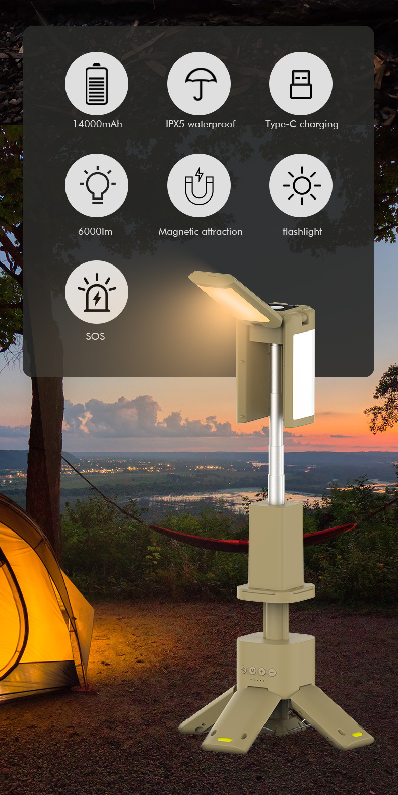 · 大容量电池14000mAh充电容量:露营灯可充电,电池容量为14000mAh,通过Type-C电缆充电。 它们还可以作为手机和平板电脑等移动设备的便携式电源,在您离开电网时方便使用。