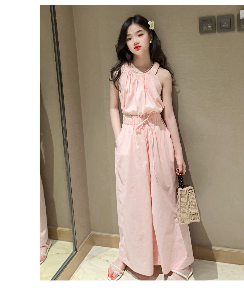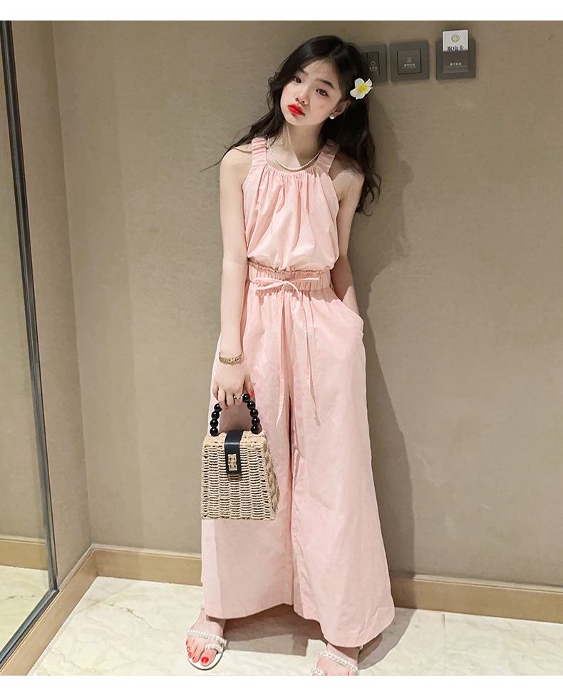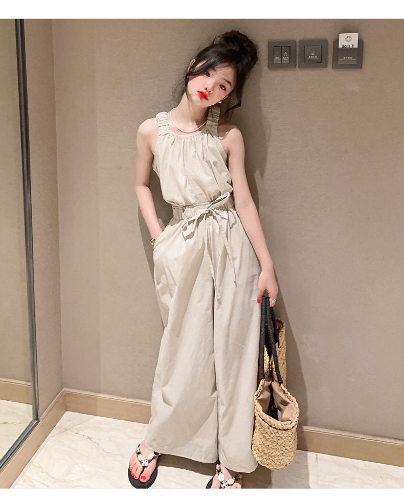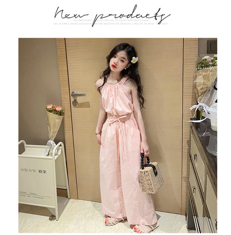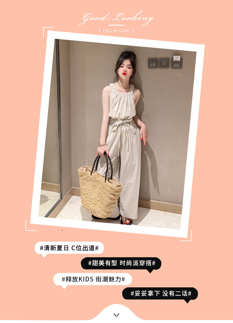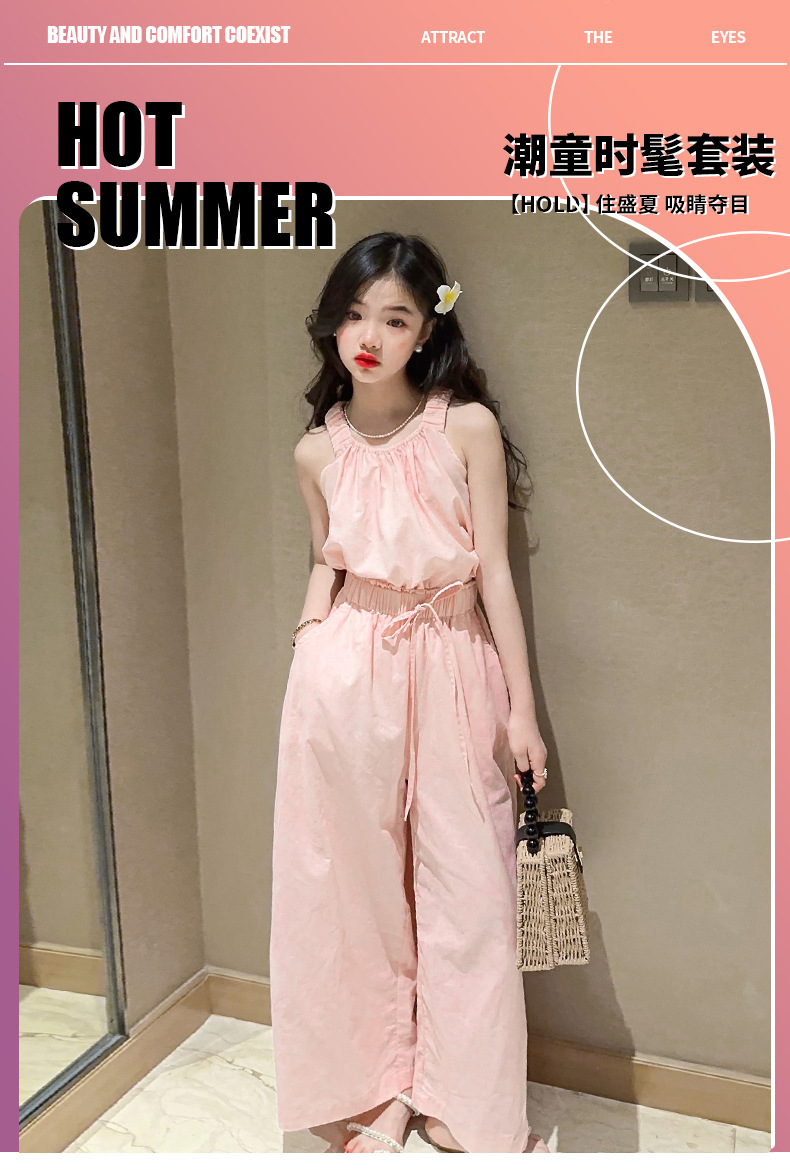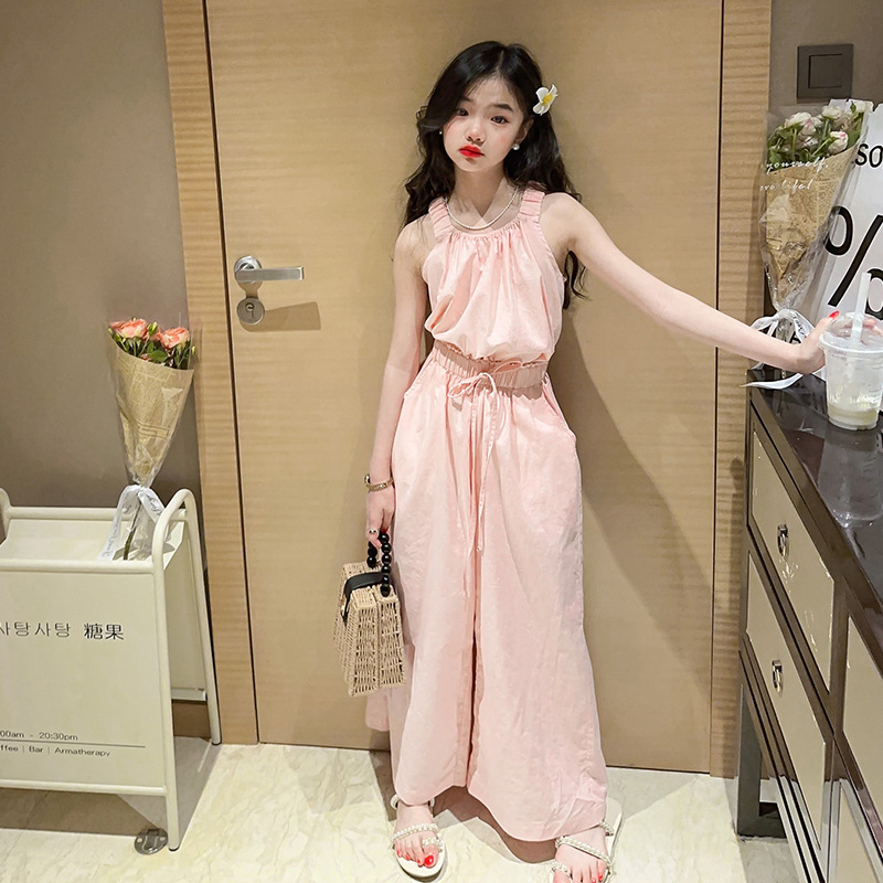 여름 소녀 슬링 세트 씻은 면화와 리넨 조끼 스트레이트 레그 팬츠 유행 미디어와 큰 어린이 신선한 홀리데이 스타일 투피스 세트