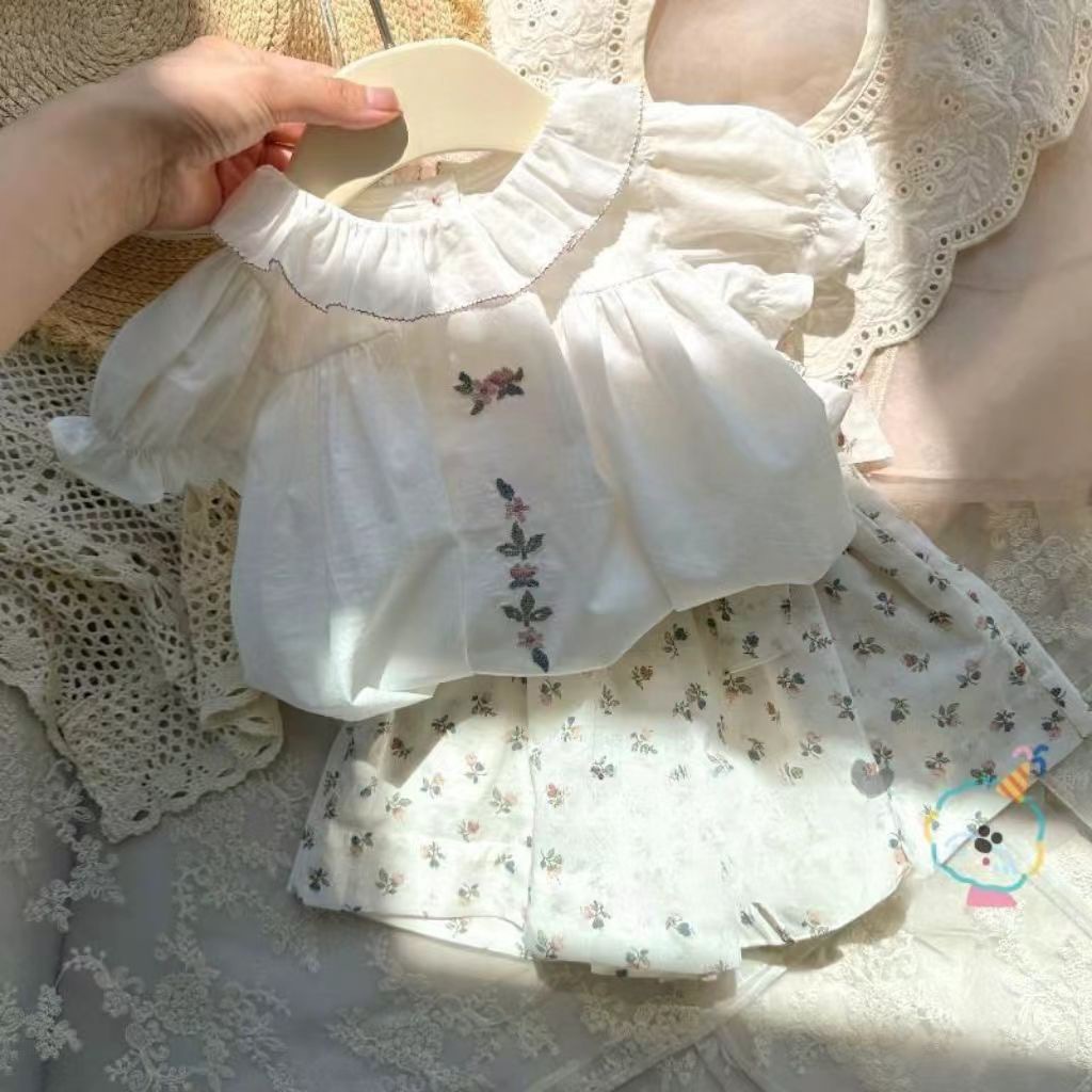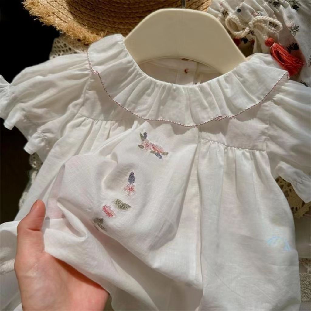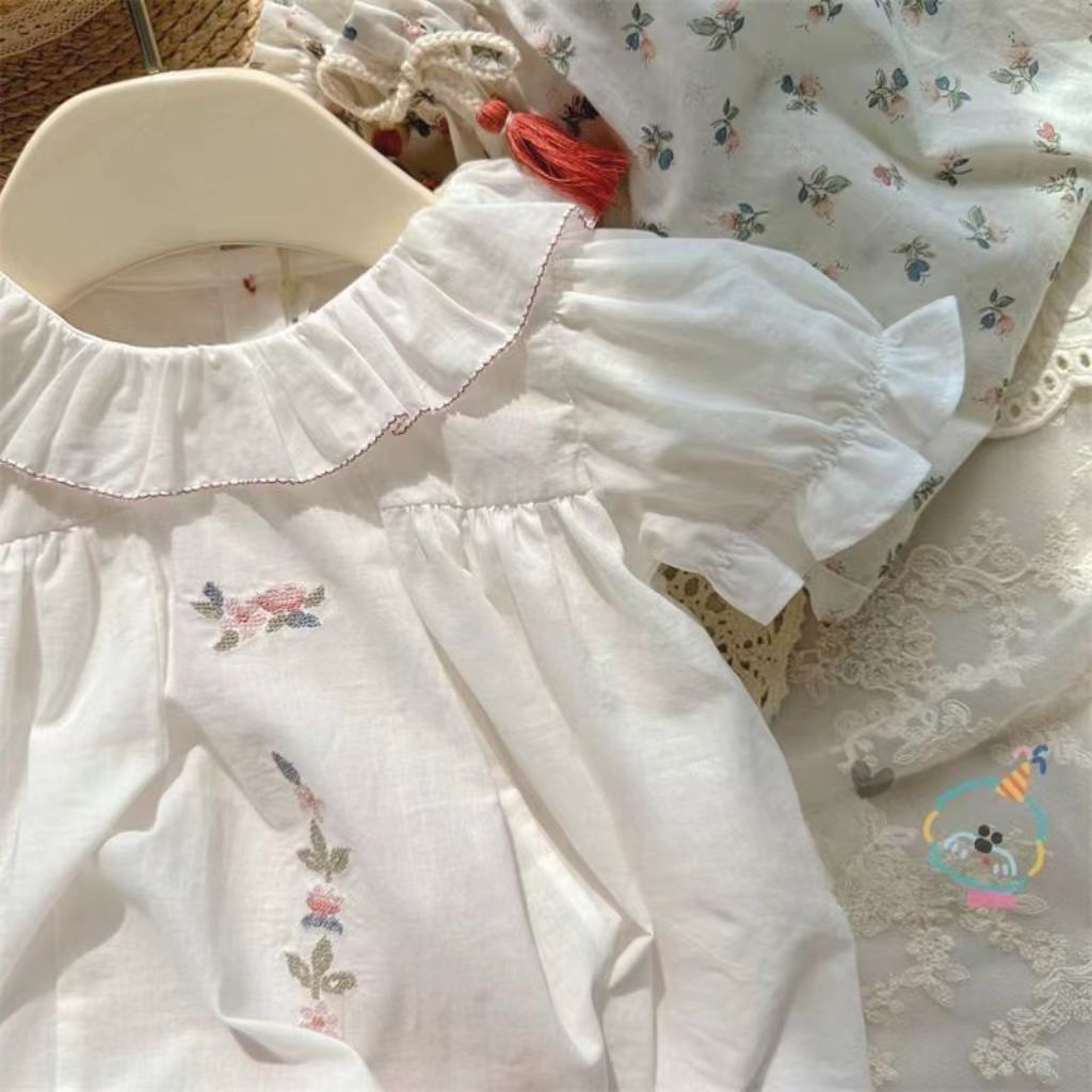 가볍고 한국 스타일 소녀 여름 탑 라이트급 퓨어 코튼 짧은 소매 자수 옷깃 퍼프 슬리브 인형 셔츠 티셔츠