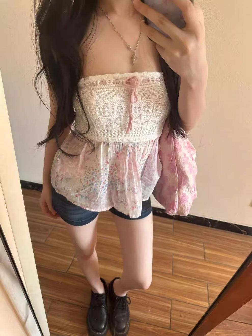달콤하고 매콤한 순수 스타일 크로 셰 뜨개질 꽃 프린트 민소매 최고 여성 여름 슬리밍 짧은 세련된 올매치 아름다운 탑