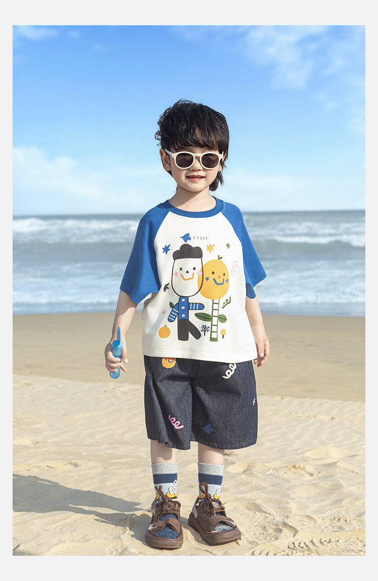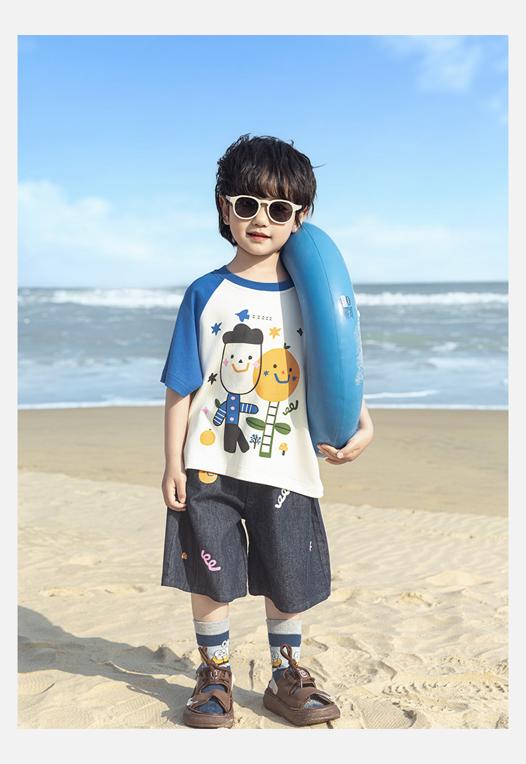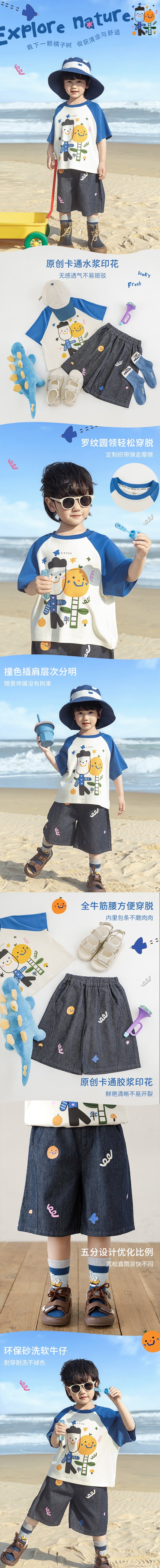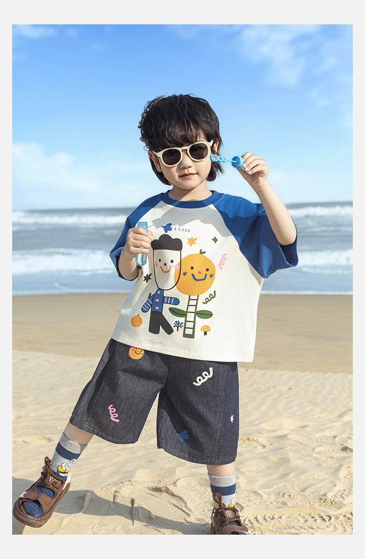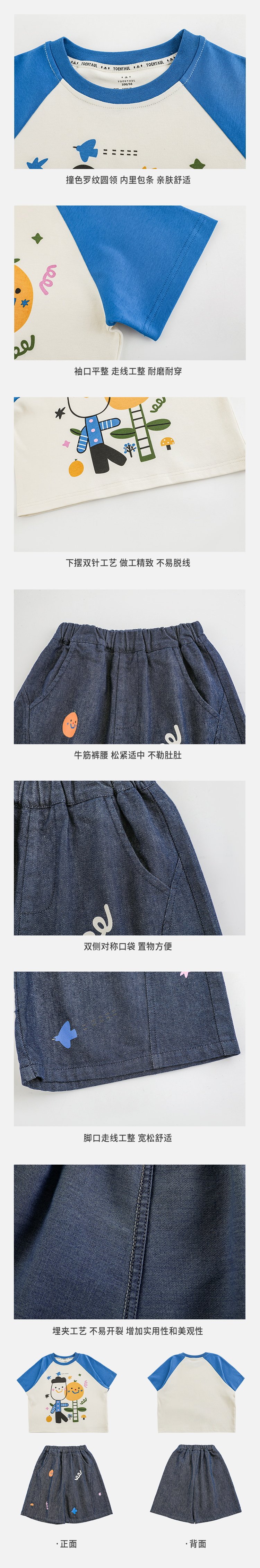 Wurib 소년 2025 세트 새로운 만화 승무원 목 대비 짧은 소매 티셔츠 여름 스트레이트 데님 반바지