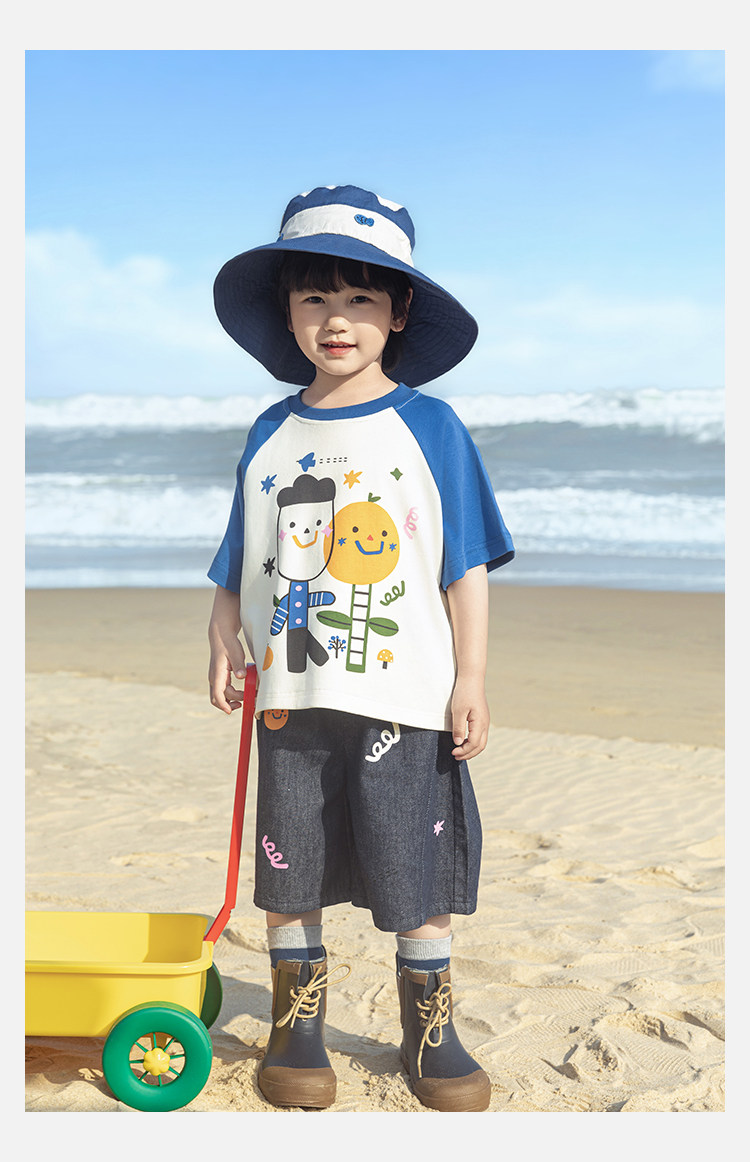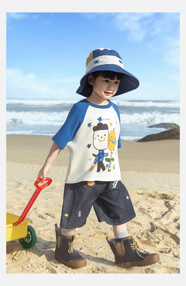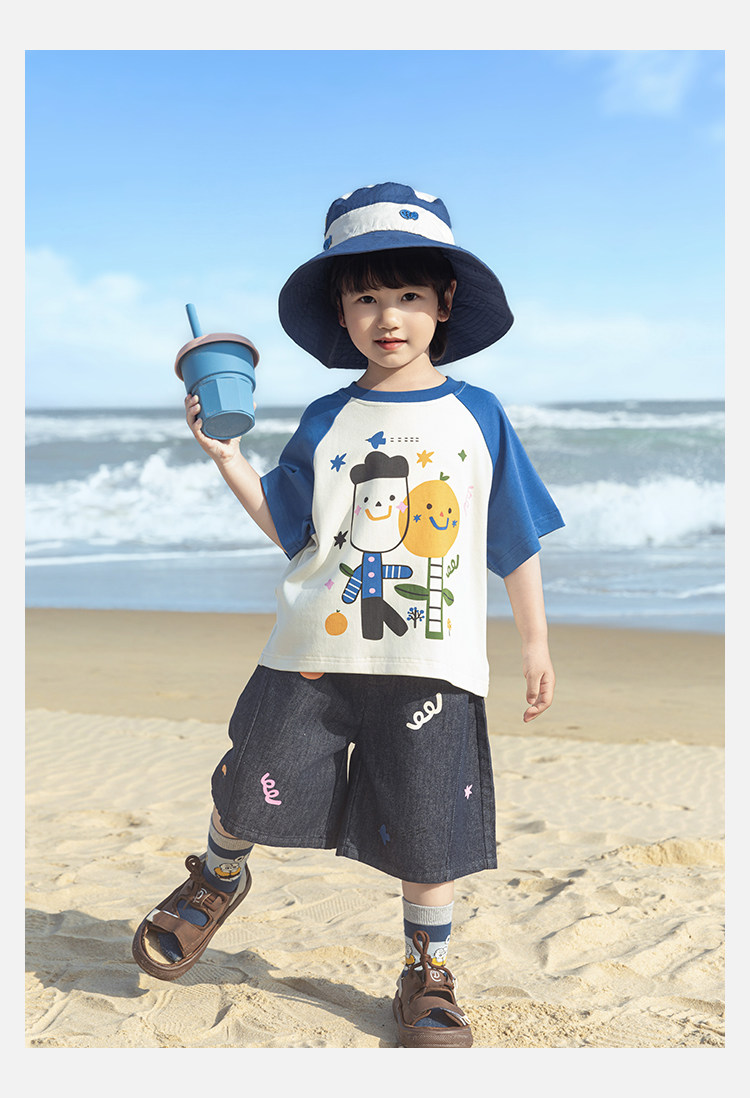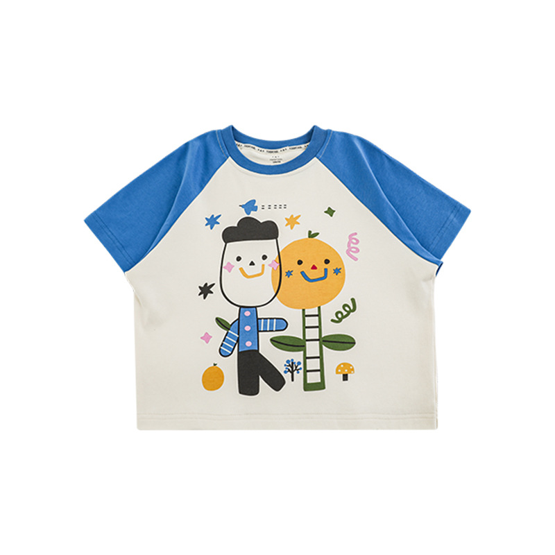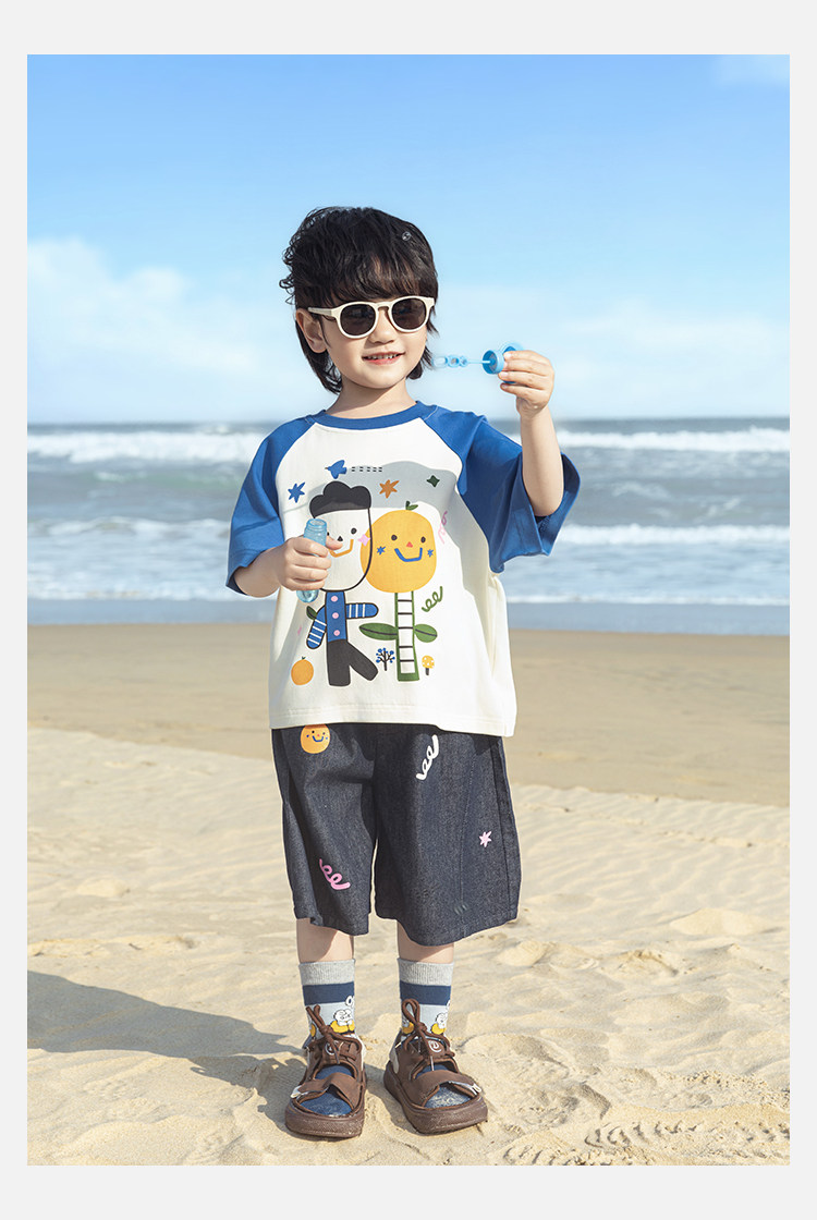 Wurib 소년 2025 세트 새로운 만화 승무원 목 대비 짧은 소매 티셔츠 여름 스트레이트 데님 반바지