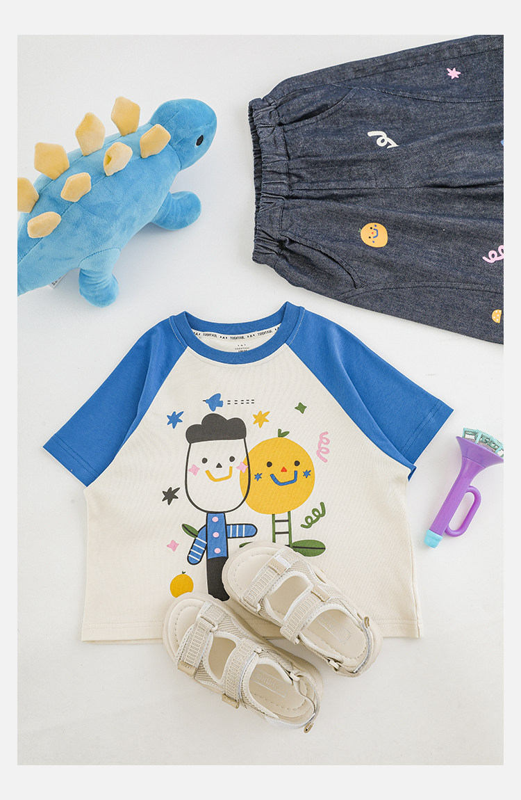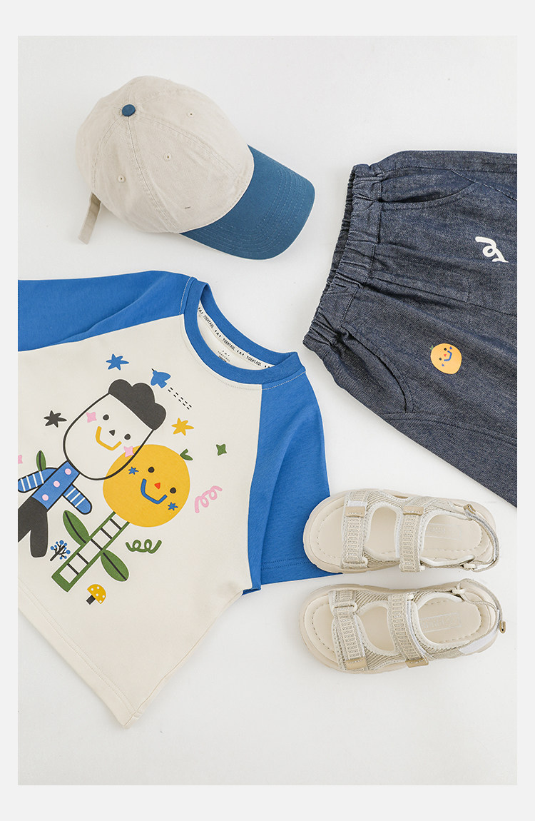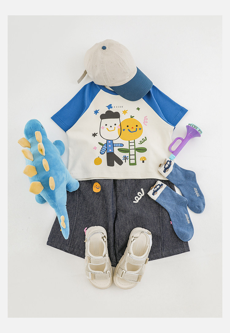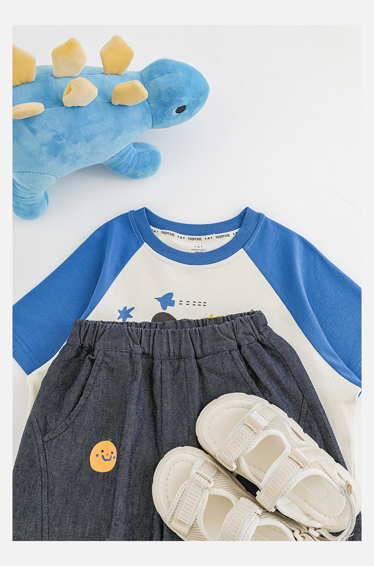 Wurib 소년 2025 세트 새로운 만화 승무원 목 대비 짧은 소매 티셔츠 여름 스트레이트 데님 반바지스토어 가기