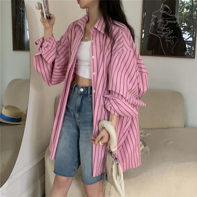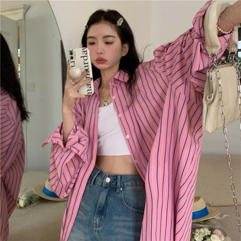 핑크 컬러 스트라이프 셔츠 여성의 봄과 여름 새로운 중간 길이의 느슨한 태양 보호 카디건 올 매치 셔츠 캐주얼 탑스토어 가기