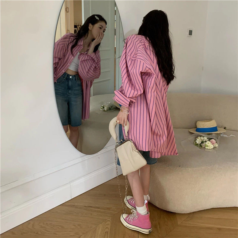 핑크 컬러 스트라이프 셔츠 여성의 봄과 여름 새로운 중간 길이의 느슨한 태양 보호 카디건 올 매치 셔츠 캐주얼 탑