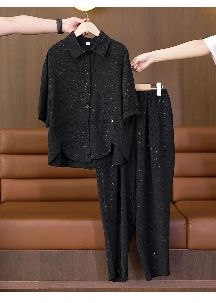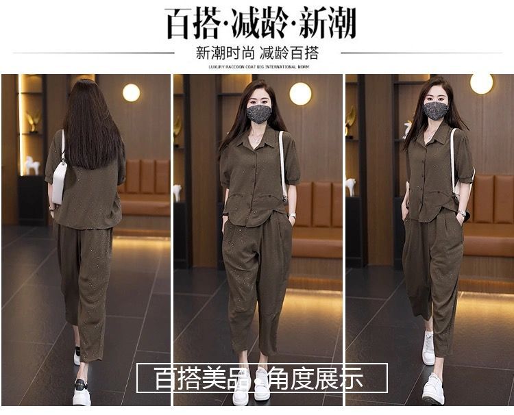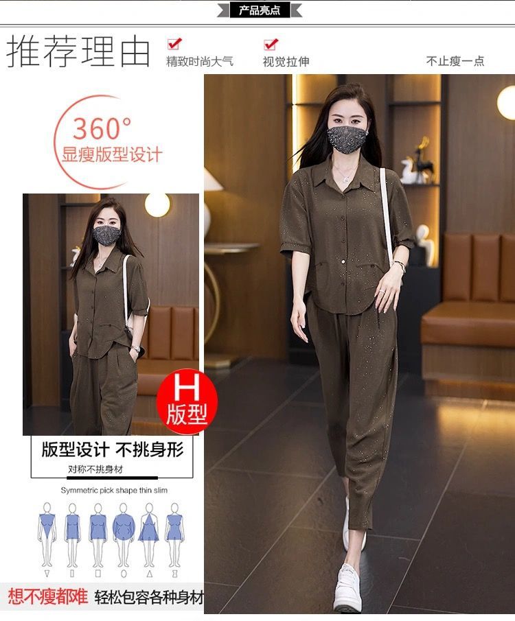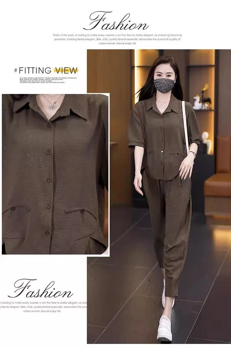 캐주얼 패션 세트 여성 2025 년 여름 새로운 루즈 웨스턴 스타일 고급 플래시 에이지 감소 셔츠 할란 바지 투피스 세트스토어 가기