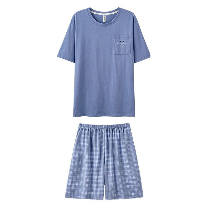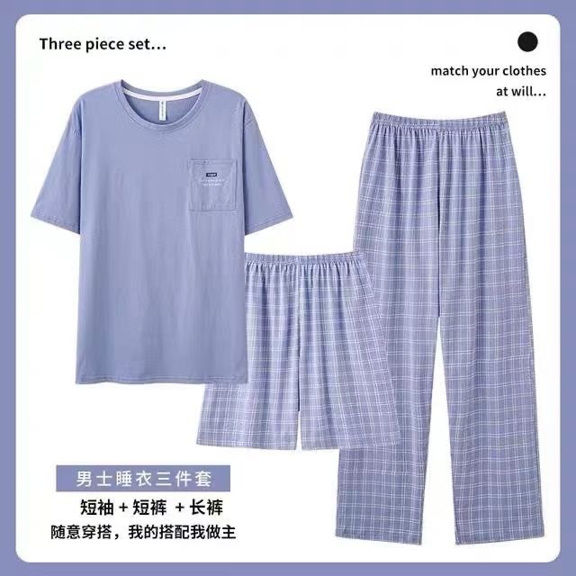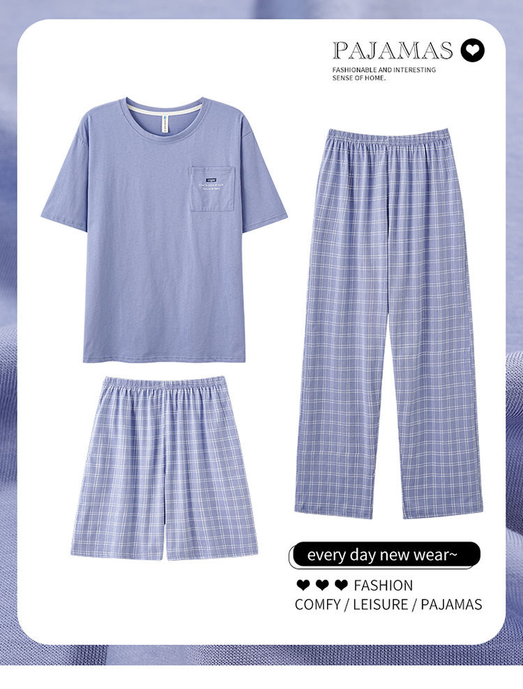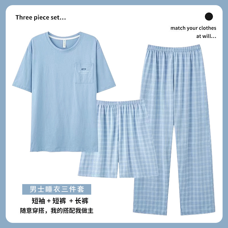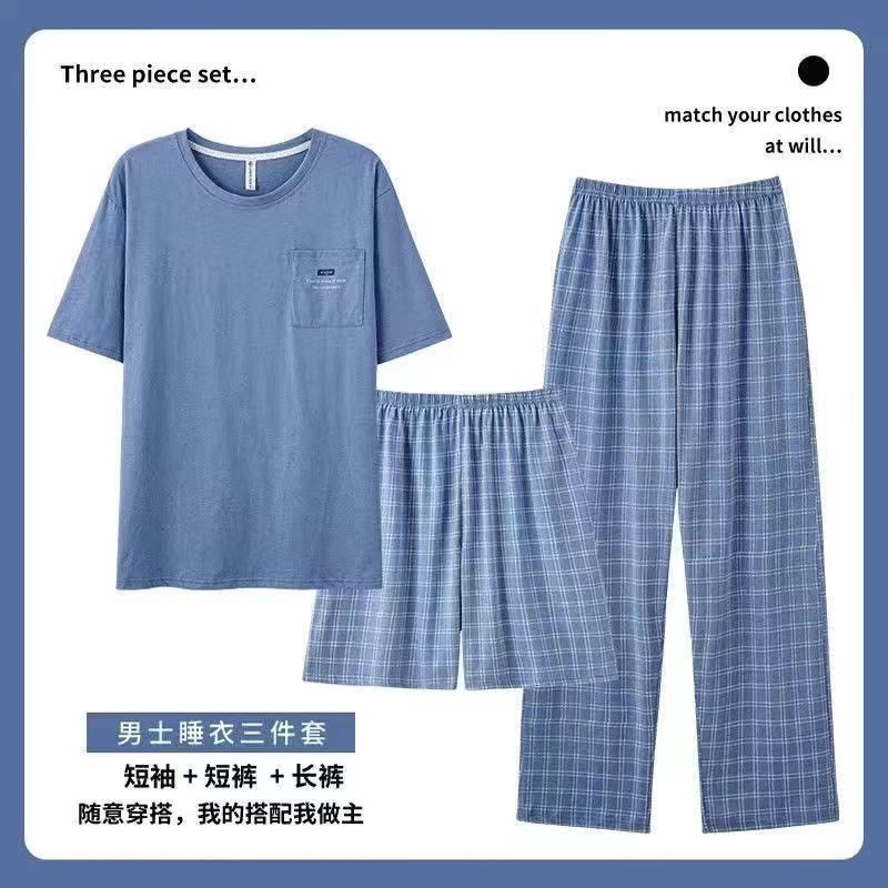 여름 잠옷 남자의 간단한 캐주얼 반팔 바지 3 피스 세트 느슨한 플러스 사이즈 청소년 둥근 목 홈 옷스토어 가기