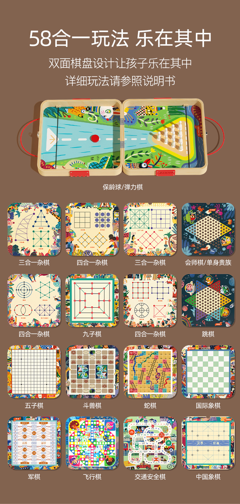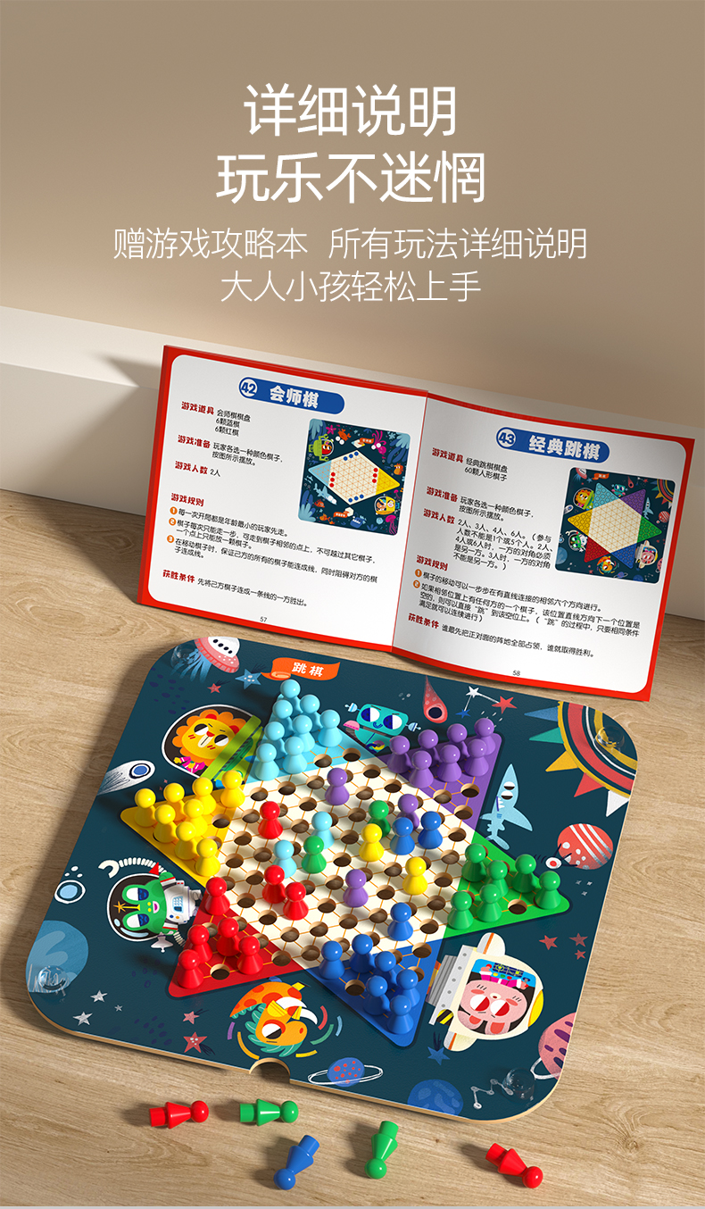 • 플레이 방법 23가지, 유형 A(다섯 조각 비행 중국 장기 뱀 체스 + 야수 싸움 교통 만남 싱글 체커 및 기타 체스 보드 게임) + 카드 놀이 + 사용 설명서
