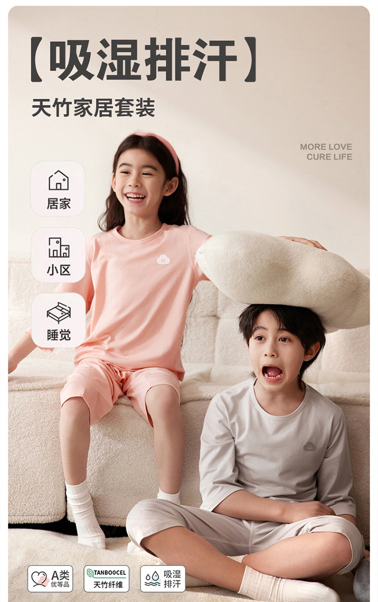 어린이 잠옷 세트 아기 여름 얇은 소년과 소녀 단색 7 소매 홈 옷 대형 어린이 에어컨 옷스토어 가기