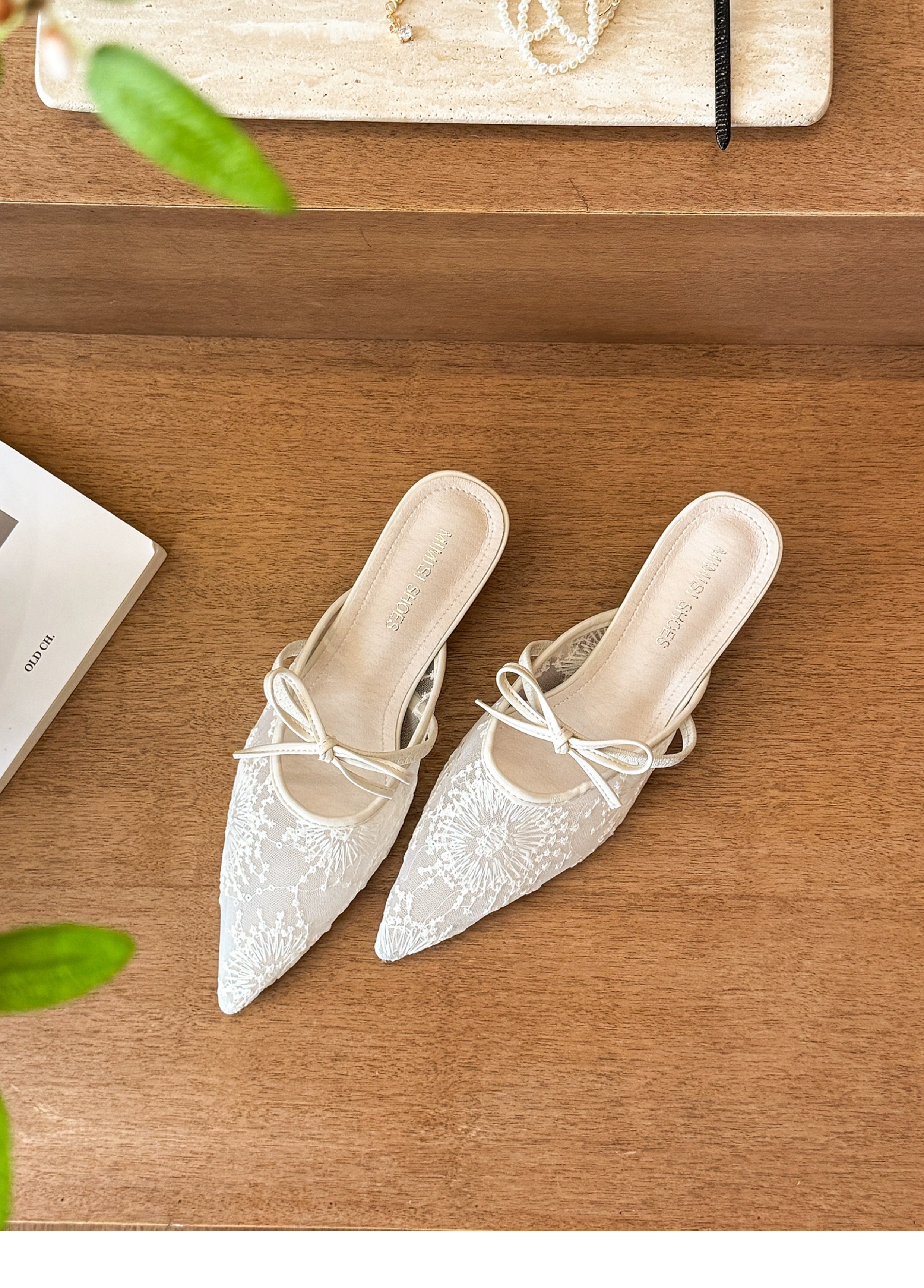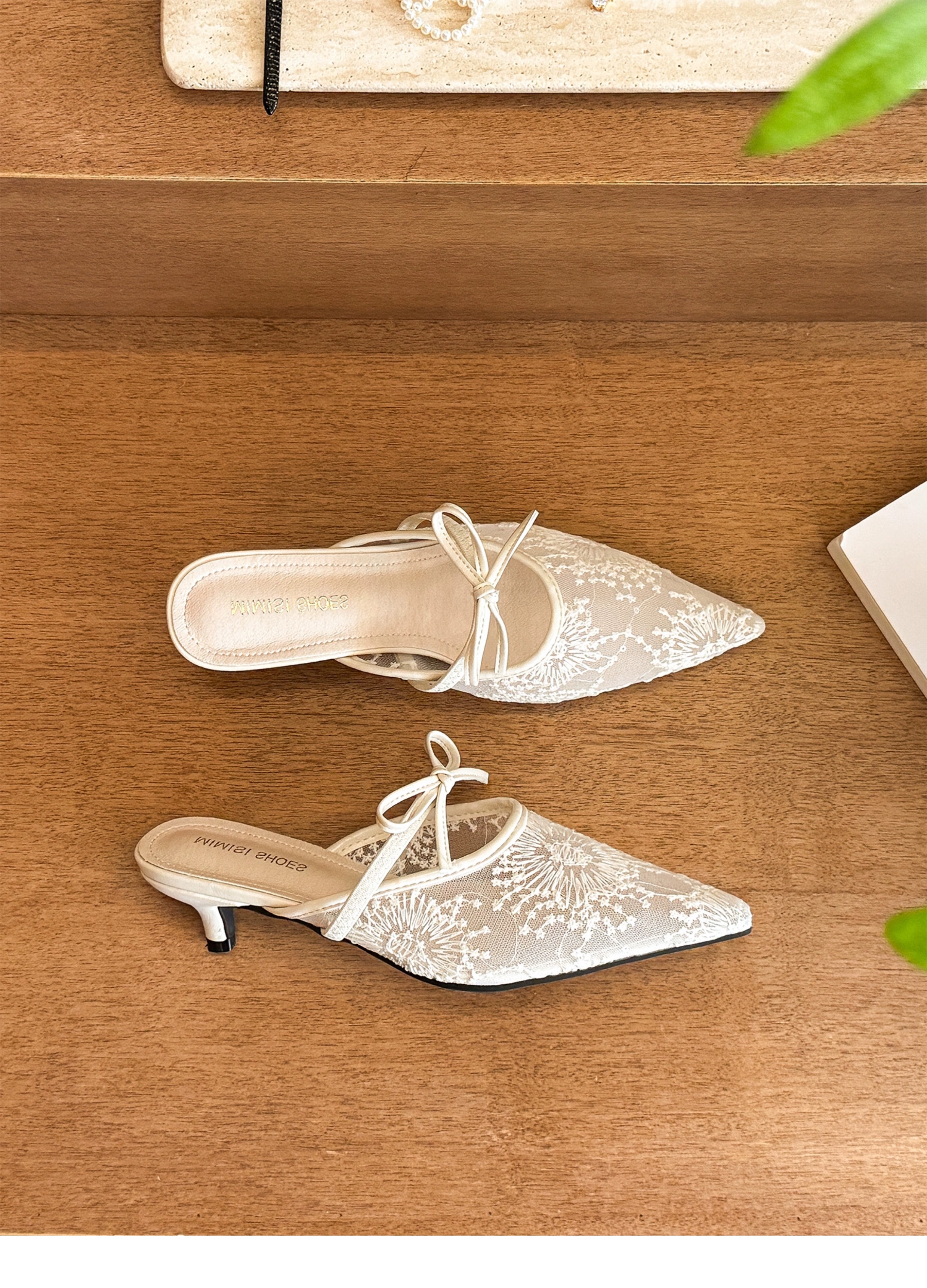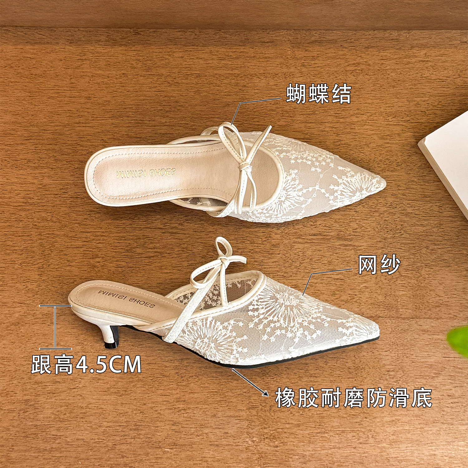 2025 봄 요정! 화이트 메쉬 포인팅 활 하프 드래그 여성 봄 뮬러 하이힐