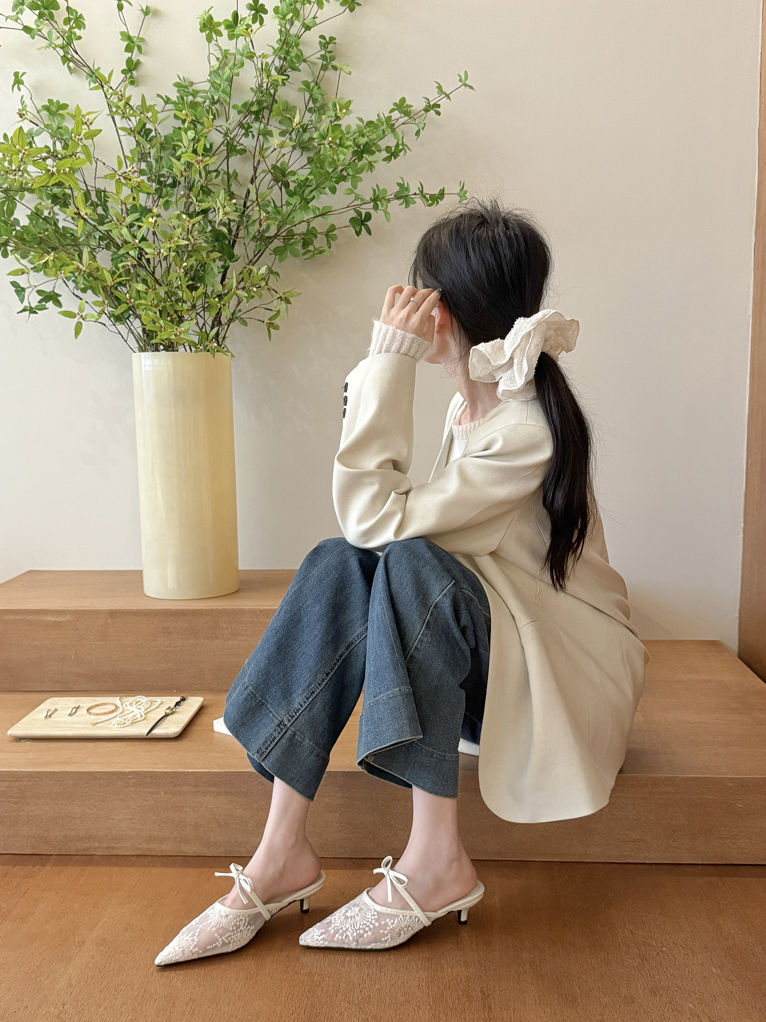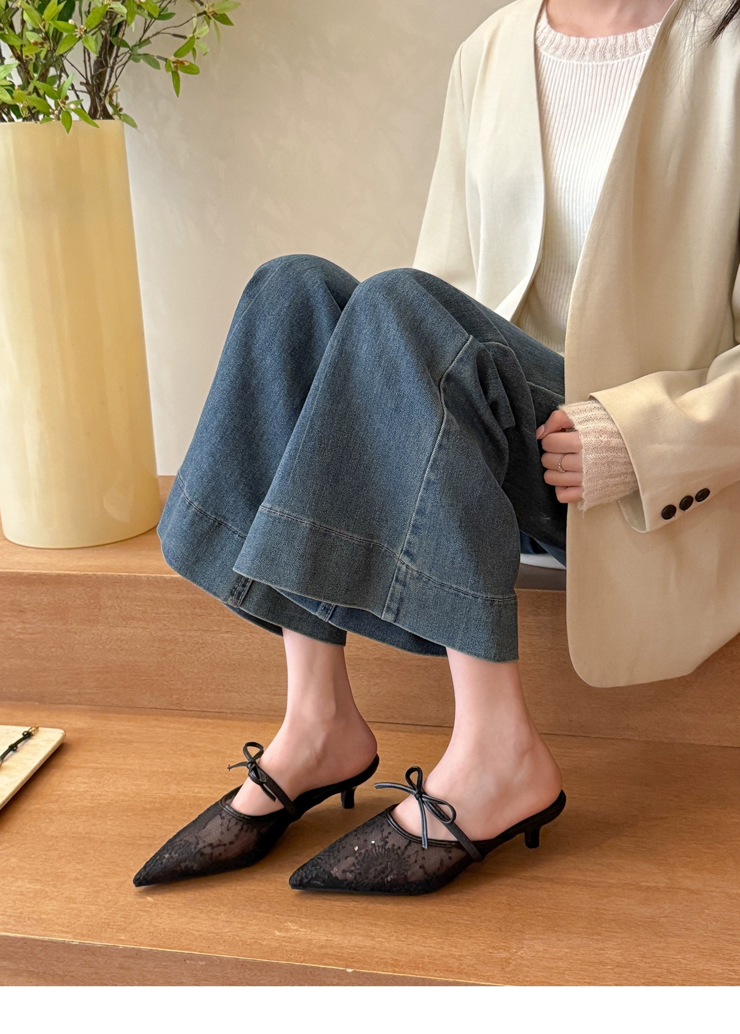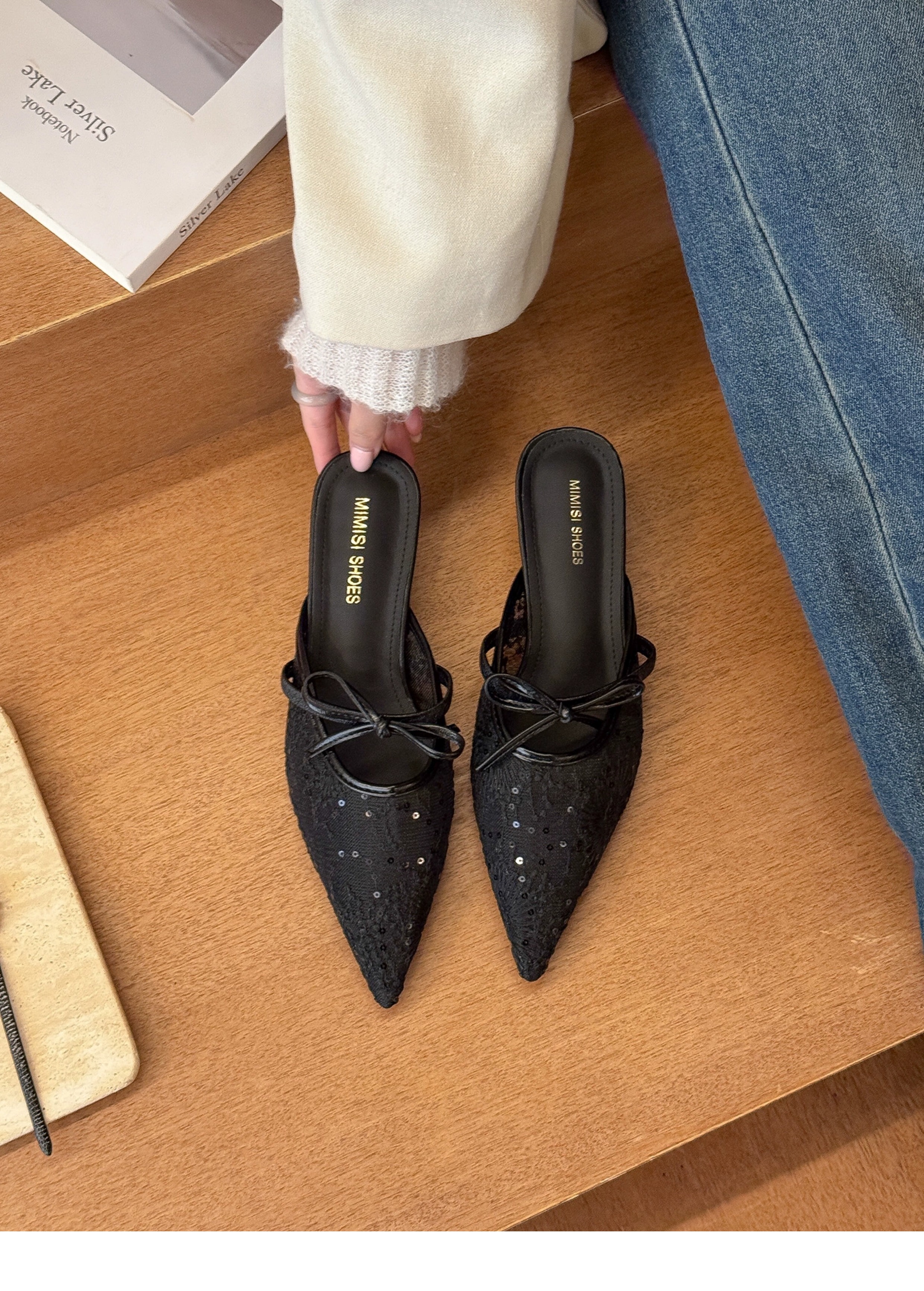 2025 봄 요정! 화이트 메쉬 포인팅 활 하프 드래그 여성 봄 뮬러 하이힐