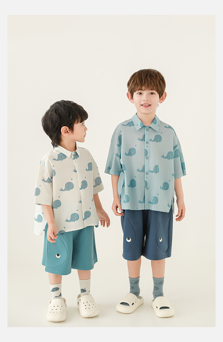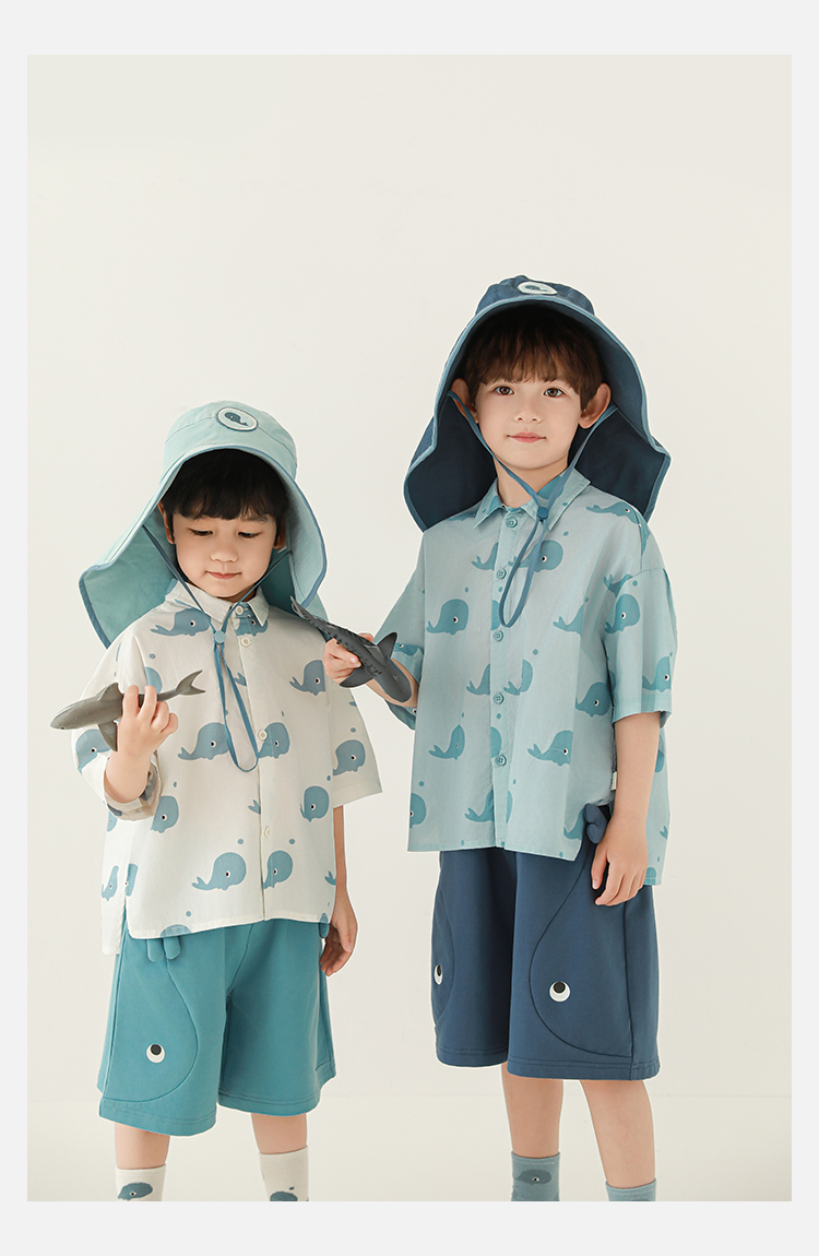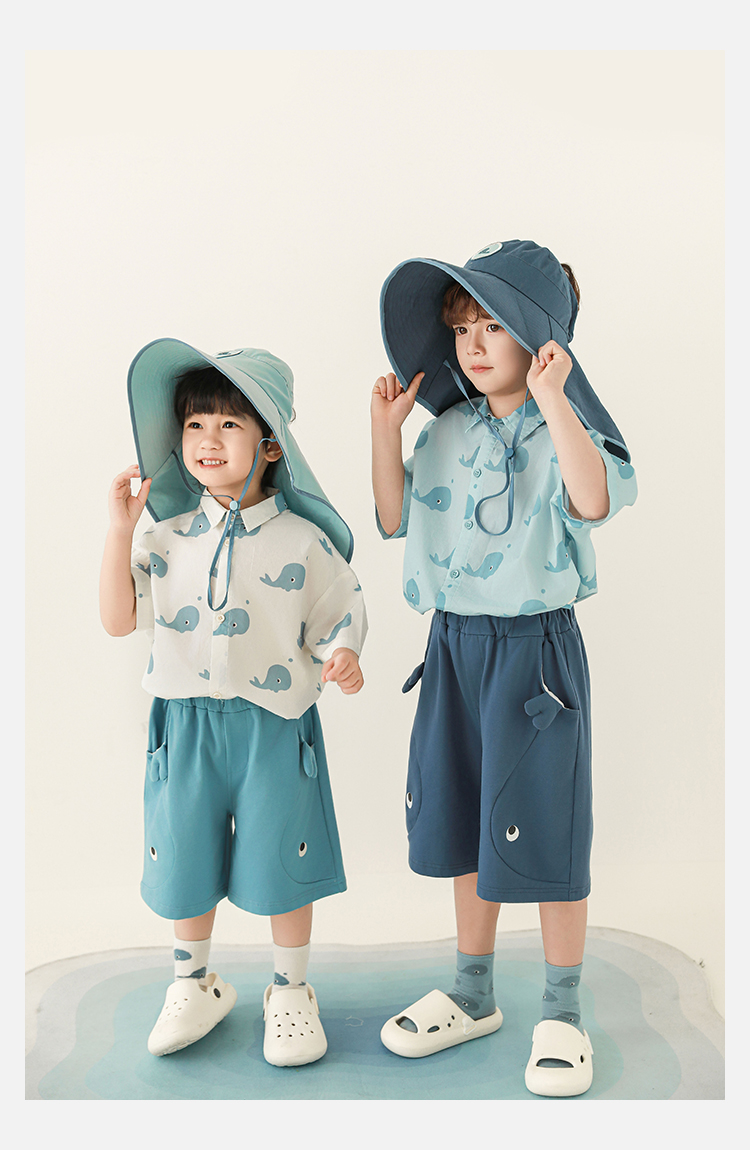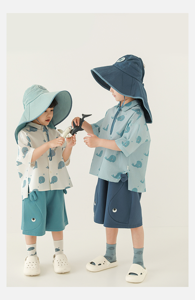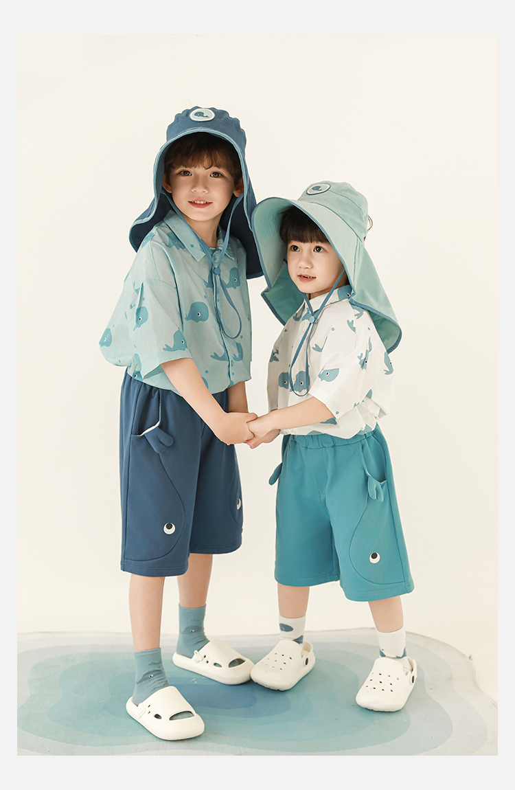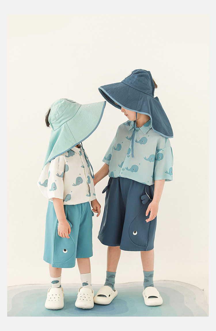 Wurib a boy 2025 새로운 만화 옷깃 짧은 소매 셔츠 패션 반바지 모자 고래 시리즈 세트