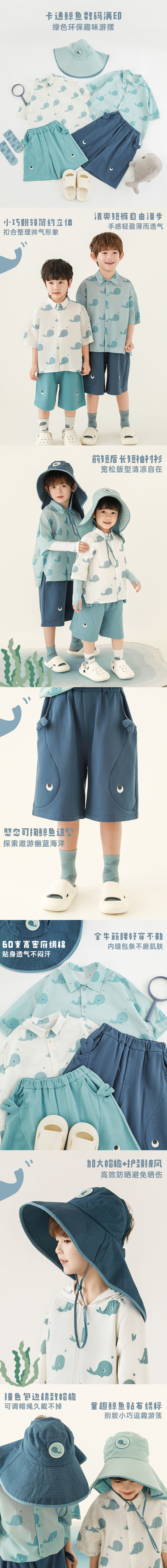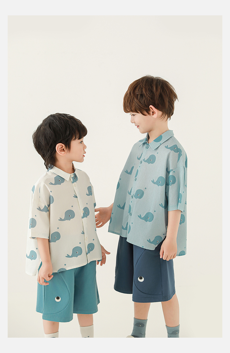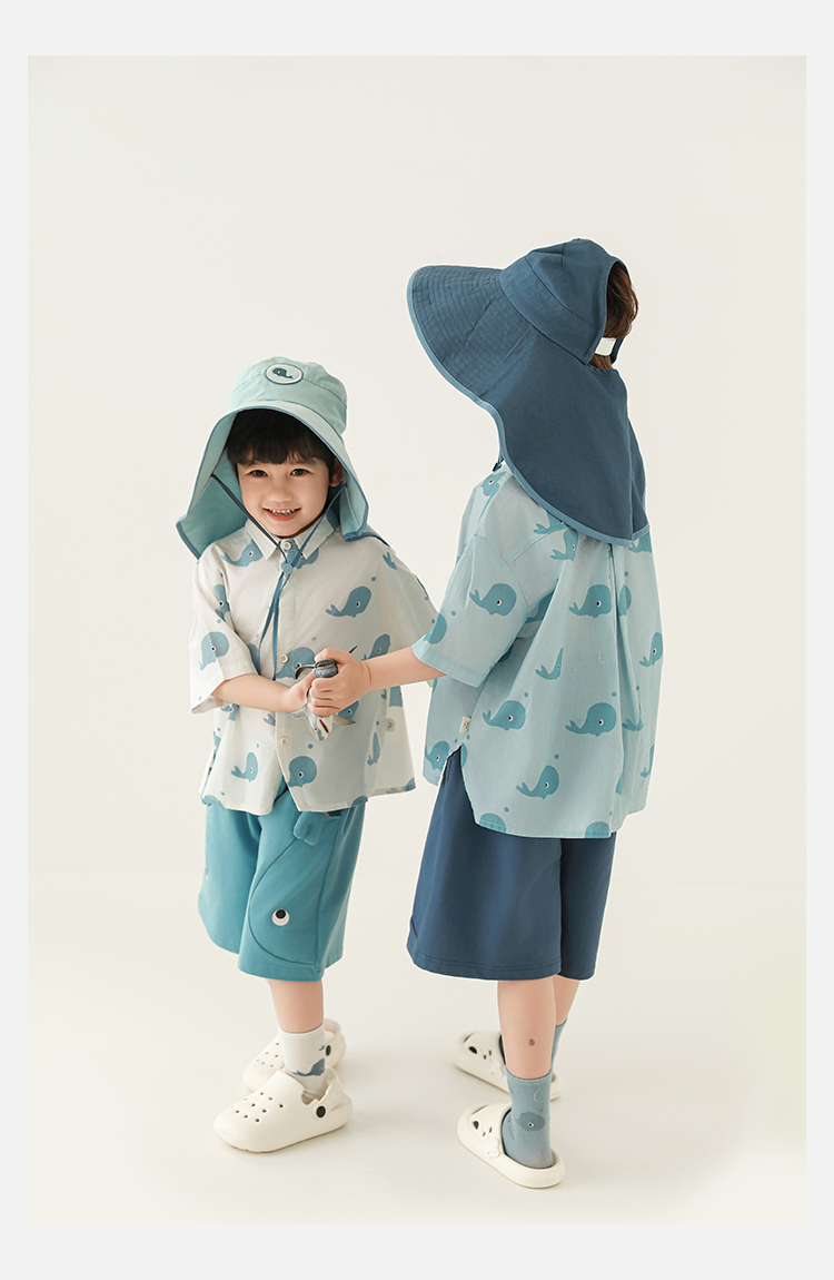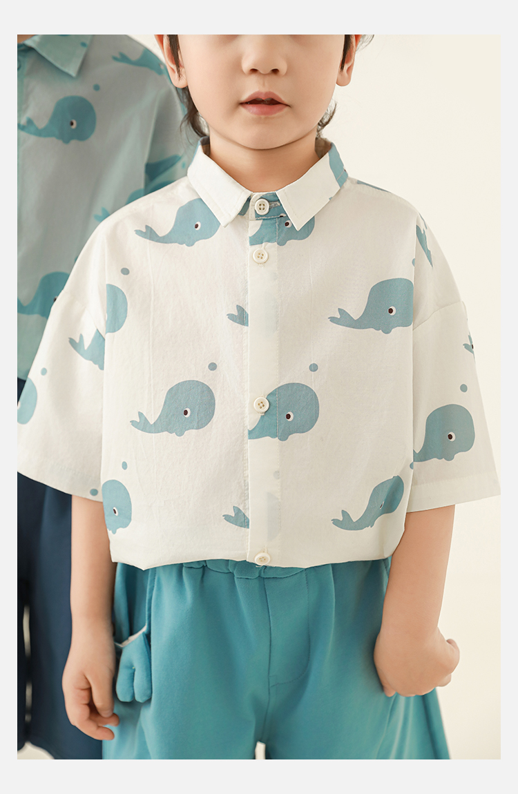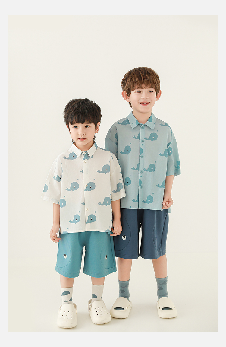 Wurib a boy 2025 새로운 만화 옷깃 짧은 소매 셔츠 패션 반바지 모자 고래 시리즈 세트