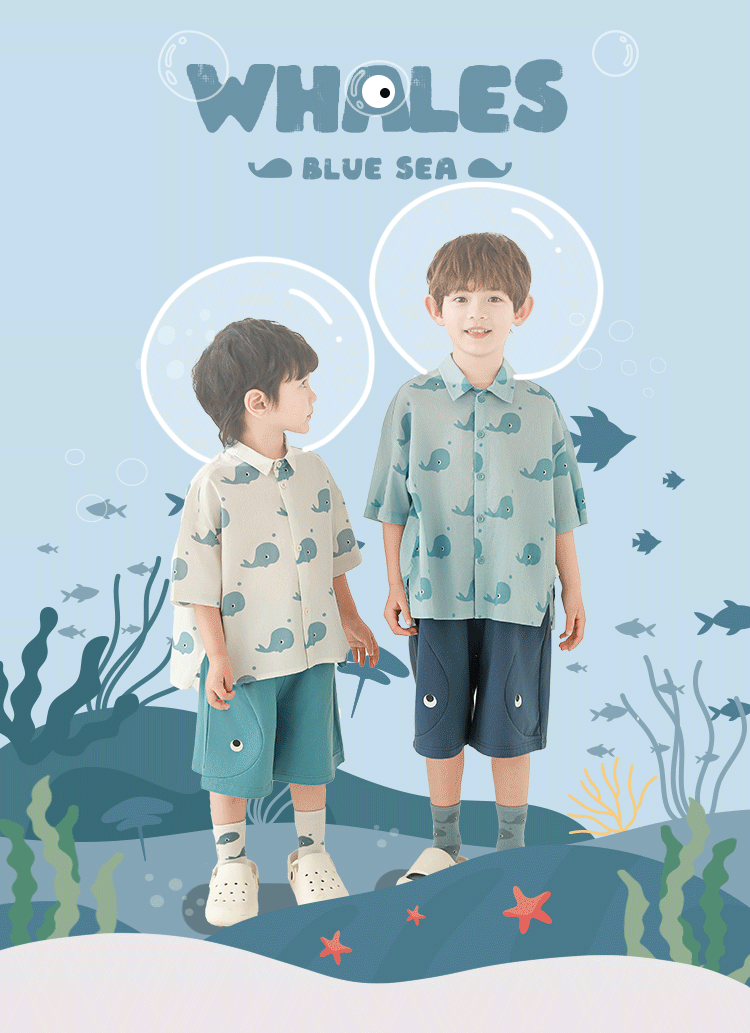 Wurib a boy 2025 새로운 만화 옷깃 짧은 소매 셔츠 패션 반바지 모자 고래 시리즈 세트스토어 가기